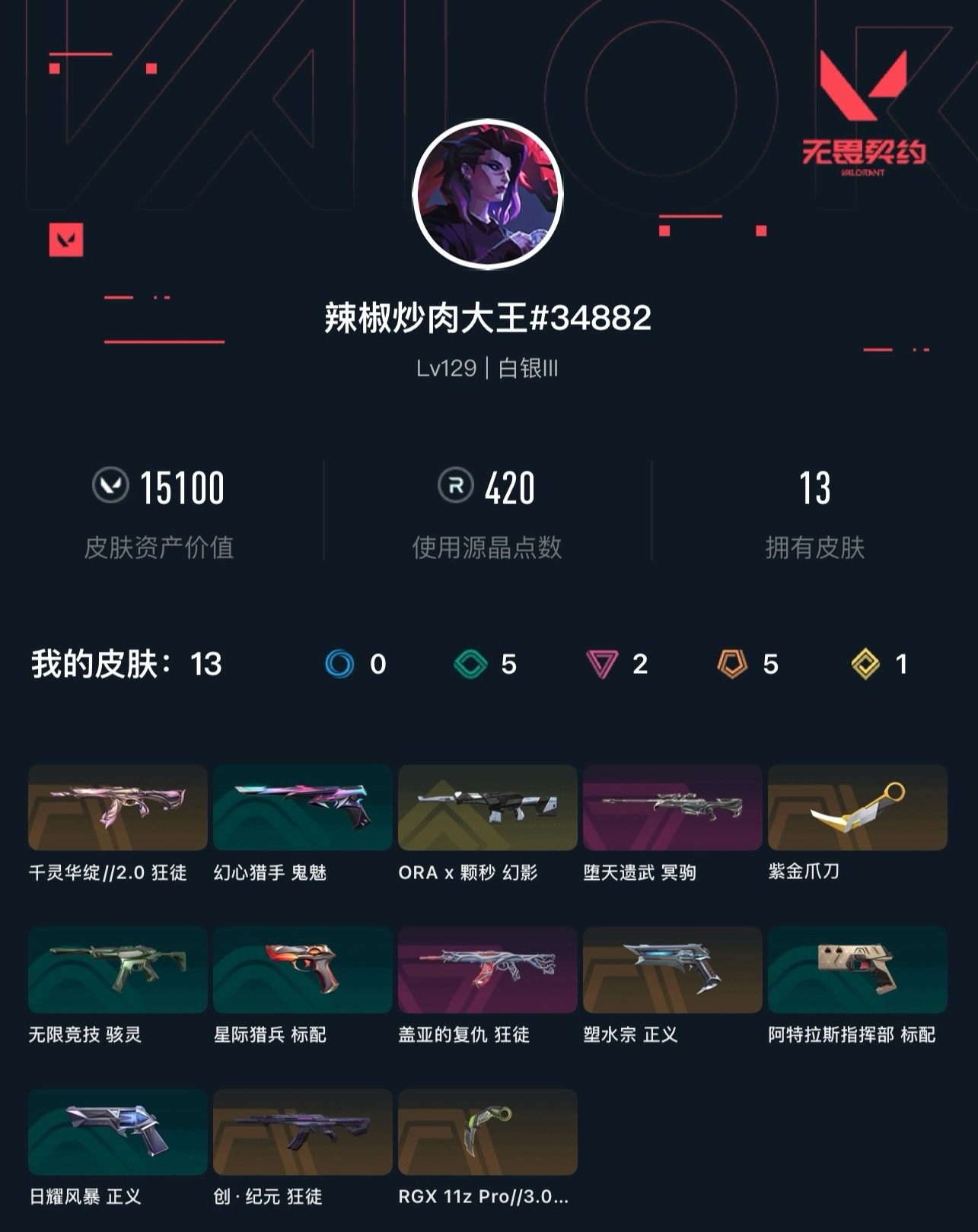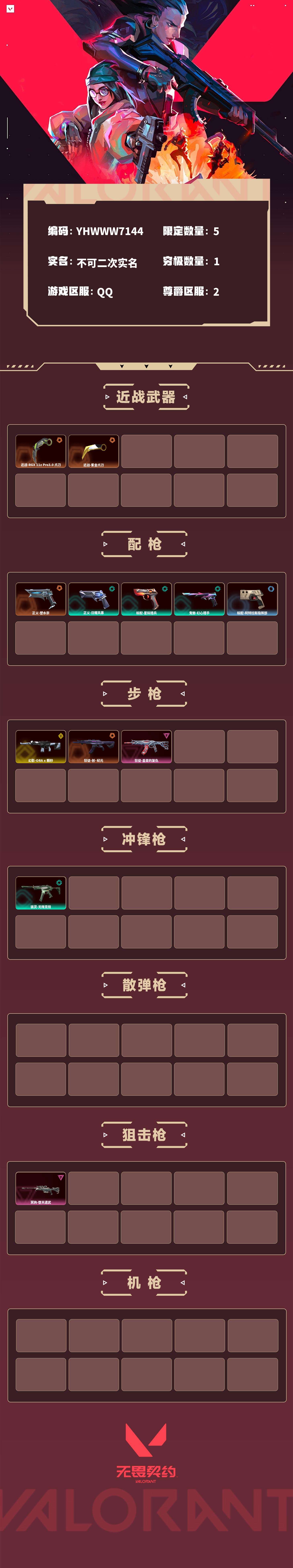 【无畏契约】【yhwww7144】等级:131,已用无畏点15100,已用源晶点420,橙皮:近战-rgx 11z pro3.0 爪刀|近战-紫金爪刀|正义-塑水宗|狂徒-创·纪元__紫皮:狂徒-盖亚的复仇|冥驹-堕天遗武__段位:白银__绿皮:骇灵-无限竞技|正义-日耀风暴|标配-星际猎兵|鬼魅-幻心猎手__蓝皮:标配-阿特拉斯指挥部__英雄:尚勃勒|维斯|黑梦|斯凯|暮蝶|盖可|霓虹|壹决|星礈|k/o|幽影|夜露|钢锁|海神|奇乐|炼狱|铁臂|贤者|猎枭|钛狐|芮娜|零|捷风|蝰蛇|不死鸟|幻棱|雷兹|禁灭__金皮:幻影-a x 颗秒