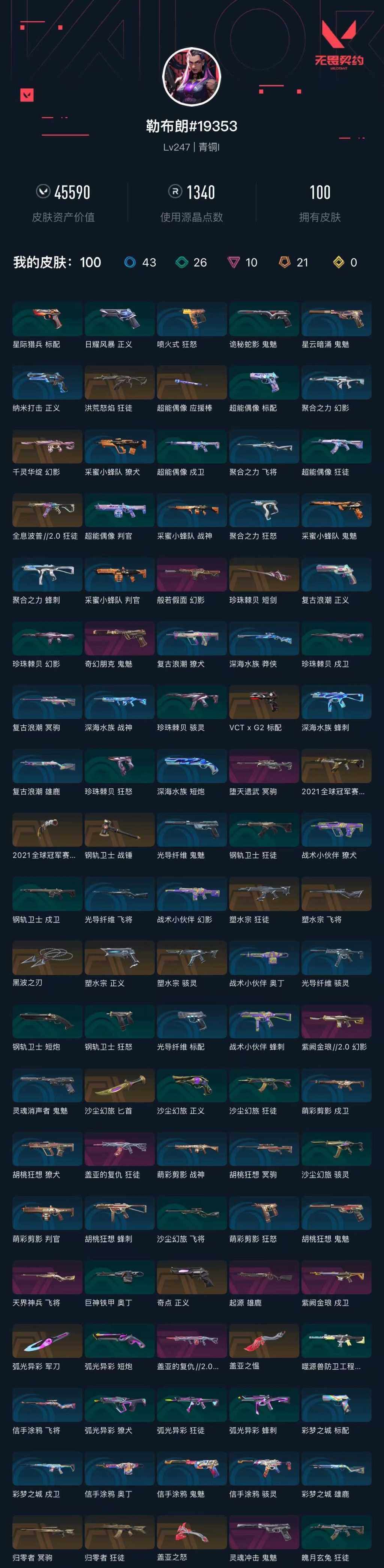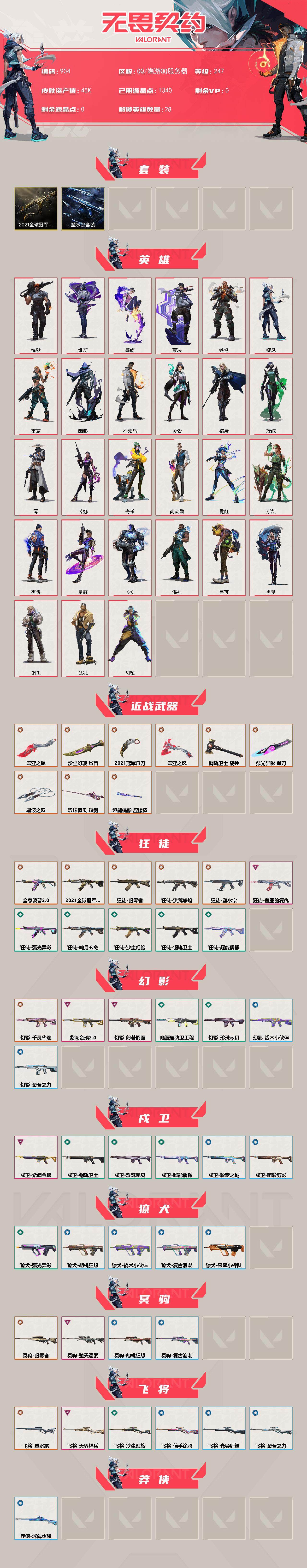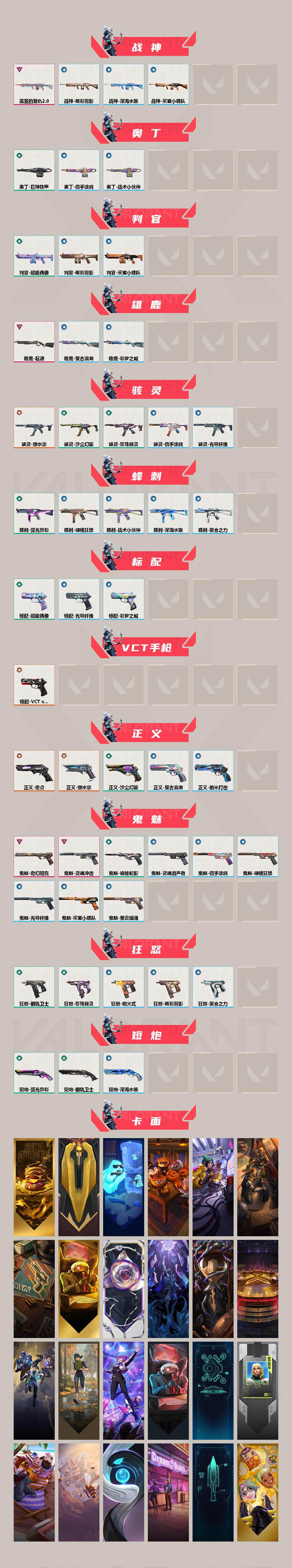 [14638994]【套装】:2021全球冠军赛套装,塑水宗套装 【英雄】:幻棱,炼狱,维斯,暮蝶,钛狐,壹决,铁臂,捷风,雷兹,幽影,不死鸟,贤者,猎枭,蝰蛇,零,芮娜,奇乐,尚勃勒,霓虹,斯凯,夜露,星礈,k/o,海神,盖可,黑梦,钢锁 【近战 武器】:近战武器-2021全球冠军赛 爪刀,近战武器-黑波之刃,近战武器-珍珠棘贝 短剑,近战武器-超能偶像 应援棒,近战武器-盖亚之怒,近战武器-盖亚之愠,近战武器-钢轨卫士 战锤,近战武器-弧光异彩 军刀,近战武器-沙尘幻旅 匕首 【狂徒】:狂徒-2021全球冠军赛,狂徒-归零者,狂徒-洪荒怒焰,狂徒-全息波普//2.0,狂徒-塑水宗,狂徒-盖亚的复仇,狂徒-超能偶像,狂徒-钢轨卫士,狂徒-弧光异彩,狂徒-魄月玄兔,狂徒-沙尘幻旅 【幻影】:幻影-千灵华绽,幻影-般若假面,幻影-紫阙金琅//2.0,幻影-噬源兽防卫工程,幻影-珍珠棘贝,幻影-聚合之力,幻影-战术小伙伴 【戍卫】:戍卫-紫阙金琅,戍卫-超能偶像,戍卫-钢轨卫士,戍卫-珍珠棘贝,戍卫-彩梦之城,戍卫-萌彩剪影 【獠犬】:獠犬-弧光异彩,獠犬-采蜜小蜂队,獠犬-复古浪潮,獠犬-胡桃狂想,獠犬-战术小伙伴 【冥驹】:冥驹-归零者,冥驹-堕天遗武,冥驹-复古浪潮,冥驹-胡桃狂想 【飞将】:飞将-塑水宗,飞将-天界神兵,飞将-沙尘幻旅,飞将-聚合之力,飞将-信手涂鸦,飞将-光导纤维 【莽侠】:莽侠-深海水族 【战神】:战神-盖亚的复仇//2.0,战神-采蜜小蜂队,战神-萌彩剪影,战神-深海水族 【奥丁】:奥丁-巨神铁甲,奥丁-信手涂鸦,奥丁-战术小伙伴 【判官】:判官-超能偶像,判官-采蜜小蜂队,判官-萌彩剪影 【雄鹿】:雄鹿-起源,雄鹿-彩梦之城,雄鹿-复古浪潮 【骇灵】:骇灵-塑水宗,骇灵-沙尘幻旅,骇灵-珍珠棘贝,骇灵-光导纤维,骇灵-信手涂鸦 【蜂刺】:蜂刺-弧光异彩,蜂刺-胡桃狂想,蜂刺-聚合之力,蜂刺-深海水族,蜂刺-战术小伙伴 【标配】:标配-超能偶像,标配-彩梦之城,标配-光导纤维 【vct手呛】:标配-vct x g2 【正义】:正义-奇点,正义-塑水宗,正义-沙尘幻旅,正义-复古浪潮,正义-纳米打击 【鬼魅】:鬼魅-灵魂冲击,鬼魅-奇幻朋克,鬼魅-诡秘蛇影,鬼魅-采蜜小蜂队,鬼魅-光导纤维,鬼魅-胡桃狂想,鬼魅-灵魂消声者,鬼魅-信手涂鸦,鬼魅-星云暗涌 【狂