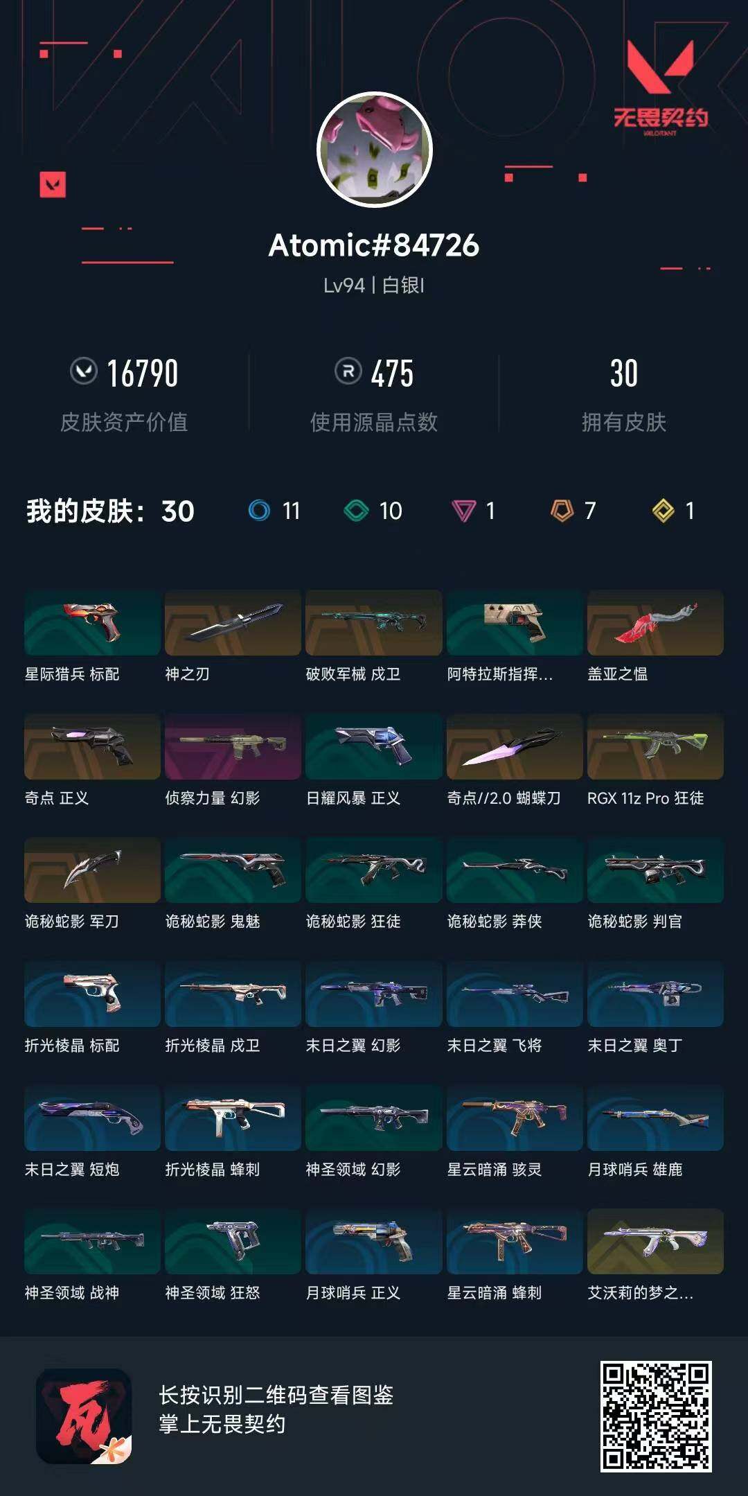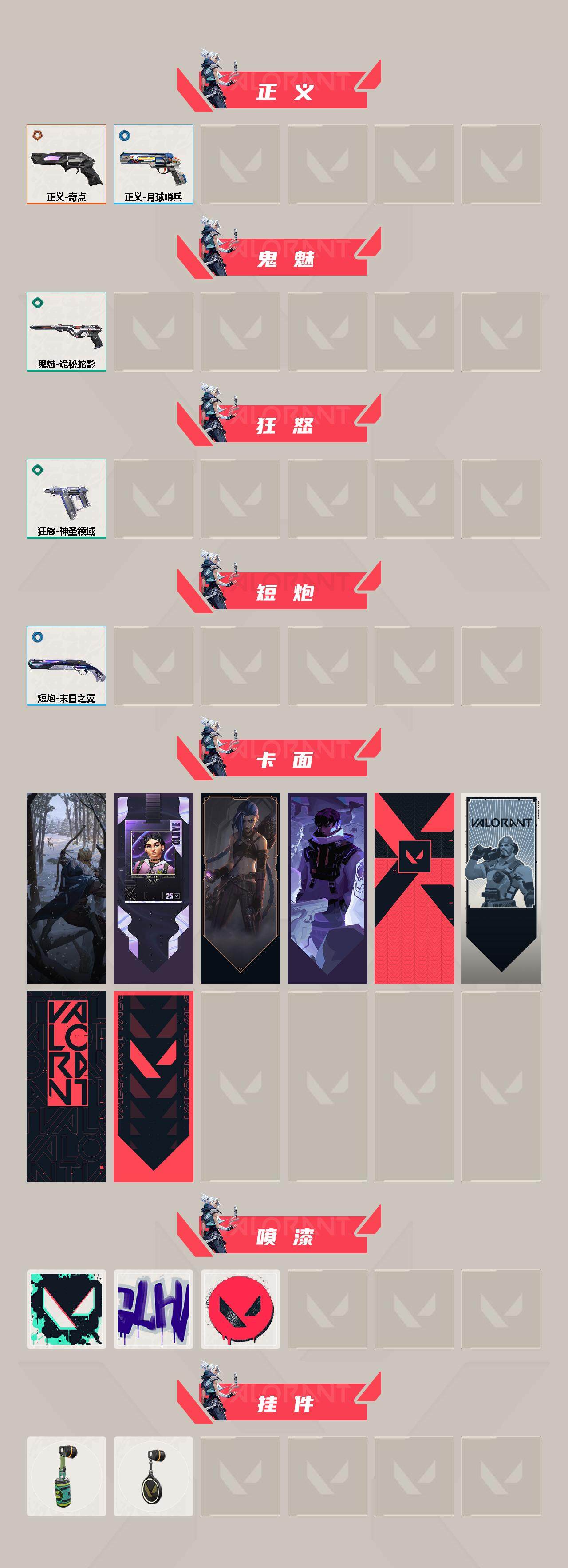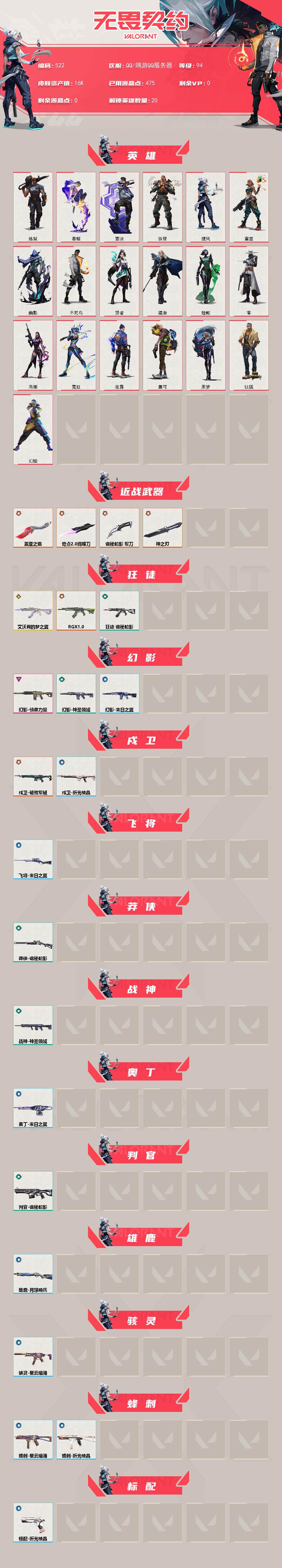 [14639134]【英雄】:幻棱,炼狱,暮蝶,钛狐,壹决,铁臂,捷风,雷兹,幽影,不死鸟,贤者,猎枭,蝰蛇,零,芮娜,霓虹,夜露,盖可,黑梦 【近战 武器】:近战武器-神之刃,近战武器-奇点//2.0 蝴蝶刀,近战武器-盖亚之愠,近战武器-诡秘蛇影 军刀 【狂徒】:狂徒-艾沃莉的梦之翼,狂徒-rgx 11z pro,狂徒-诡秘蛇影 【幻影】:幻影-侦察力量,幻影-神圣领域,幻影-末日之翼 【戍卫】:戍卫-破败军械,戍卫-折光棱晶 【飞将】:飞将-末日之翼 【莽侠】:莽侠-诡秘蛇影 【战神】:战神-神圣领域 【奥丁】:奥丁-末日之翼 【判官】:判官-诡秘蛇影 【雄鹿】:雄鹿-月球哨兵 【骇灵】:骇灵-星云暗涌 【蜂刺】:蜂刺-星云暗涌,蜂刺-折光棱晶 【标配】:标配-折光棱晶 【正义】:正义-奇点,正义-月球哨兵 【鬼魅】:鬼魅-诡秘蛇影 【狂怒】:狂怒-神圣领域 【短炮】:短炮-末日之翼 【卡面】:钢弓与箭弦 卡面,暮蝶工牌 卡面,《双城之战》金克丝 卡面,逆向独行 卡面 ,代号红色 卡面,新兵报到 卡面,v契约 卡面,无畏契约 卡面 【喷漆】:胜利属于无畏契约 喷漆,glhf 喷漆,无畏契约 喷漆 【挂饰】:z世代特饮 挂饰,无畏契约 纪念币 挂饰