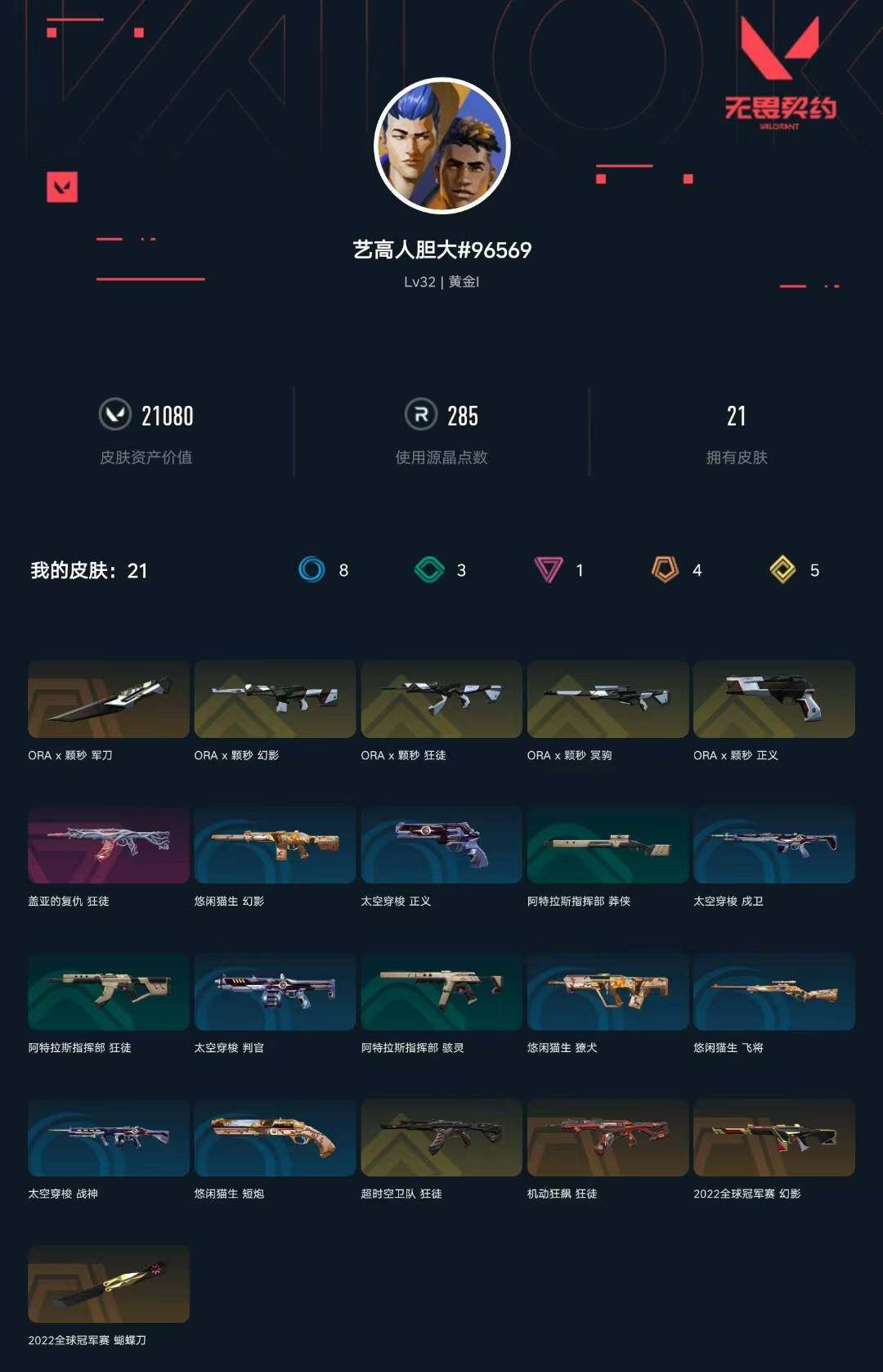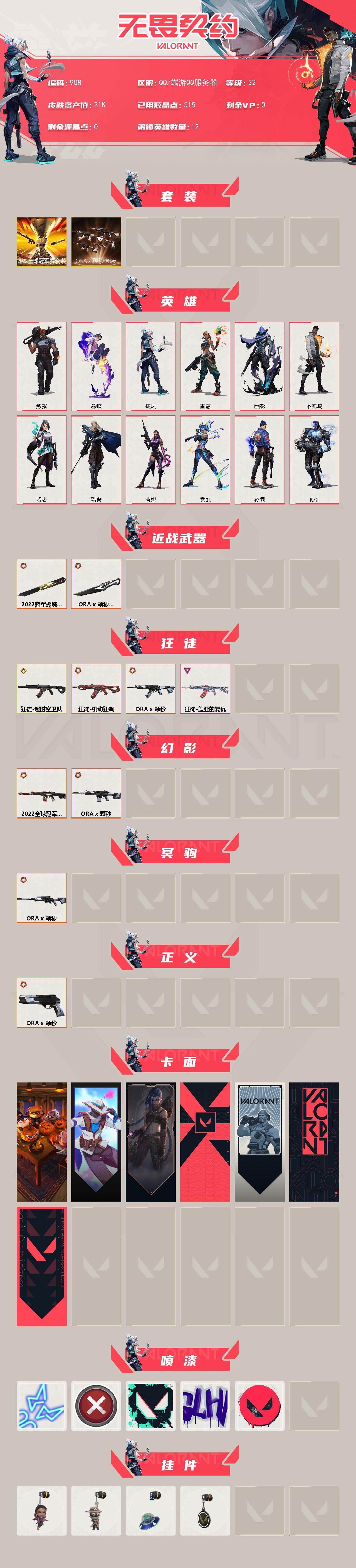 [14640091]【套装】:2022全球冠军赛套装,a x 颗秒套装 【英雄】:炼狱,暮蝶,捷风,雷兹,幽影,不死鸟,贤者,猎枭,芮娜,霓虹,夜露,k/o 【近战 武器】:近战武器-2022全球冠军赛 蝴蝶刀,近战武器-a x 颗秒 军刀 【狂徒】:狂徒-超时空卫队,狂徒-机动狂飙,狂徒-a x 颗秒,狂徒-盖亚的复仇 【幻影】:幻影-2022全球冠军赛,幻影-a x 颗秒 【冥驹】:冥驹-a x 颗秒 【正义】:正义-a x 颗秒 【卡面】:南瓜盛典 卡面,无畏契约go!第一卷:零 卡面,《双城之战》金克丝 卡面,代号红色 卡面,新兵报到 卡面,v契约 卡面,无畏契约 卡面 【喷漆】:霓光四射 喷漆,买装还是存钱 喷漆,胜利属于无畏契约 喷漆,glhf 喷漆,无畏契约 喷漆 【挂饰】:无畏契约go!第一卷 芮娜 挂饰,无畏契约go!第一卷 零 挂饰,天外飞客 挂饰,无畏契约 纪念币 挂饰
