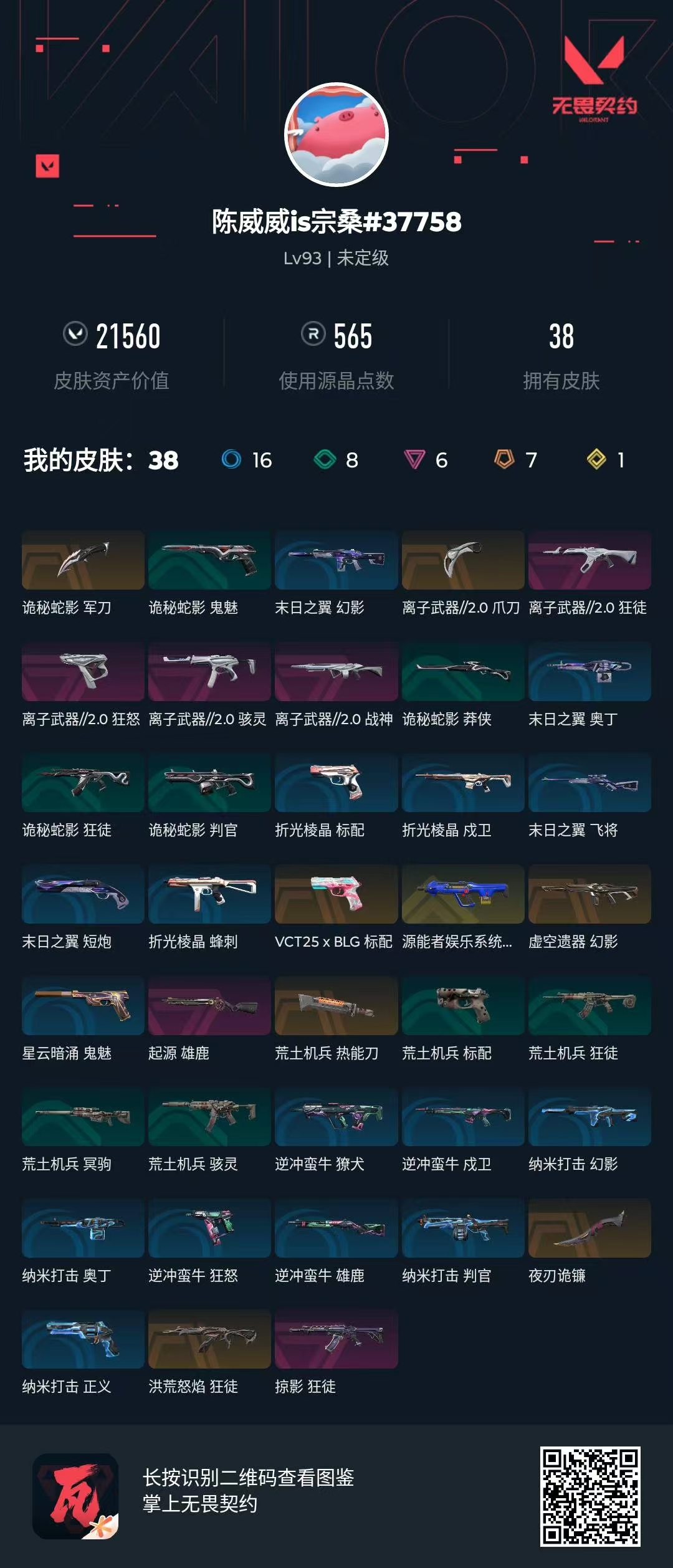 [14644089]q191108 (离子武器//2.0套装)无畏契约/等级93/段位未定级/英雄16/皮肤38/资产21560/已使用r点565/剩余r点95/离子武器//2.0-狂徒离子武器//2.0-战神离子武器//2.0-骇灵离子武器//2.0-狂怒离子武器//2.0-爪刀,诡秘蛇影-军刀,荒土机兵-热能刀,夜刃诡镰,虚空遗器-幻影,洪荒怒焰-狂徒,源能者娱乐系统-獠犬,掠影-狂徒,起源-雄鹿,vct25-x-blg-标配