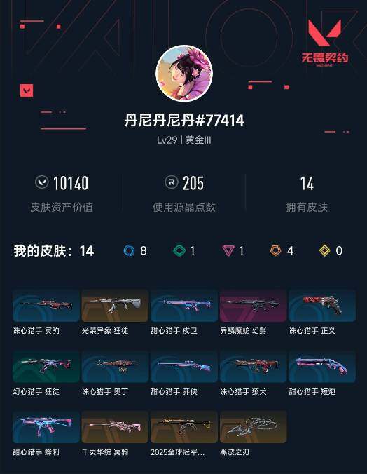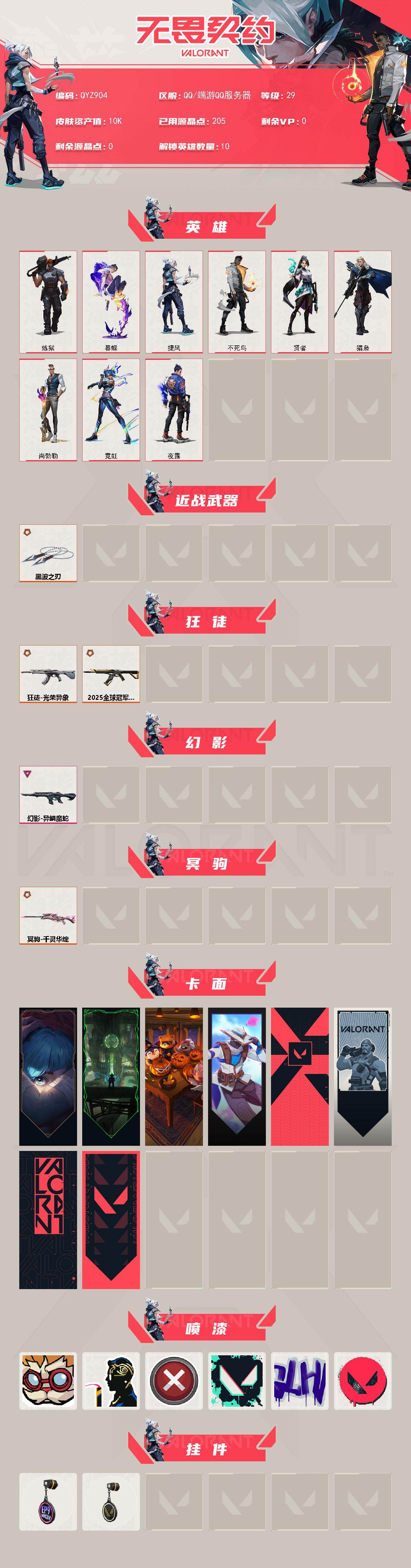 【qyz904】终极4/卓越1/皮肤14/等级29/段位:黄金/炼狱/暮蝶/捷风/不死鸟/贤者/猎枭/尚勃勒/霓虹/夜露/近战武器-黑波之刃/狂徒-2025全球冠军赛/狂徒-光荣异象/幻影-异鳞魔蛇/冥驹-千灵华绽/《双城之战》拥抱 卡面/欢迎来到底城 卡面/南瓜盛典 卡面/无畏契约go!第一卷:零 卡面/代号红色 卡面/新兵报到 卡面/v契约 卡面/无畏契约 卡面/都算到了 喷漆/致命优雅 喷漆/买装还是存钱 喷漆/胜利属于无畏契约 喷漆/glhf 喷漆/无畏契约 喷漆/第九季//第三幕 纪念币 挂饰/无畏契约 纪念币 挂饰