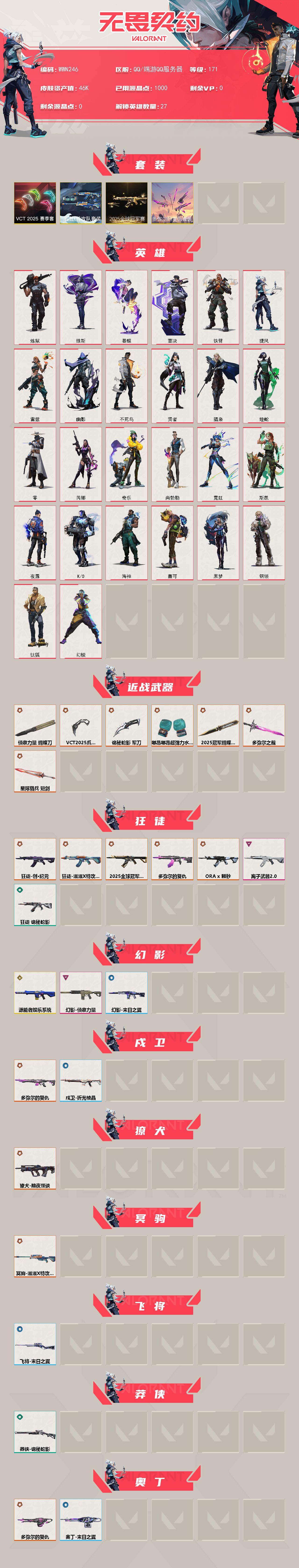 【wwn246】终极20/传奇3/卓越4/皮肤64/等级171/段位:超凡/2025全球冠军赛套装/多弥尔的复仇套装/滋滋x特工队/vct 2025 赛季/幻棱/炼狱/维斯/暮蝶/钛狐/壹决/铁臂/捷风/雷兹/幽影/不死鸟/贤者/猎枭/蝰蛇/零/芮娜/奇乐/尚勃勒/霓虹/斯凯/夜露/k/o/海神/盖可/黑梦/钢锁/近战武器-2025全球冠军赛 蝴蝶刀/近战武器-多弥尔之裁/近战武器-