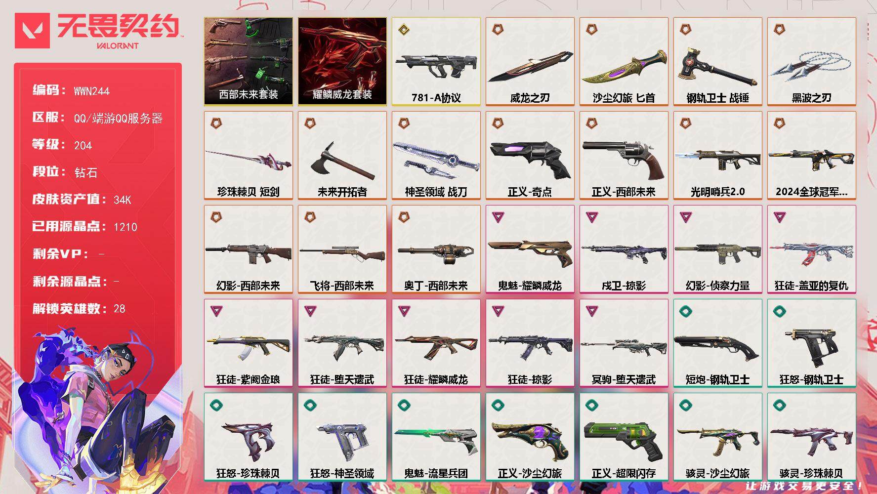 【wwn244】终极14/传奇1/卓越9/皮肤79/等级204/段位:钻石/西部未来/耀鳞威龙/幻棱/炼狱/维斯/暮蝶/钛狐/壹决/铁臂/捷风/雷兹/幽影/不死鸟/贤者/猎枭/蝰蛇/零/芮娜/奇乐/尚勃勒/霓虹/斯凯/夜露/星礈/k/o/海神/盖可/黑梦/钢锁/黑波之刃/威龙之刃/未来开拓者/珍珠棘贝-短剑/钢轨卫士-战锤/沙尘幻旅-匕首/神圣领域 战刀/狂徒-堕天遗武/掠影-狂徒/