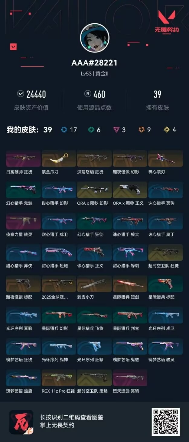 [14608735]9橙皮 4金皮 3紫皮 39皮肤 15英雄 39卡面 460已用源晶 黄金段位 【近战武器皮肤】:星际猎兵 短剑碎心裂刃剥皮小刀紫金爪刀 【佩呛皮肤】:标配-黯夜怪谈鬼魅-超时空卫队正义-ax颗秒 【冲锋呛皮肤】:骇灵-侦察力量 【步呛皮肤】:幻影-黯夜怪谈狂徒-rgx 11z pro幻影-ax颗秒2025全球冠军赛 狂徒狂徒-超时空卫队狂徒-洪荒怒焰狂徒-日冕雄师 【狙击呛皮肤】:冥驹-堕天遗武