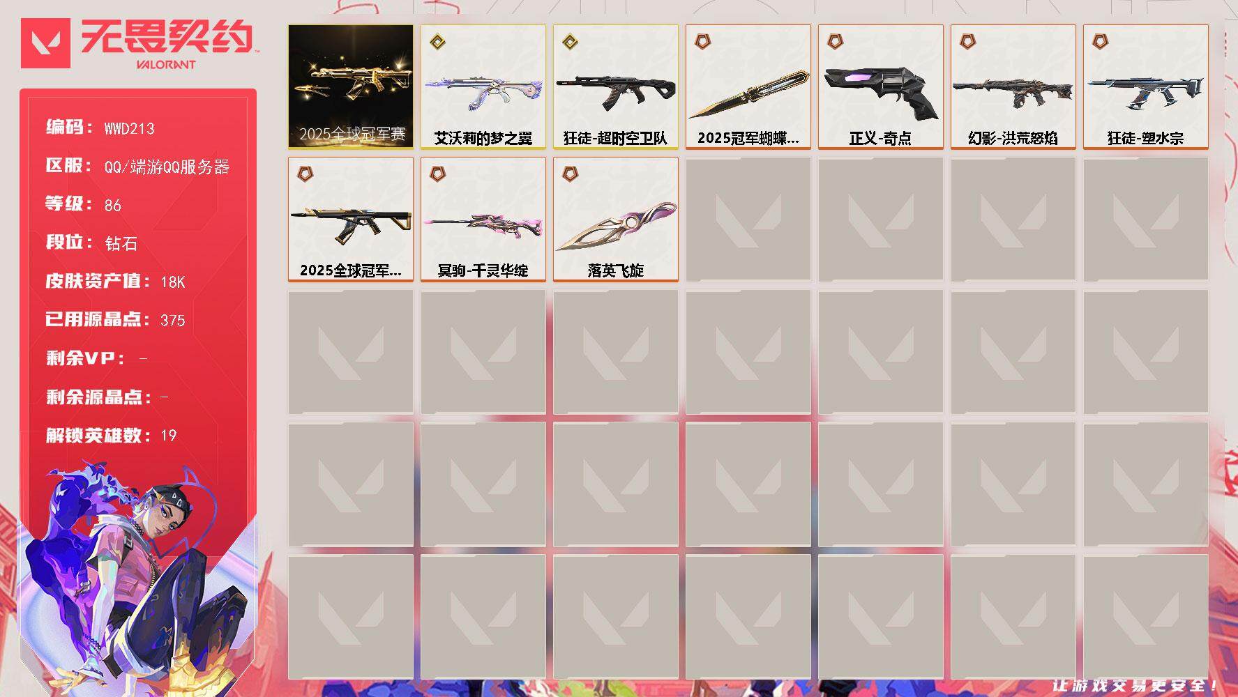 【wwd213】终极7/传奇2/皮肤12/等级86/段位:钻石/2025全球冠军赛套装/幻棱/炼狱/暮蝶/钛狐/壹决/铁臂/捷风/雷兹/幽影/不死鸟/贤者/猎枭/零/芮娜/奇乐/尚勃勒/霓虹/k/o/钢锁/近战武器-2025全球冠军赛 蝴蝶刀/近战武器-落英飞旋/狂徒-艾沃莉的梦之翼/狂徒-超时空卫队/狂徒-2025全球冠军赛/狂徒-塑水宗/幻影-洪荒怒焰/冥驹-千灵华绽/正义-奇点/南瓜盛典 卡面/热舞环节 卡面/树懒大作战 卡面/红鳞松叶 卡面/clutch 卡面/无畏契约go!第一卷:芮娜 卡面/无畏契约go!第一卷:零 卡面/无垠星环 卡面/《双城之战》金克丝 卡面/别冒尖 卡面/夯实根基 卡面/代号红色 卡面/新兵报到 卡面/v契约 卡面/无畏契约 卡面/买装还是存钱 喷漆/关门放狗 喷漆/酷熊冲浪 喷漆/暴走萝莉 喷漆/放下武器 喷漆/胜利属于无畏契约 喷漆/glhf 喷漆/无畏契约 喷漆/第九季//第三幕 纪念币 挂饰/动力机箱 挂饰/天外飞客 挂饰/《双城之战》魄罗 挂饰/无畏契约 纪念币 挂饰