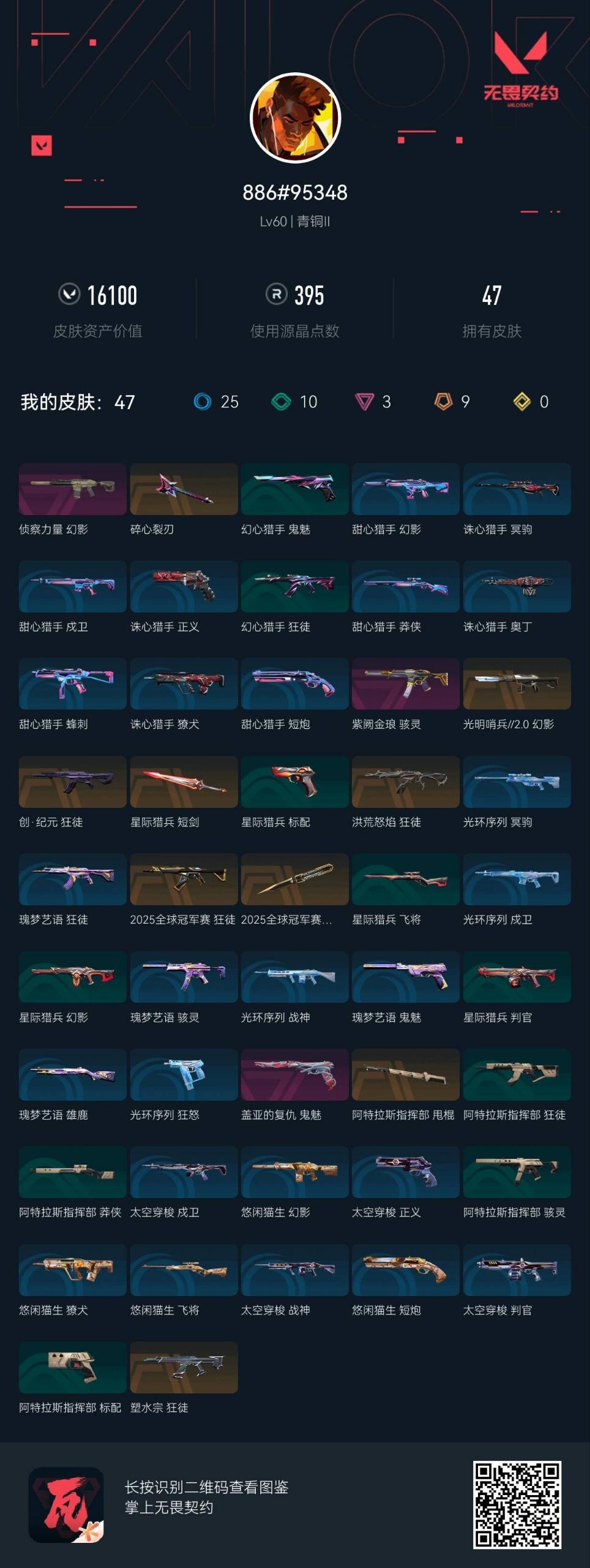 9橙皮 3紫皮 47皮肤 14英雄 62卡面 395已用源晶 青铜段位 【套装】2025全球冠军赛 【近战武器皮肤】碎心裂刃2025全球冠军赛 蝴蝶刀阿特拉斯指挥部星际猎兵 短剑 【佩呛皮肤】鬼魅-盖亚的复仇 【冲锋呛皮肤】骇灵-紫阙金琅 【步呛皮肤】狂徒-塑水宗幻影-侦察力量幻
