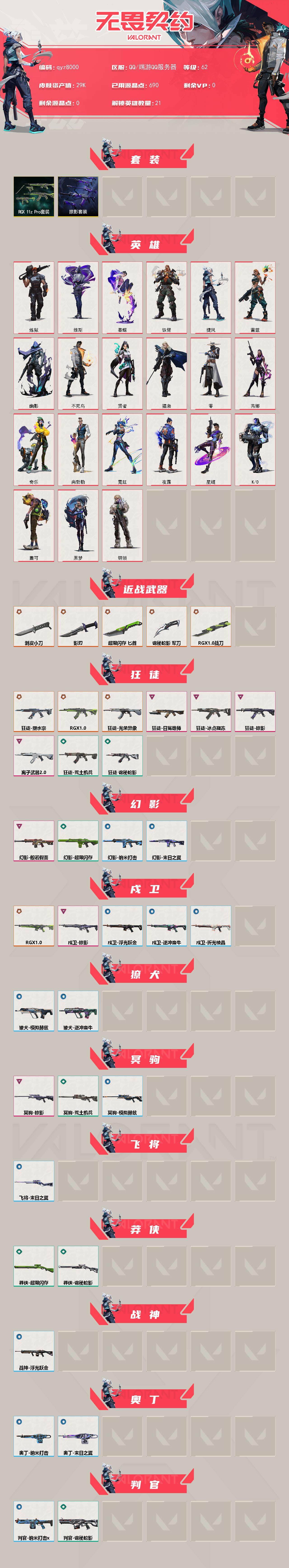 掠夺-显卡套装-剥皮-塑水ak-qyz8000-lv62-未定级,-刀皮数量5,呛皮数量60-绝版0限定12终极0卓越8-;皮肤资产价值29890,已用r点690;【刀皮】:近战武器-剥皮小刀,近战武器-超限闪存匕首,近战武器-影刃,近战武器-诡秘蛇影军刀,近战武器-rgx11zpro战刀;-【呛皮】:标配-光荣异象,狂怒-rgx11zpro,蜂刺-rgx11zpro,狂徒-塑水宗,狂徒-rgx11zpro,狂徒-光荣异象,戍卫-rgx11zpro,正义-掠影,狂徒-掠影,狂徒-日冕雄师,狂徒-离子武器20,狂徒-冰点凝冻,幻影-般若假面,戍卫-掠影,冥驹-掠影,鬼魅-诡秘蛇影,判官-诡秘蛇影,狂徒-诡秘蛇影,莽侠-诡秘蛇影,狂徒-荒土机兵,幻影-日耀风暴,幻影-超限闪存,冥驹-荒土机兵,莽侠-超限闪存,正义-超限闪存,标配-荒土机兵,骇灵-日耀风暴,骇灵-荒土机兵,蜂刺-超限闪存,奥丁-日耀风暴,幻影-末日之翼,幻影-纳米打击,戍卫-甜蜜战术,戍卫-折光棱晶,戍卫-逆冲蛮牛,戍卫-浮光跃金,獠犬-幻语魔咒,獠犬-逆冲蛮牛,獠犬-模拟赫兹,冥驹-甜蜜战术,冥驹-模拟赫兹,飞将-幻语魔咒,飞将-末日之翼,鬼魅-甜蜜战术,鬼魅-模拟赫兹,标配-折光棱晶,标配-浮光跃金,短炮-末日之翼,狂怒-幻语魔咒,狂怒-逆冲蛮牛,骇灵-浮光跃金,蜂刺-折光棱晶,判官-甜蜜战术,判官-纳米打击,雄鹿-幻语魔咒,雄鹿-逆冲蛮牛,雄鹿-模拟赫兹,奥丁-末日之翼,奥丁-纳米打击,战神-浮光跃金;【热门卡面】:rgx11zpro卡面,分崩离析卡面,双城之战拥抱卡面,vctcn首冠卡面,无畏契约吉祥物卡面;【热门挂饰】:rgx11zpro挂饰,双城之战魄罗挂饰,神中神挂饰,双城之战小蛋糕挂饰,终章ko小金人挂饰,鱼骨头挂饰,蓄势待滚挂饰;【热门喷漆】:捷风跳peek喷漆,无人之境喷漆,rgx11zpro喷漆,鼻尖上的蝴蝶喷漆,秘笈顺序喷漆,掠影喷漆,皮蛋呼呼喷漆,买装还是存钱喷漆,小丑猫喷漆;详情看图【皮肤可能含有某些特权皮肤,具体以游戏内实际拥有为准】
