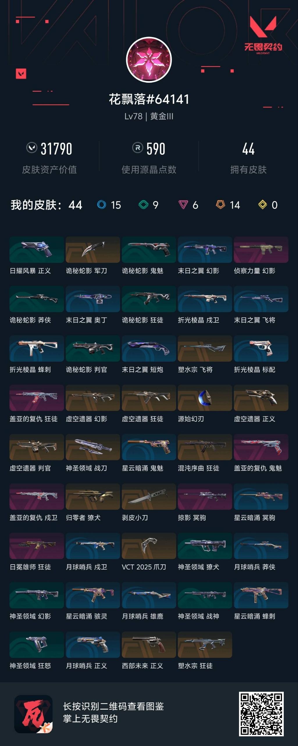 14橙皮 6紫皮 44皮肤 23英雄 62卡面 590已用源晶 黄金段位 【套装】:vcn2025套装虚空遗器vct 2025赛季礼包 【近战武器皮肤】:诡秘蛇影源始幻刃vct 2025 爪刀神圣领域 战刀剥皮小刀 【佩呛皮肤】:正义-虚空遗器正义-西部未来鬼魅-盖亚的复仇 【