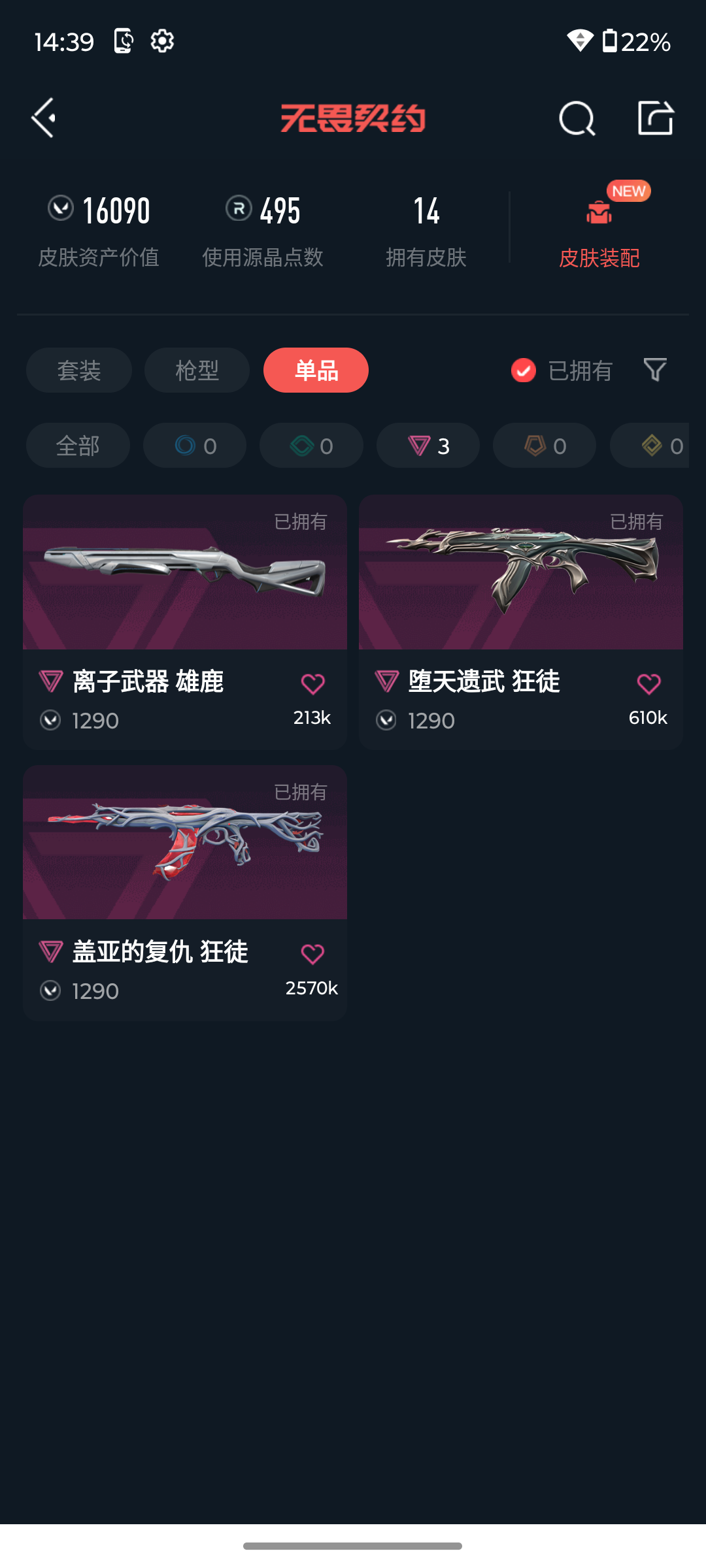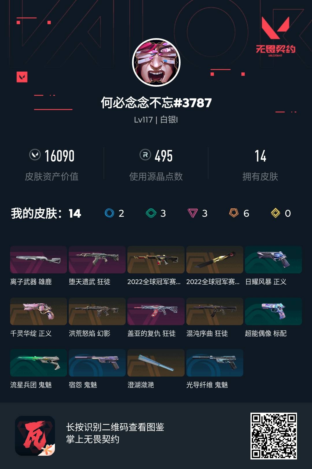 [14665405]l192520 (2022全球冠军赛套装)无畏契约/117级/白银i/16英雄/14皮肤/资产16090/已使用r点495/剩余r点165/ 2022全球冠军赛-幻影2022全球冠军赛-蝴蝶刀,澄湖潋滟,混沌序曲-狂徒,洪荒怒焰-幻影,堕天遗武-狂徒,盖亚的复仇-狂徒,离子武器-雄鹿,千灵华绽-正义