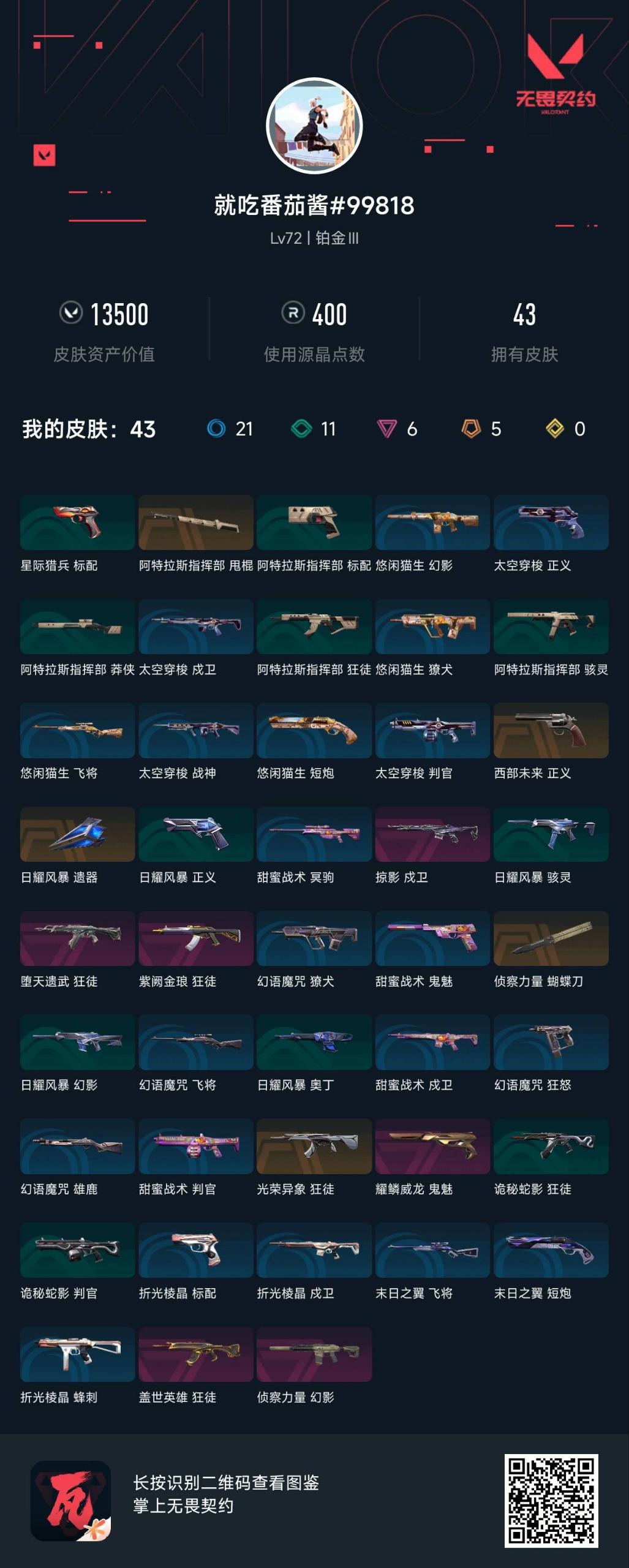 [14678741]5橙皮 6紫皮 43皮肤 23英雄 61卡面 400已用源晶 铂金段位 【近战武器皮肤】:阿特拉斯指挥部蝴蝶刀-侦察力量 【佩呛皮肤】:正义-西部未来鬼魅-耀鳞威龙 【步呛皮肤】:戍卫-掠影狂徒-光荣异象狂徒-紫阙金琅狂徒-盖世英雄狂徒-堕天遗武幻影-侦察力量 【挂饰】:薰衣草之心挂饰双城之战魄罗挂饰