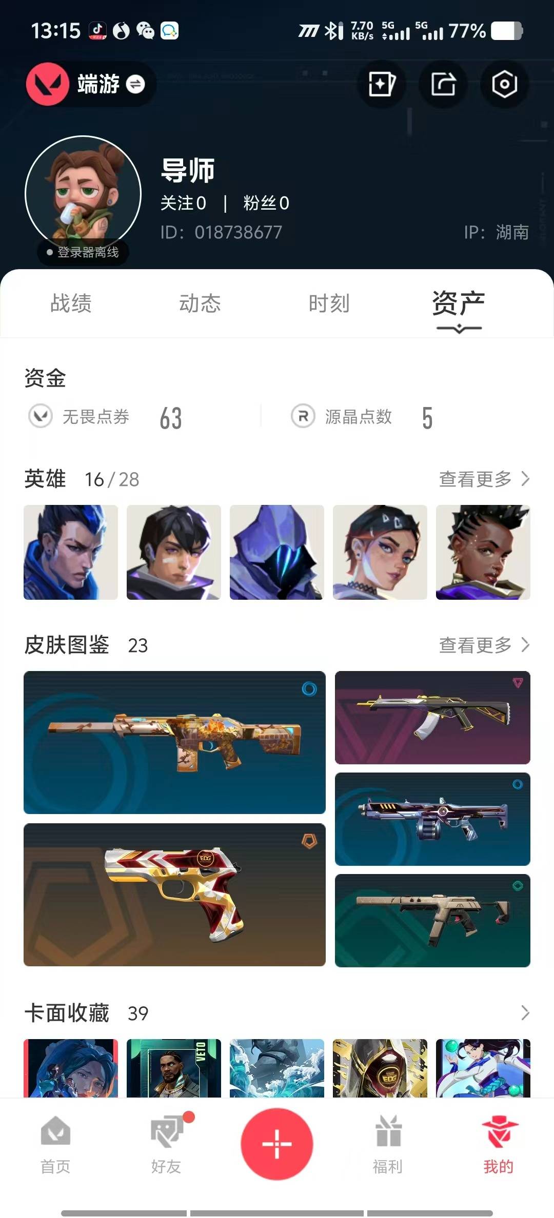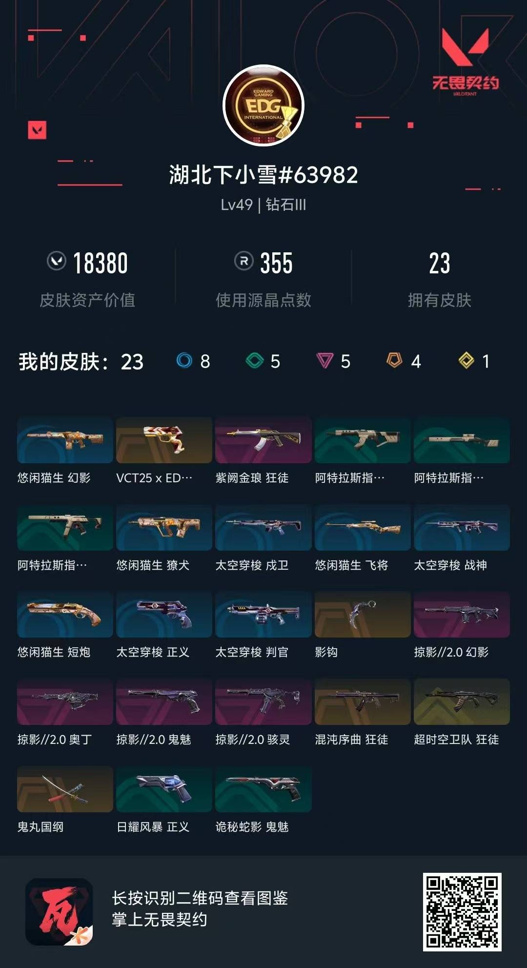 [14679583]4橙皮 1金皮 5紫皮 23皮肤 16英雄 39卡面 355已用源晶 钻石段位 【套装】:掠影2.0套装 【近战武器皮肤】:鬼丸国纲影钩 【佩呛皮肤】:标配-vct25xedg鬼魅-掠影2.0 【冲锋呛皮肤】:骇灵-掠影2.0 【步呛皮肤】:狂徒-混沌序曲幻影-掠影2.0狂徒-超时空卫队狂徒-紫阙金琅 【机呛皮肤】:奥丁-掠影2.0 【挂饰】:袖珍捷风挂饰神中神挂饰vctxedg挂饰