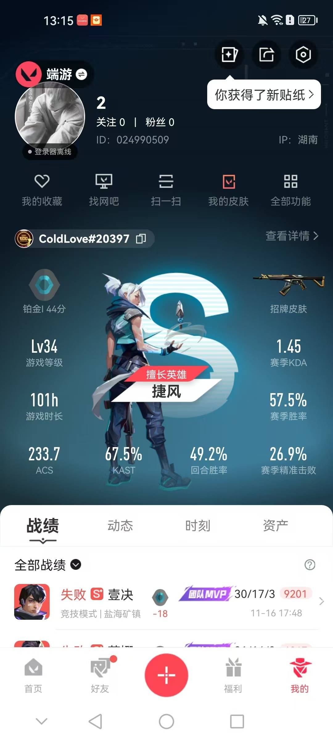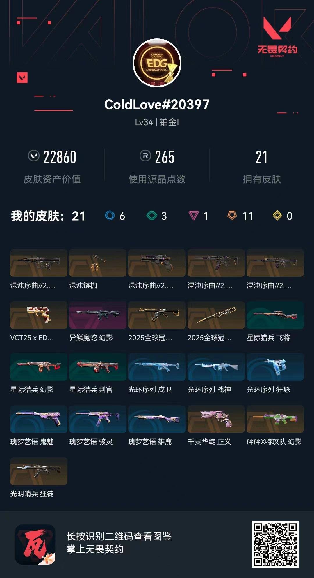 [14682333]11橙皮 1紫皮 21皮肤 13英雄 32卡面 265已用源晶 铂金段位 【套装】:2025全球冠军赛 【近战武器皮肤】:混沌链枷2025全球冠军赛 蝴蝶刀 【佩呛皮肤】:标配-vct25xedg正义-混沌序曲2.0正义-千灵华绽 【冲锋呛皮肤】:骇灵-混沌序曲2.0 【步呛皮肤】:幻影-异鳞魔蛇狂徒-光明哨兵獠犬-混沌序曲2.0幻影-混沌序曲2.02025全球冠军赛 狂徒幻影-砰砰x特攻队 【挂饰】:2025全球冠军赛挂饰vctxedg挂饰