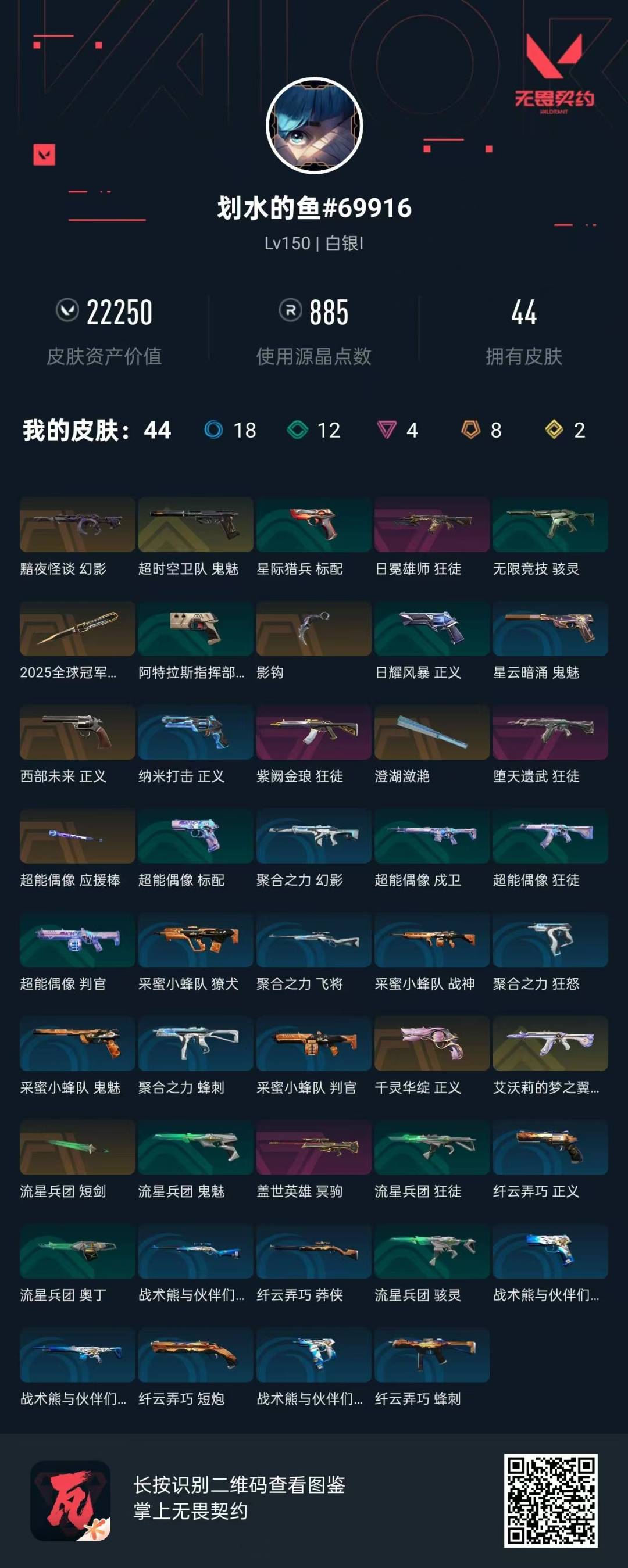 8橙皮 2金皮 4紫皮 44皮肤 21英雄 155卡面 885已用源晶 白银段位 【近战武器皮肤】:短剑-流星兵团影钩2025全球冠军赛 蝴蝶刀澄湖潋滟超能偶像 应援棒 【佩呛皮肤】:鬼魅-超时空卫队正义-西部未来正义-千灵华绽 【步呛皮肤】:幻影-黯夜怪谈狂徒-紫阙金琅狂徒-艾沃