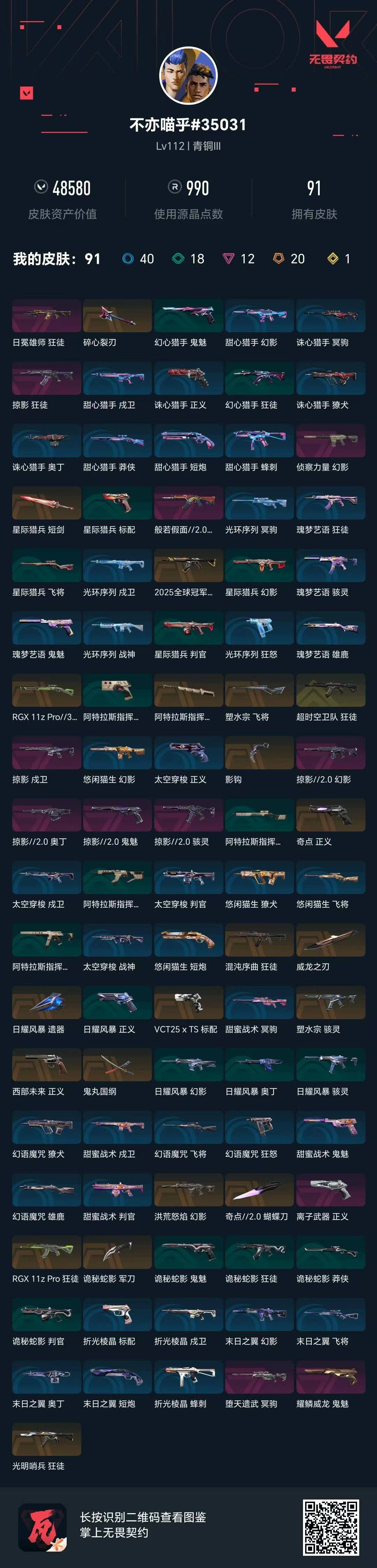 20橙皮 1金皮 12紫皮 91皮肤 18英雄 100卡面 990已用源晶 青铜段位 【套装】:掠影2.0套装 【近战武器皮肤】:蝴蝶刀-奇点//2.0影钩诡秘蛇影鬼丸国纲阿特拉斯指挥部星际猎兵 短剑碎心裂刃威龙之刃 【佩呛皮肤】:标配-vct25xts鬼魅-掠影2.0正义-西部
