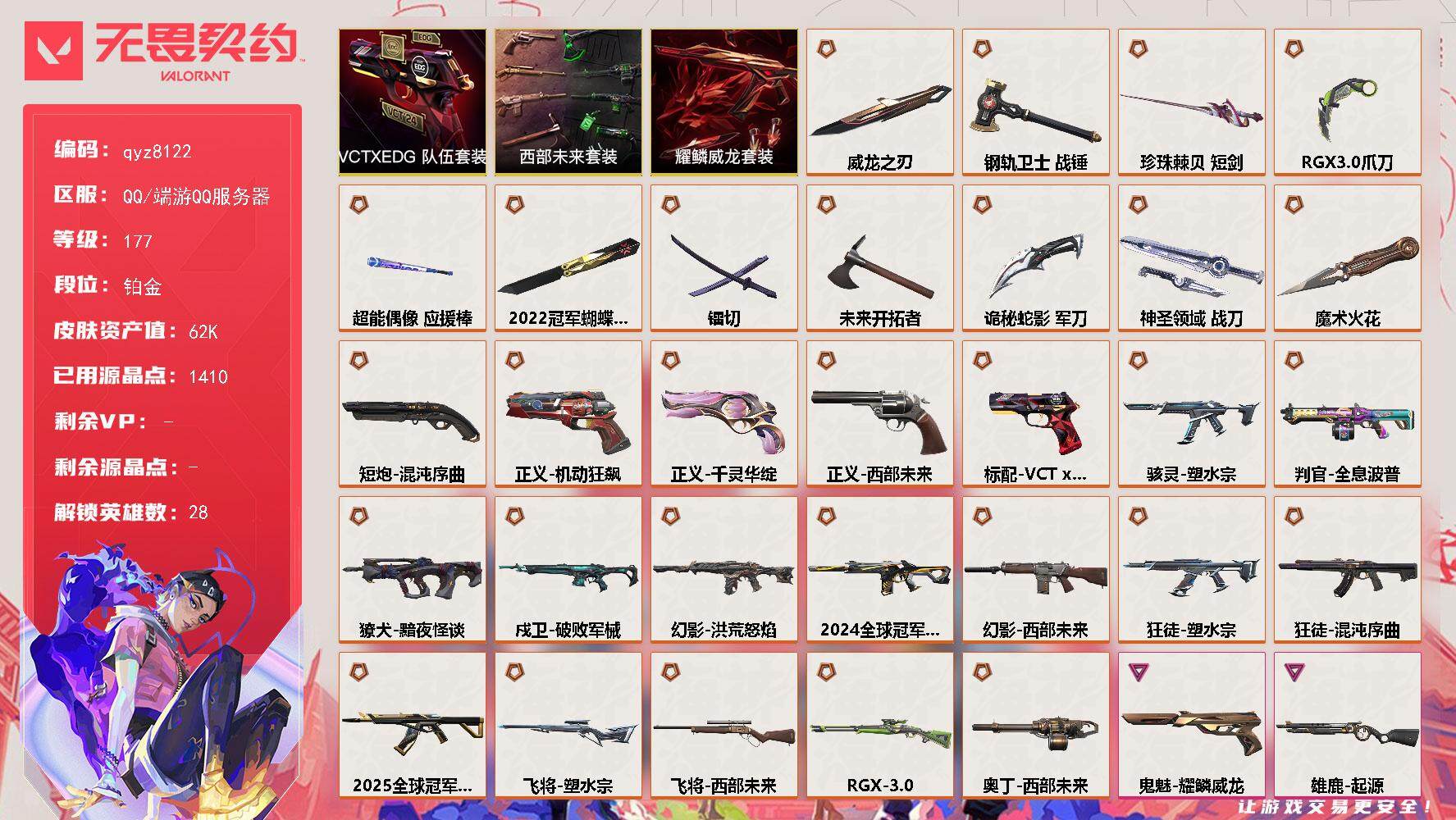 2025冠军狂徒-侦查幻影-22蝴蝶刀-显卡爪刀-全息判官-盖亚狂徒-西部未来套装-镭切-破败戍卫-塑水宗狂徒-显卡莽侠-黯夜怪谈獠犬-起源雄鹿-edg标配-混沌短炮-混沌狂徒-24冠军狂徒-qyz8122-亮点皮肤:-幻影-2024全球冠军赛蝴蝶刀-2022全球冠军赛-套装:-耀鳞威龙套装vctcn2025套装西部未来-近战武器皮肤:-威龙之刃短剑-珍珠棘贝超能偶像-应援棒爪刀-rgx-11z-pro-30战锤-钢轨卫士镭切神圣领域-战刀未来开拓者诡秘蛇影魔术火花-步呛皮肤:-狂徒-盖亚的复仇幻影-侦察力量戍卫-破败军械狂徒-塑水宗狂徒-耀鳞威龙幻影-洪荒怒焰狂徒-混沌序曲獠犬-黯夜怪谈幻影-西部未来幻影-奇幻朋克30奇幻朋克30狂徒2025全球冠军赛-狂徒-佩呛皮肤:-正义-机动狂飙鬼魅-耀鳞威龙正义-千灵华绽标配-vctxedg短炮-混沌序曲正义-西部未来-狙击呛皮肤:-飞将-塑水宗冥驹-堕天遗武莽侠-rgx-11z-pro-30飞将-西部未来-冲锋呛皮肤:-骇灵-塑水宗-霰弹呛皮肤:-雄鹿-起源判官-全息波普-机呛皮肤:-奥丁-西部未来-亮点:-【qyz8122】【套装】:西部未来套装,vctxedg-队伍套装,耀鳞威龙套装【英雄】:幻棱,炼狱,维斯,暮蝶,钛狐,壹决,铁臂,捷风,雷兹,幽影,不死鸟,贤者,猎枭,蝰蛇,零,芮娜,奇乐,尚勃勒,霓虹,斯凯,夜露,星礈,k/o,海神,盖可,黑梦,钢锁【近战-武器】:近战武器-2022全球冠军赛-蝴蝶刀,近战武器-魔术火花,近战武器-rgx-11z-pro//30-爪刀,近战武器-镭切,近战武器-威龙之刃,近战武器-未来开拓者,近战武器-珍珠棘贝-短剑,近战武器-超能偶像-应援棒,近战武器-钢轨卫士-战锤,近战武器-诡秘蛇影-军刀,近战武器-神圣领域-战刀,近战武器-魔术火花【狂徒】:狂徒-2025全球冠军赛,狂徒-混沌序曲,狂徒-塑水宗,狂徒-盖亚的复仇,狂徒-耀鳞威龙,狂徒-奇幻朋克//30,狂徒-超能偶像,狂徒-钢轨卫士,狂徒-诡秘蛇影【幻影】:幻影-2024全球冠军赛,幻影-洪荒怒焰,幻影-西部未来,幻影-侦察力量,幻影-奇幻朋克//30,幻影-珍珠棘贝,幻影-神圣领域,幻影-聚合之力,幻影-战术小伙伴,幻影-末日之翼,幻影-西部未来【戍卫】:戍卫-破败军械,戍卫-超能偶像,戍卫-钢轨卫士,戍卫-珍珠棘贝,戍卫-浮光跃金,戍卫-月球哨兵,戍卫-折光棱晶【獠犬】:獠犬-黯夜怪谈,獠犬-神圣领域,獠犬-采蜜小蜂队,獠犬-复古