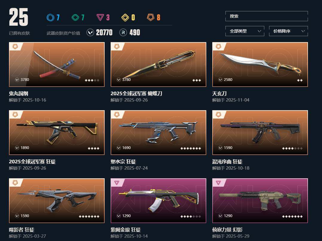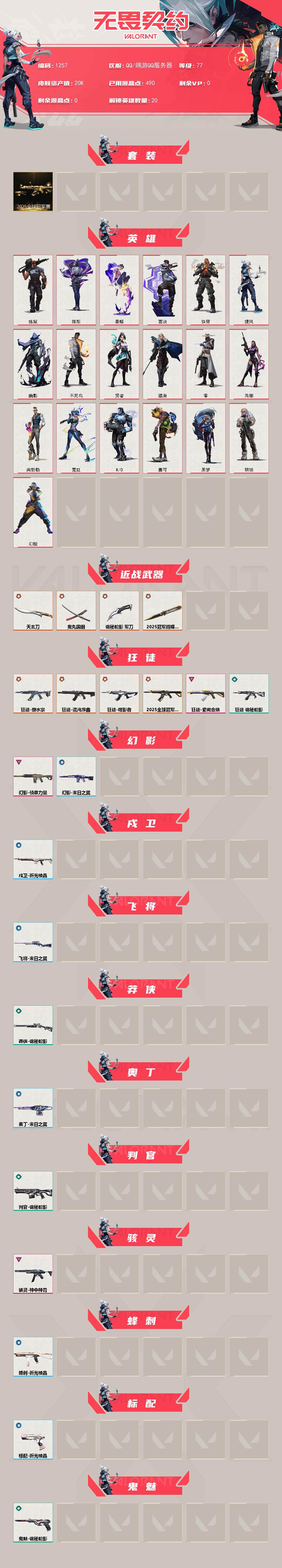 【1257】欢 387566【套装】:2025全球冠军赛套装 【英雄】:幻棱,炼狱,维斯,暮蝶,壹决,铁臂,捷风,幽影,不死鸟,贤者,猎枭,零,芮娜,尚勃勒,霓虹,k/o,盖可,黑梦,钢锁 【近战 武器】:近战武器-2025全球冠军赛 蝴蝶刀,近战武器-鬼丸国纲,近战武器-天玄刀,近战武器-诡秘蛇影 军刀 【狂徒】:狂徒-2025全球冠军赛,狂徒-混沌序曲,狂徒-塑水宗,狂徒-噬影者,狂徒-紫阙金琅,狂徒-诡秘蛇影 【幻影】:幻影-侦察力量,幻影-末日之翼 【戍卫】:戍卫-折光棱晶 【飞将】:飞将-末日之翼 【莽侠】:莽侠-诡秘蛇影 【奥丁】:奥丁-末日之翼 【判官】:判官-诡秘蛇影 【骇灵】:骇灵-神中神罚 【蜂刺】:蜂刺-折光棱晶 【标配】:标配-折光棱晶 【鬼魅】:鬼魅-诡秘蛇影 【短炮】:短炮-末日之翼 【卡面】:无畏契约:暮蝶 卡面,无畏契约go!第一卷:芮娜 卡面,无畏契约go!第一卷:零 卡面,《双城之战》金克丝 卡面,沙尘幻旅 卡面,代号红色 卡面,新兵报到 卡面,v契约 卡面,无畏契约 卡面 【喷漆】:伤心心 喷漆,买装还是存钱 喷漆,胜利属于无畏契约 喷漆,glhf 喷漆,无畏契约 喷漆 【挂饰】:无畏契约go!第一卷 芮娜 挂饰,无畏契约go!第一卷 零 挂饰,天外飞客 挂饰,无畏契约 纪念币 挂饰