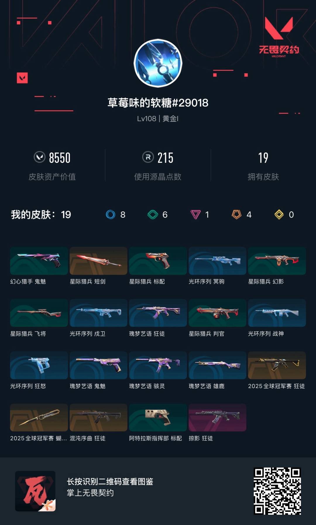 4橙皮 1紫皮 19皮肤 28英雄 45卡面 215已用源晶 黄金段位 【套装】:2025全球冠军赛 【近战武器皮肤】:星际猎兵 短剑2025全球冠军赛 蝴蝶刀 【步呛皮肤】:狂徒-混沌序曲狂徒-掠影2025全球冠军赛 狂徒 【挂饰】:神中神挂饰2025全球冠军赛挂饰