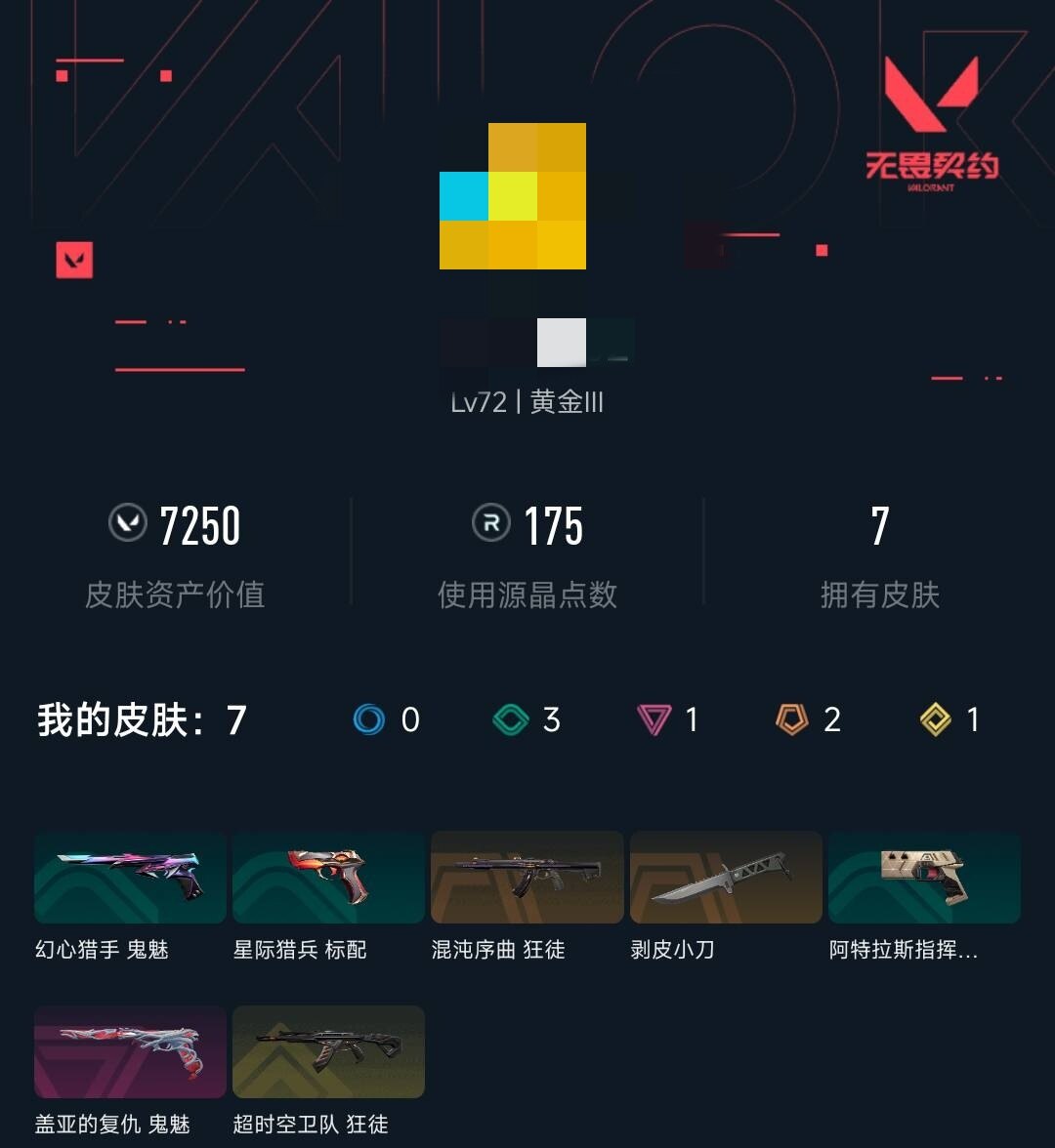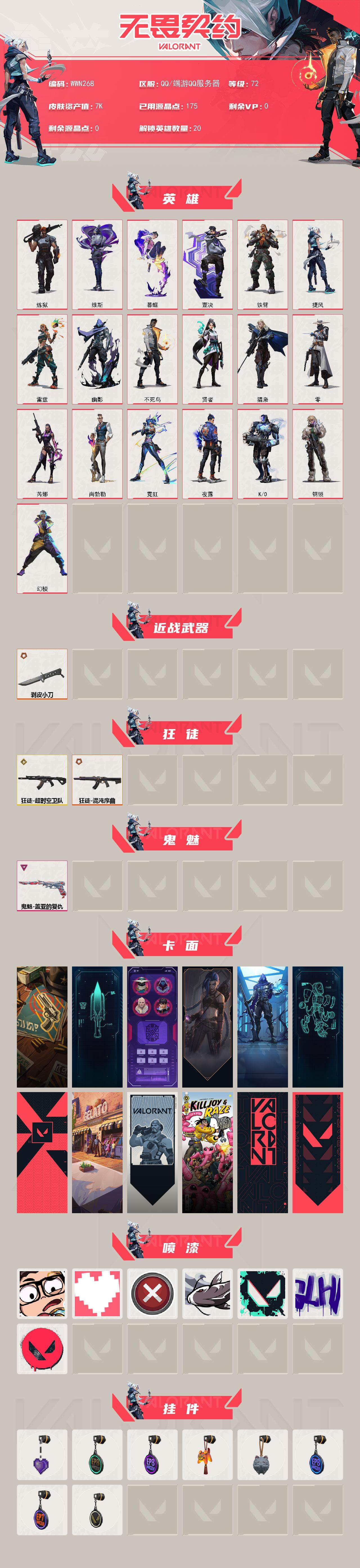 【wwn268】终极2/传奇1/卓越1/皮肤7/等级72/段位:黄金/幻棱/炼狱/维斯/暮蝶/壹决/铁臂/捷风/雷兹/幽影/不死鸟/贤者/猎枭/零/芮娜/尚勃勒/霓虹/夜露/k/o/钢锁/近战武器-剥皮小刀/狂徒-超时空卫队/狂徒-混沌序曲/鬼魅-盖亚的复仇/正义的化身 卡面/零点嗅探设计图 卡面/清除名单 卡面/《双城之战》金克丝 卡面/暗呛 卡面/铁臂设计图 卡面/代号红色 卡面/冰淇淋店 卡面/新兵报到 卡面/友军火力 卡面/v契约 卡面/无畏契约 卡面/新潮流 喷漆/双击点赞 喷漆/买装还是存钱 喷漆/松叶 喷漆/胜利属于无畏契约 喷漆/glhf 喷漆/无畏契约 喷漆/薰衣草之心 挂饰/第八季//第三幕 纪念币 挂饰/第八季//第二幕 纪念币 挂饰 /好运福爪 挂饰/《双城之战》魄罗 挂饰/第八季//第一幕 纪念币 挂饰/第七季//第二幕 纪念币 挂饰/无畏契约 纪念币 挂饰