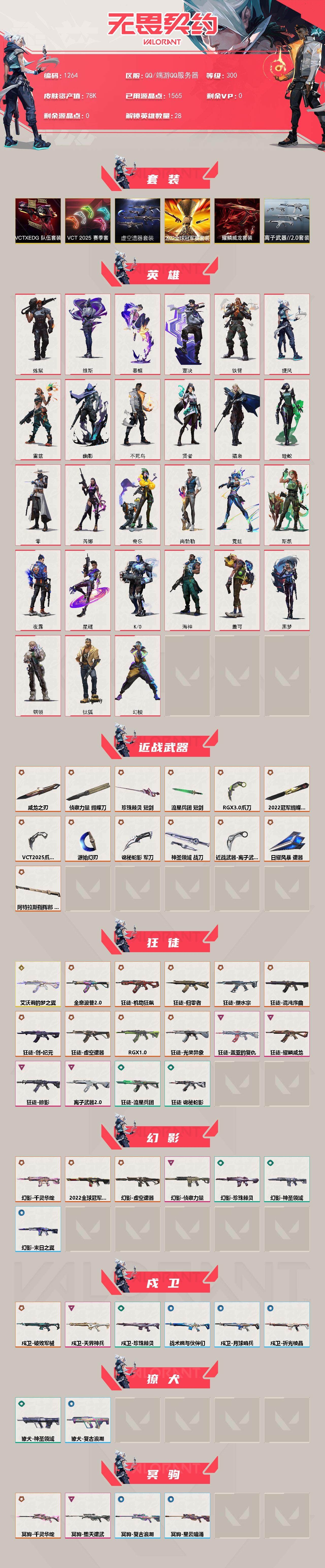 【1264】欢 493143【套装】:2022全球冠军赛套装,虚空遗器套装,vct 2025 赛季套装,vctxedg 队伍套装,耀鳞威龙套装,离子武器//2.0套装 【英雄】:幻棱,炼狱,维斯,暮蝶,钛狐,壹决,铁臂,捷风,雷兹,幽影,不死鸟,贤者,猎枭,蝰蛇,零,芮娜,奇乐,尚勃勒,霓虹,斯凯,夜露,星礈,k/o,海神,盖可,黑梦,钢锁 【近战 武器】:近战武器-2022全球冠军赛 蝴蝶刀,近战武器-侦察力量 蝴蝶刀,近战武器-vct 2025 爪刀,近战武器-rgx 11z pro//3.0 爪刀,近战武器-威龙之刃,近战武器-离子武器//2.0 爪刀,近战武器-源始幻刃,近战武器-珍珠棘贝 短剑,近战武器-流星兵团 短剑,近战武器-诡秘蛇影 军刀,近战武器-神圣领域 战刀,近战武器-日耀风暴 遗器,近战武器-阿特拉斯指挥部 甩棍 【狂徒】:狂徒-艾沃莉的梦之翼,狂徒-归零者,狂徒-混沌序曲,狂徒-机动狂飙,狂徒-全息波普//2.0,狂徒-塑水宗,狂徒-创·纪元,狂徒-虚空遗器,狂徒-rgx 11z pro,狂徒-光荣异象,狂徒-掠影,狂徒-盖亚的复仇,狂徒-耀鳞威龙,狂徒-离子武器//2.0,狂徒-流星兵团,狂徒-诡秘蛇影 【幻影】:幻影-2022全球冠军赛,幻影-千灵华绽,幻影-虚空遗器,幻影-侦察力量,幻影-珍珠棘贝,幻影-神圣领域,幻影-末日之翼 【戍卫】:戍卫-破败军械,戍卫-天界神兵,戍卫-珍珠棘贝,戍卫-战术熊与伙伴们,戍卫-月球哨兵,戍卫-折光棱晶 【獠犬】:獠犬-神圣领域,獠犬-复古浪潮 【冥驹】:冥驹-千灵华绽,冥驹-堕天遗武,冥驹-复古浪潮,冥驹-星云暗涌 【飞将】:飞将-西部未来,飞将-战术熊与伙伴们,飞将-末日之翼 【莽侠】:莽侠-rgx 11z pro//3.0,莽侠-诡秘蛇影,莽侠-深海水族,莽侠-纤云弄巧,莽侠-月球哨兵 【战神】:战神-奇点,战神-离子武器//2.0,战神-神圣领域,战神-深海水族 【奥丁】:奥丁-流星兵团,奥丁-末日之翼 【判官】:判官-虚空遗器,判官-诡秘蛇影 【雄鹿】:雄鹿-复古浪潮,雄鹿-月球哨兵 【骇灵】:骇灵-离子武器//2.0,骇灵-流星兵团,骇灵-珍珠棘贝,骇灵-星云暗涌 【蜂刺】:蜂刺-深海水族,蜂刺-纤云弄巧,蜂刺-星云暗涌,蜂刺-折光棱晶 【标配】:标配-超能偶像,标配-战术熊与伙伴们,标配-折光棱晶 【vct手呛】:标配-vct x edg,标配-vct25 x blg 【正义】:正义-塑水宗,正义-西部未来,正义-虚空遗器,正义-超限闪存,正义-复古浪潮,正义-纳米打击,正义-纤云弄巧,正义-游戏结束,正义-月球哨兵 【鬼魅】:鬼魅-天界神兵,鬼魅-耀鳞威龙,鬼魅-流星兵团,鬼魅-诡秘蛇影,鬼魅-光导纤维,鬼魅-扑棱扑棱,鬼魅-星云暗涌 【狂怒】:狂怒-离子武器//2.0,狂怒-珍珠棘贝,狂怒-神圣领域,狂怒-战术熊与伙伴们 【短炮】:短炮-混沌序曲,短炮-深海水族,短炮-纤云弄巧,短炮-末日之翼 【卡面】:终章:激斗汉堡 卡面,进入射程 卡面,《双城之战》拥抱 卡面,精灵大战 卡面,欢迎来到底城 卡面,南瓜盛典 卡面,无畏契约:暮蝶 卡面,修车达人 卡面,热舞环节 卡面,正义的化身 卡面,终章:生意人麦宝 卡面,铁之华 卡面,时间到 卡面,最高舞台 卡面,音熊登场 卡面,树懒大作战 卡面,声感陷阱设计图 卡面,红鳞松叶 卡面,clutch 卡面,梦幻奶茶 卡面,终章:打造专属狂徒 卡面,趁热吃 卡面,西装暴徒 卡面,失控边缘 卡面,哨卫者之领域 卡面,暮蝶工牌 卡面,战术熊与伙伴们 卡面,源能反应 卡面,流星兵团 卡面,纤云弄巧 卡面,暂别喧嚣 卡面,打造专属狂徒 卡面,零点嗅探设计图 卡面,终章:瓦娃脸雪糕 卡面,表象之下 卡面,虹吸式咖啡壶 卡面,源能者美容 卡面,脚踝终结者 卡面 ,夜班 卡面,瓦娃脸雪糕 卡面 ,沙雕爆能器 卡面,无畏契约go!第一卷:芮娜 卡面,深海水族 卡面,珍珠棘贝 卡面,复古浪潮 卡面,盖可工牌 卡面,清除名单 卡面,无畏契约go!第一卷:零 卡面,终章:同步耍酷 卡面,龍记 卡面,化茧成蝶 卡面,先瓦为敬 绿色 卡面,《双城之战》金克丝 卡面,同步耍酷 卡面,完美调谐 卡面 ,战术小伙伴 卡面,暗呛 卡面,钢锁vs盖可 卡面,别冒尖 卡面,"luie" 卡面,铁臂设计图 卡面,代号红色 卡面,冰淇淋店 卡面,新兵报到 卡面,友军火力 卡面,v契约 卡面,无畏契约 卡面 【喷漆】:嗨宝南瓜灯 喷漆,啊? 喷漆,嘭! 喷漆,都算到了 喷漆,通缉:战术熊 喷漆,控场勿近 喷漆,伤心心 喷漆,小丑猫 喷漆,熊抱 喷漆,又被闪了 喷漆,终极羞辱 喷漆,超级粉丝 喷漆,捷风差距 喷漆,惊声尖叫 喷漆,拼一呛 喷漆,加油!加油! 喷漆,开心到爆炸 喷漆,皮蛋萌舞 喷漆,我觉得不行 喷漆,头号粉丝 喷漆,吸一口快乐 喷漆,永远的答案 喷漆,再来一次? 喷漆,别挡我的路! 喷漆,我的刀呢? 喷漆,当然可以 喷漆,流星兵团 喷漆,战术熊与伙伴们 喷漆,禁止喷漆 喷漆,纤云弄巧 喷漆,情绪控制 喷漆,哨卫滑步 喷漆,倒吸一口凉气 喷漆,uwu 喷漆,新潮流 喷漆,逮到一个 喷漆,一个人的孤岛 喷漆,双人比心 喷漆,不予置评 喷漆,三熊合一 喷漆,要喝完噢! 喷漆,双击点赞 喷漆,珍珠棘贝 喷漆,深海水族 喷漆,禁止标配 喷漆 ,铁臂尴尬 喷漆,买装还是存钱 喷漆,醒狮贺春 喷漆,酷熊冲浪 喷漆,红鳞 喷漆,无畏契约go!第一卷:零 喷漆,无畏契约go!第一卷:捷风 喷漆,无畏契约go!第一卷:贤者 喷漆,松叶 喷漆,旅行小熊 喷漆,又一个梦幻组合 喷漆,蕊形灯 喷漆,胜利属于无畏契约 喷漆,glhf 喷漆,无畏契约 喷漆 【挂饰】:第九季:超凡 挂饰,终章:猫猫木乃伊 挂饰,悠闲鸡块 挂饰,伞绳 挂饰,《双城之战》小蛋糕 挂饰,第九季//第三幕 纪念币 挂饰,工具腰带 挂饰,无畏契约go!第一卷 芮娜 挂饰,无畏契约go!第一卷 零 挂饰,熔岩灯