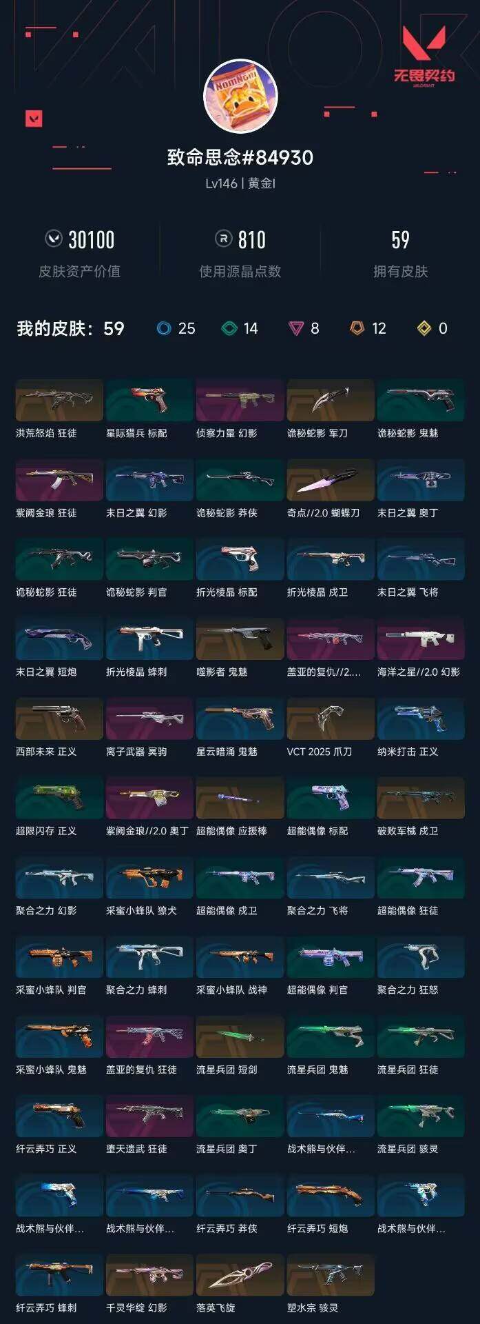 【wwqh53】终极12/卓越8/皮肤59/等级146/段位:黄金/vct 2025 赛季套装/幻棱/炼狱/维斯/暮蝶/钛狐/壹决/铁臂/捷风/雷兹/幽影/不死鸟/贤者/猎枭/蝰蛇/零/芮娜/奇乐/尚勃勒/霓虹/斯凯/夜露/星礈/k/o/海神/盖可/黑梦/钢锁/近战武器-奇点//2.0 蝴蝶刀/近战武器-vct 2025 爪刀/近战武器-落英飞旋/近战武器-流星兵团 短剑/近战武器-超能偶像 应援棒/近战武器-诡秘蛇影 军刀/狂徒-洪荒怒焰/狂徒-堕天遗武/狂徒-盖亚的复仇/狂徒-紫阙金琅/狂徒-超能偶像/狂徒-流星兵团/狂徒-诡秘蛇影/幻影-千灵华绽/幻影-侦察力量/幻影-海洋之星//2.0/幻影-聚合之力/幻影-末日之翼/戍卫-破败军械/戍卫-超能偶像/戍卫-战术熊与伙伴们/戍卫-折光棱晶/獠犬-采蜜小蜂队/冥驹-离子武器/飞将-聚合之力/飞将-战术熊与伙伴们/飞将-末日之翼/莽侠-诡秘蛇影/莽侠-纤云弄巧/战神-盖亚的复仇//2.0/战神-采蜜小蜂队/奥丁-紫阙金琅//2.0/奥丁-流星兵团/奥丁-末日之翼/判官-超能偶像/判官-诡秘蛇影/判官-采蜜小蜂队/骇灵-塑水宗/骇灵-流星兵团/蜂刺-聚合之力/蜂刺-纤云弄巧/蜂刺-折光棱晶/标配-超能偶像/标配-战术熊与伙伴们/标配-折光棱晶/正义-西部未来/正义-超限闪存/正义-纳米打击/正义-纤云弄巧/鬼魅-噬影者/鬼魅-流星兵团/鬼魅-诡秘蛇影/鬼魅-采蜜小蜂队/鬼魅-星云暗涌/狂怒-聚合之力/狂怒-战术熊与伙伴们/短炮-纤云弄巧/短炮-末日之翼/终章:激斗汉堡 卡面/进入射程 卡面/《双城之战》拥抱 卡面/精灵大战 卡面/欢迎来到底城 卡面/南瓜盛典 卡面/修车达人 卡面/正义的化身 卡面/终章:生意人麦宝 卡面/铁之华 卡面/失而复得 卡面/时间到 卡面/最高舞台 卡面/复活专家 卡面/归乡 // 蝰蛇 卡面/超能偶像 卡面/生意人麦宝 卡面/声感陷阱设计图 卡面/钢锁工牌 卡面/战术小伙伴的夏日 卡面/采蜜小蜂队 卡面/聚合之力 卡面/梦幻奶茶 卡面/终章:打造专属狂徒 卡面/趁热吃 卡面/西装暴徒 卡面/失控边缘 卡面/哨卫者之领域 卡面/暮蝶工牌 卡面/战术熊与伙伴们 卡面/源能反应 卡面/流星兵团 卡面/纤云弄巧 卡面/暂别喧嚣 卡面/打造专属狂徒 卡面/零点嗅探设计图 卡面/无畏契约go!第一卷:芮娜 卡面/复古浪潮 卡面/无畏契约go!第一卷:零 卡面/势不可挡//盖可 卡面/代号红色 卡面/新兵报到 卡面/v契约 卡面/无畏契约 卡面/嗨宝南瓜灯 喷漆/嘭! 喷漆/都算到了 喷漆/控场勿近 喷漆/小丑猫 喷漆/熊抱 喷漆/又被闪了 喷漆/终极羞辱 喷漆/超级粉丝 喷漆/黯兽卖萌 喷漆/捷风差距 喷漆/惊声尖叫 喷漆/五人成星 喷漆/超能偶像 喷漆/放我出去 喷漆/掩护我 喷漆/大佬发呛 喷漆/边缘试探 喷漆/拼一呛 喷漆/聚合之力 喷漆/采蜜小蜂队 喷漆/梦幻小队 喷漆/五个全都齐了 喷漆/加油!加油! 喷漆/开心到爆炸 喷漆/皮蛋萌舞 喷漆/我觉得不行 喷漆/头号粉丝 喷漆/吸一口快乐 喷漆/永远的答案 喷漆/再来一次? 喷漆/别挡我的路! 喷漆/我的刀呢? 喷漆/当然可以 喷漆/流星兵团 喷漆/战术熊与伙伴们 喷漆/禁止喷漆 喷漆/纤云弄巧 喷漆/哨卫滑步 喷漆/双人比心 喷漆/买装还是存钱 喷漆/胜利属于无畏契约 喷漆/glhf 喷漆/无畏契约 喷漆/终章:猫猫木乃伊 挂饰/悠闲鸡块 挂饰/伞绳 挂饰/《双城之战》小蛋糕 挂饰/第九季//第三幕 纪念币 挂饰/工具腰带 挂饰/无畏契约go!第一卷 芮娜 挂饰/无畏契约go!第一卷 零 挂饰/熔岩灯 挂饰/第九季//第二幕 纪念币 挂饰/终章:这瓜保熟 挂饰/炼狱雪糕 挂饰/糖葫芦 挂饰/袖珍捷风 挂饰/冲上云霄 挂饰/超能偶像 挂饰/迷你浓缩 挂饰/这瓜保熟 挂饰/采蜜小蜂队 挂饰/第九季//第一幕 纪念币 挂饰/聚合之力 挂饰/第八季:白银 挂饰/终章:迷你机甲 挂饰/犯困的布鲁诺 挂饰/战术河童 挂饰/招财猫熊 挂饰/迷你机甲 挂饰/荧光棒 挂饰/章鱼烧先生 挂饰/流星兵团 挂饰/云开见日 挂饰/第八季//第三幕 纪念币 挂饰/天外飞客 挂饰/无畏契约 纪念币 挂饰