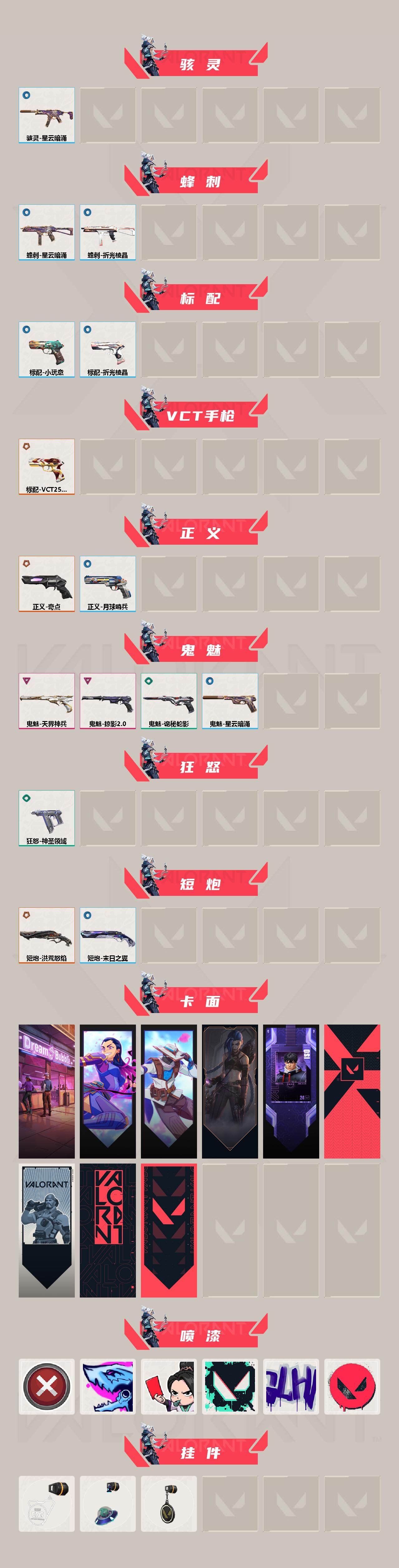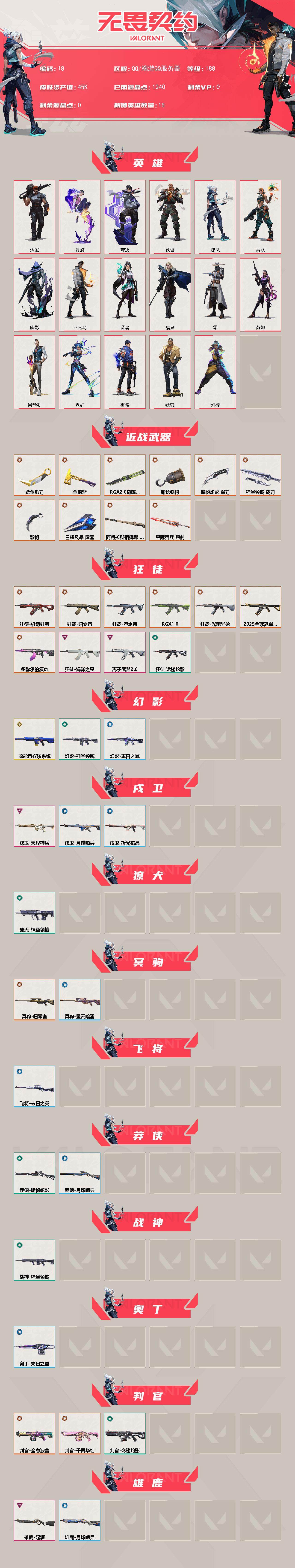 【游戏等级】lv188 【段位】 超凡ii 【r点】1240 【皮肤总价值】45000 【英雄数量】18 【皮肤数量】102 【挂饰数量】71 【卡面数量】109 【喷漆数量】119 【近战武器】近战武器-碎心裂刃 近战武器-紫金爪刀 近战武器-星际猎兵短剑 近战武器-船长铁钩 近战武器-阿特拉斯指挥部甩棍 近战武器-影钩 近战武器-金琅斧 近战武器-日耀风暴遗器 近战武器-rgx11zpr