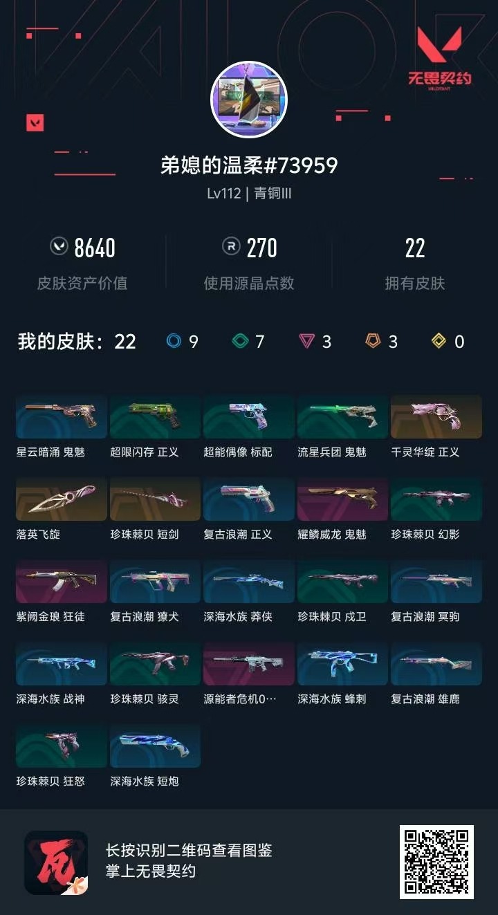 [7124007]3橙皮 3紫皮 22皮肤 27英雄 50卡面 270已用源晶 青铜 佩呛皮肤:正义-千灵华绽鬼魅-耀鳞威龙 步呛皮肤:狂徒-紫阙金琅幻影-源能者危机001 近战武器皮肤:短剑-珍珠棘贝落英飞旋