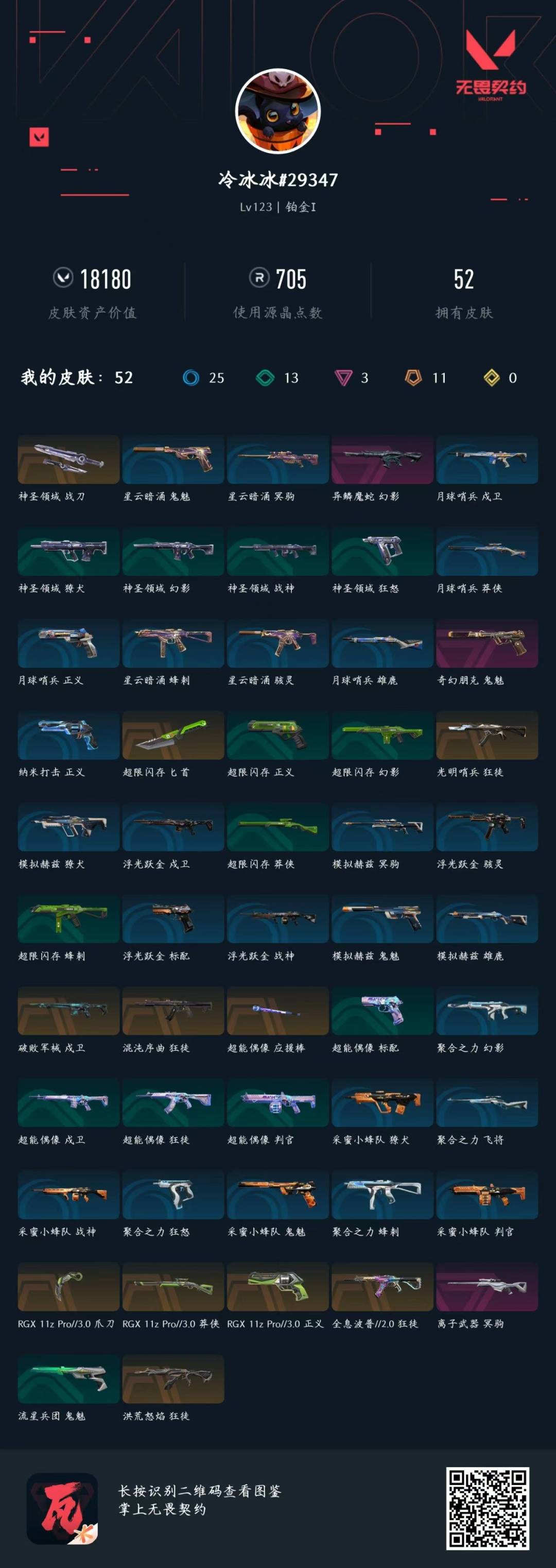 [7297457]11橙皮 3紫皮 52皮肤 27英雄 75卡面 705已用源晶 铂金 套装:rgx 11z pro//3.0套装 佩呛皮肤:正义-rgx 11z pro 3.0鬼魅-奇幻朋克 步呛皮肤:狂徒-光明哨兵狂徒-混沌序曲狂徒-洪荒怒焰狂徒-全息波普//2.0戍卫-破败军械 狙击呛皮肤:莽侠-rgx 11z pro 3.0冥驹-离子武器 近战武器皮肤:神圣领域 战刀匕首-超限闪存爪刀-rgx 11z pro 3.0超能偶像 应援棒