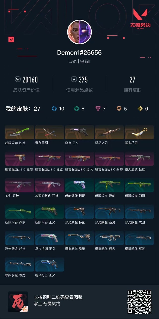 [7464956]5橙皮 7紫皮 27皮肤 22英雄 59卡面 375已用源晶 未定级 套装:般若假面//2.0套装 佩呛皮肤:狂怒-般若假面//2.0正义-奇点 步呛皮肤:狂徒-掠影狂徒-般若假面//2.0獠犬-般若假面//2.0狂徒-盖亚的复仇狂徒-堕天遗武 机呛皮肤:战神-般若假面//2.0 近战武器皮肤:匕首-超限闪存鬼丸国纲紫金爪刀威龙之刃