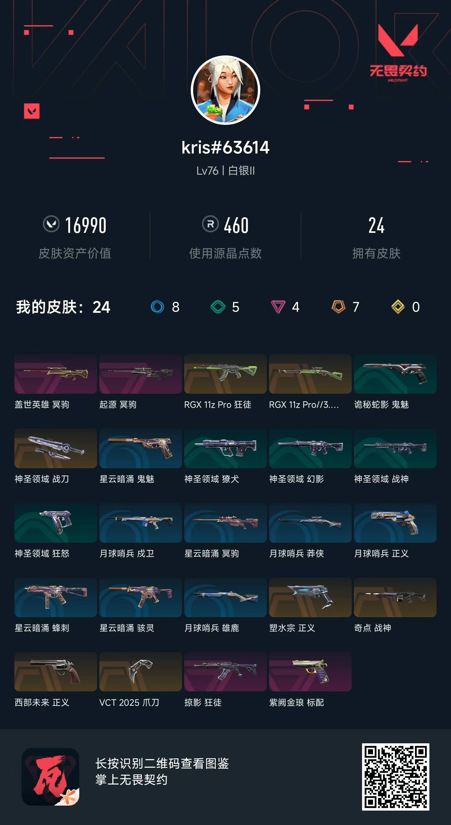 7橙皮 4紫皮 24皮肤 14英雄 61卡面 460已用源晶 白银 套装:vct 2025赛季礼包vcn2025套装 佩呛皮肤:正义-西部未来正义-塑水宗标配-紫阙金琅 步呛皮肤:狂徒-掠影rgx 11z pro 狂徒 狙击呛皮肤:莽侠-rgx 11z pro 3.0冥驹-盖世英雄冥