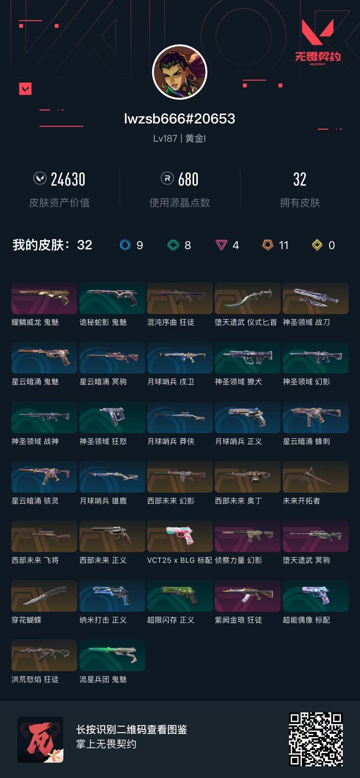 [8966642]11橙皮 4紫皮 32皮肤 27英雄 66卡面 680已用源晶 黄金 套装:西部未来 佩呛皮肤:标配-vct25xblg正义-西部未来鬼魅-耀鳞威龙 步呛皮肤:狂徒-混沌序曲幻影-西部未来狂徒-紫阙金琅狂徒-洪荒怒焰幻影-侦察力量 狙击呛皮肤:飞将-西部未来冥驹-堕天遗武 机呛皮肤:奥丁-西部未来 近战武器皮肤:未来开拓者神圣领域 战刀穿花蝴蝶堕天遗武 仪式匕首