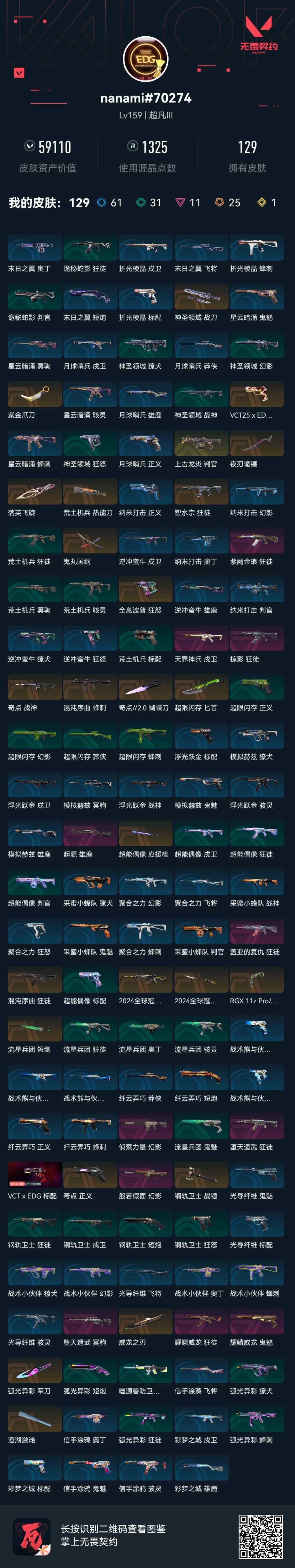 [8976520]r19979,有二次,剩余点券:81, lv159 ,皮肤总价值59110,未定级,总皮肤129,刀皮16呛皮113终极1传奇9卓越11,套装2传奇1卓越1,2024全球冠军赛套装,耀鳞威龙套装,具体详情看图