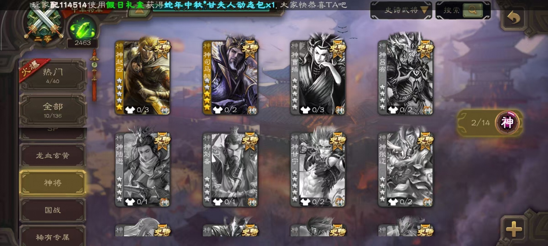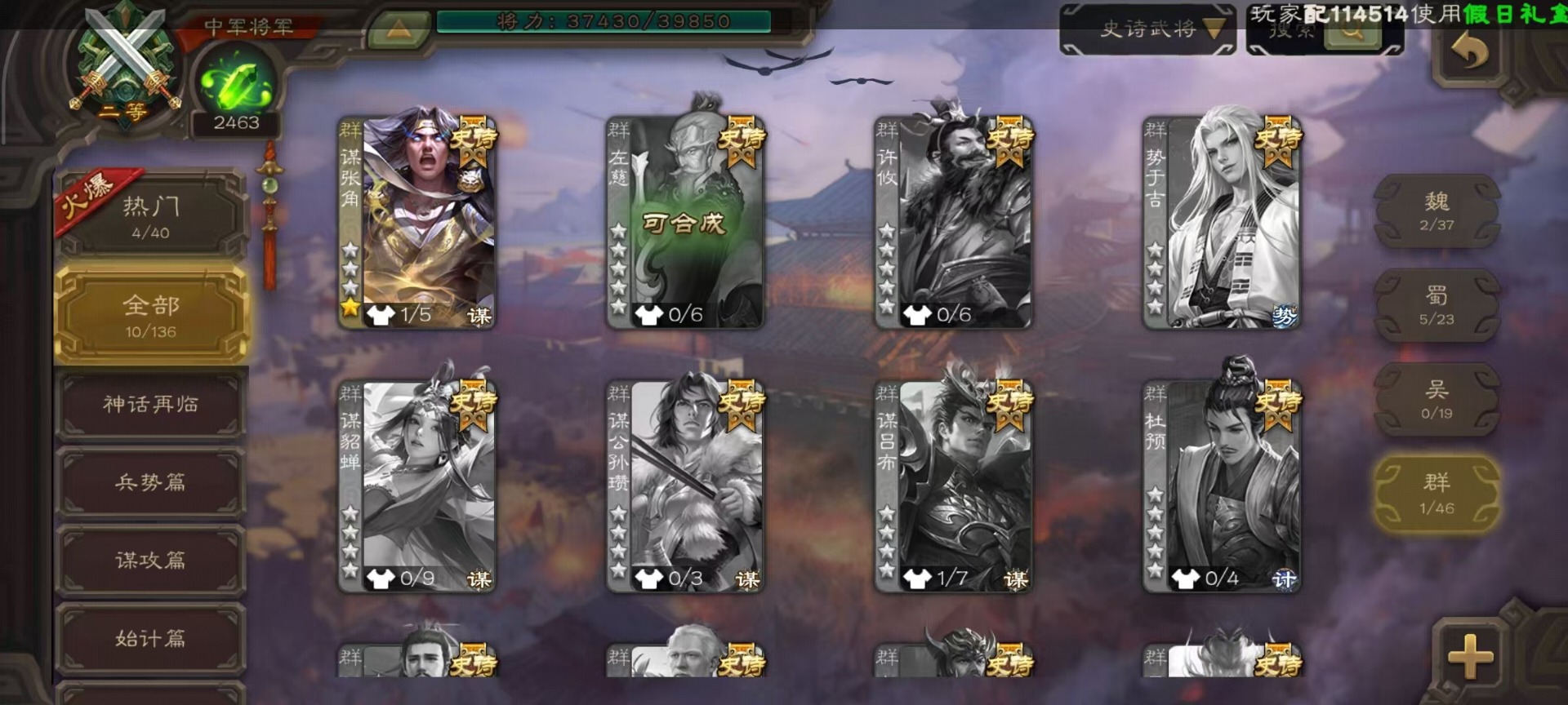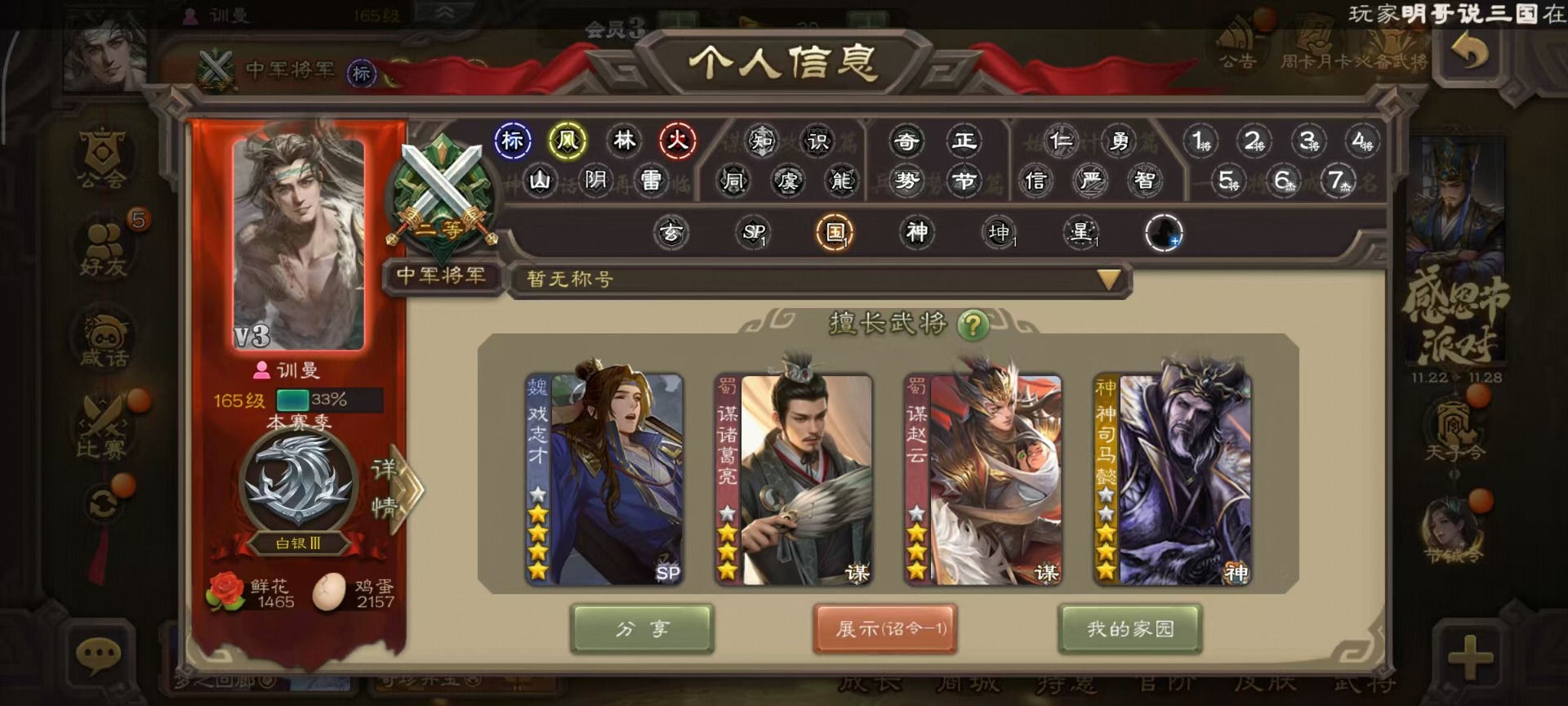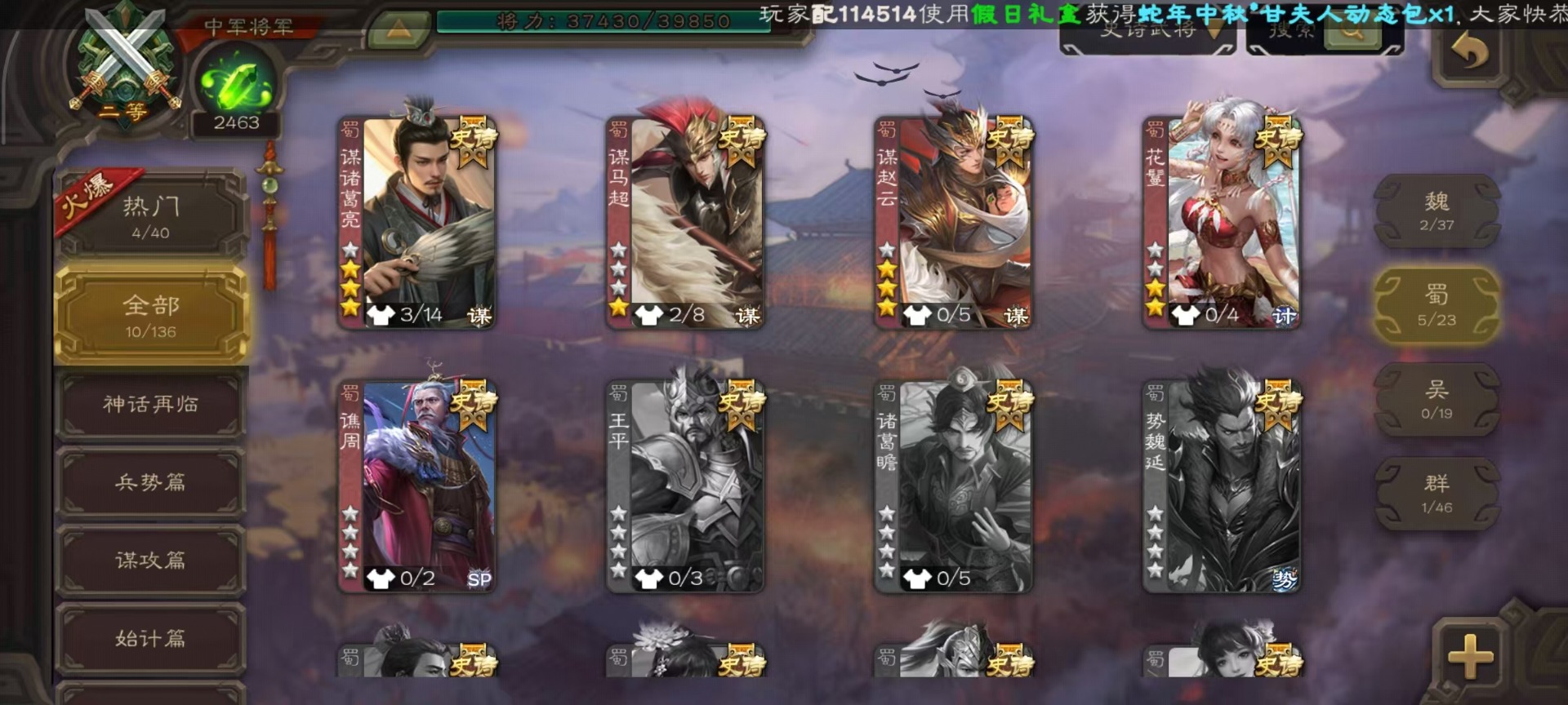 [14525623]vip3 中军将军 189武将 5动态皮肤 10史诗武将 【神将】:神赵云神司马懿 【魏国武将】:程昱戏志才 【蜀国武将】:谋诸葛亮谋赵云谋马超谯周花鬘 【群国武将】:谋张角