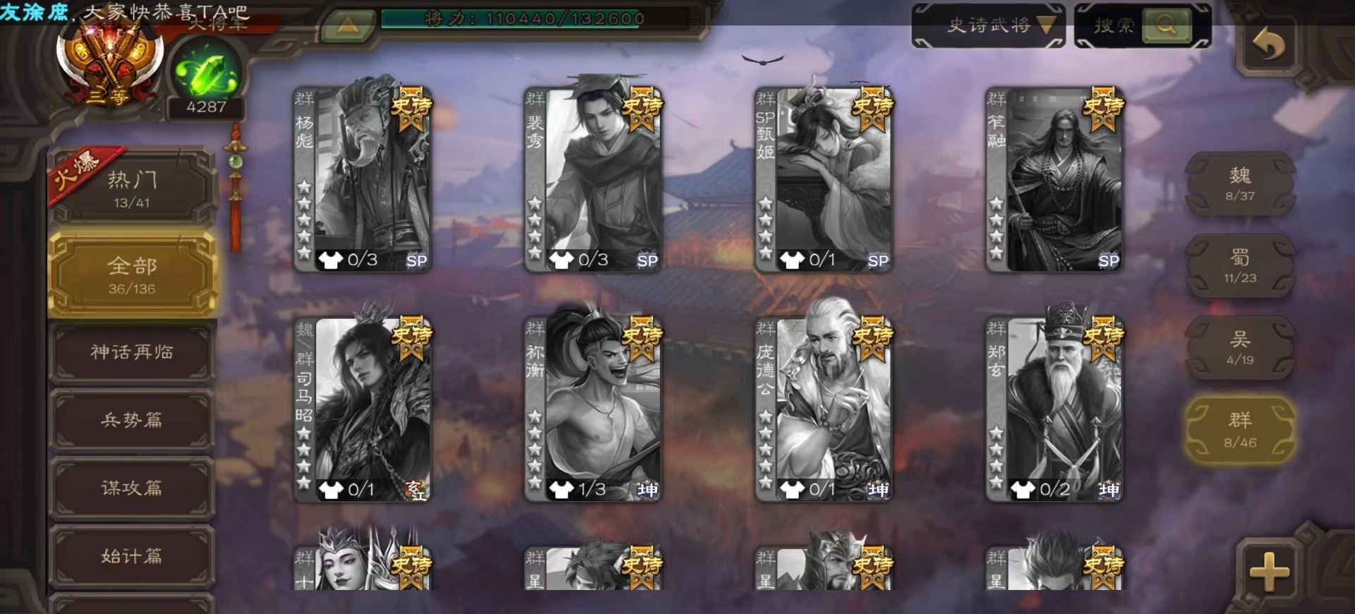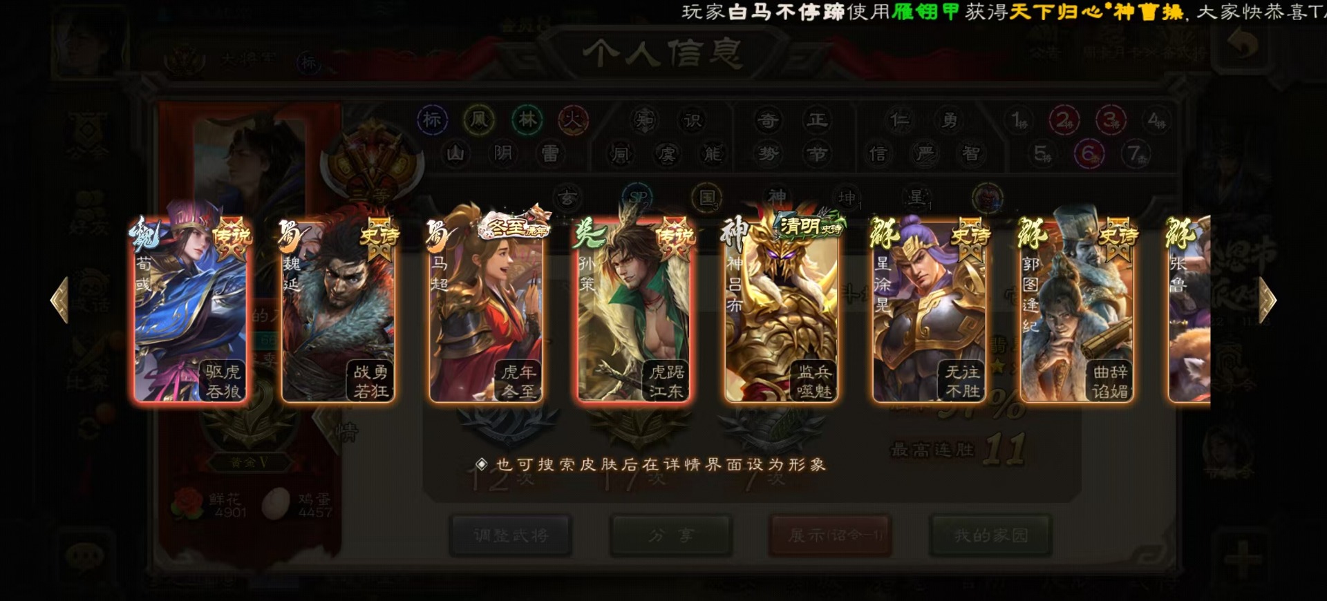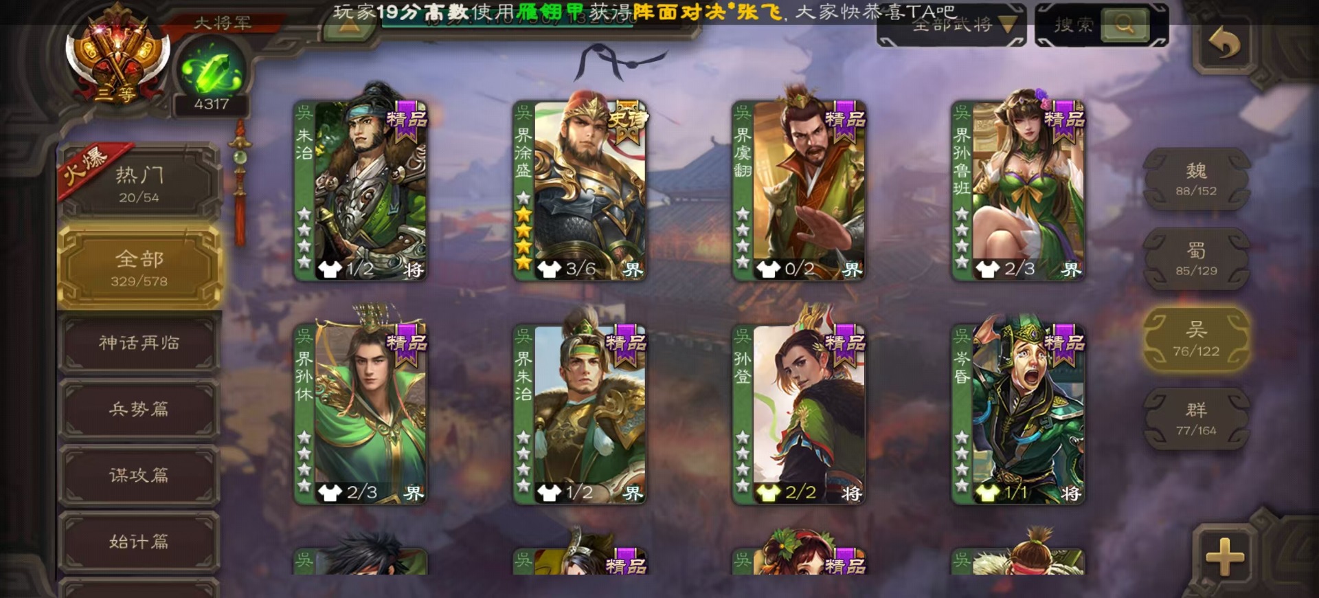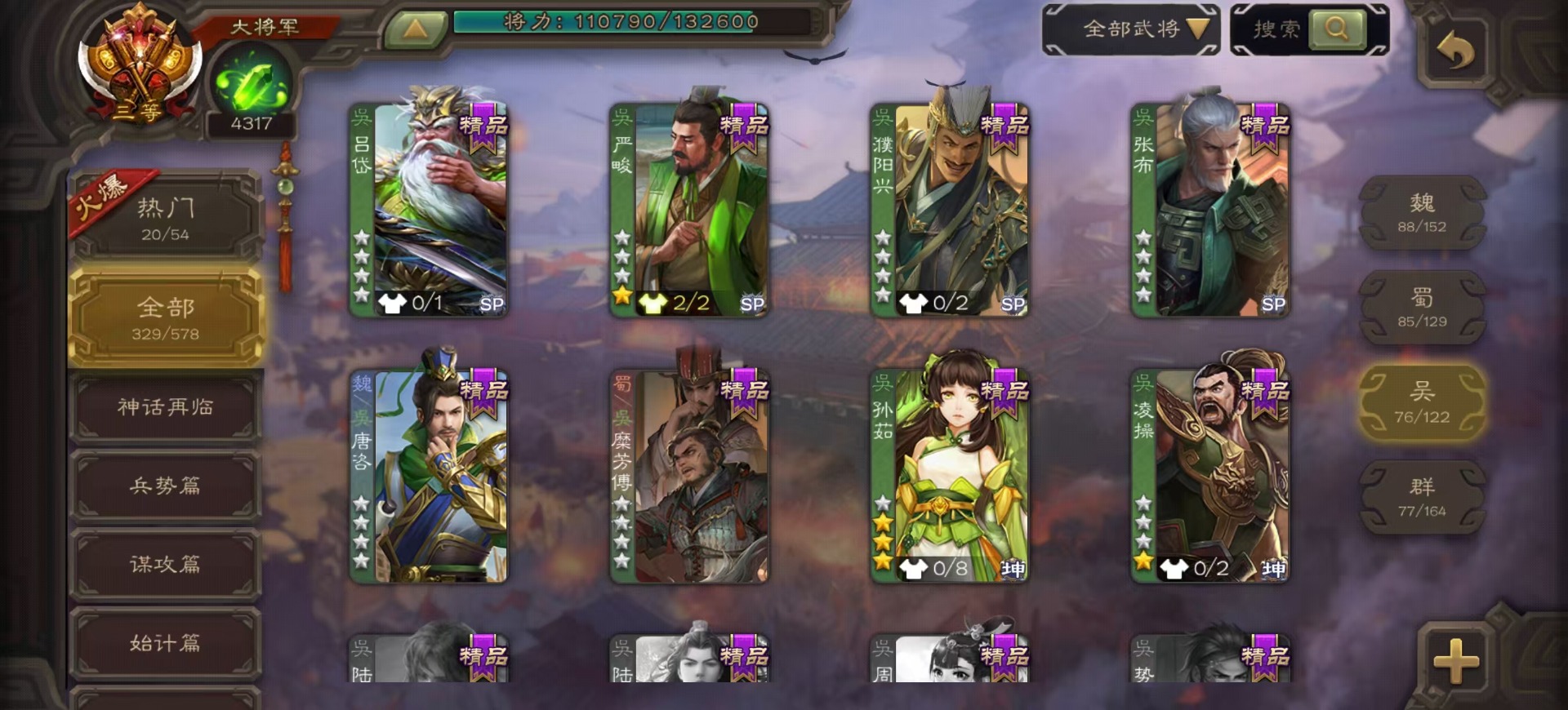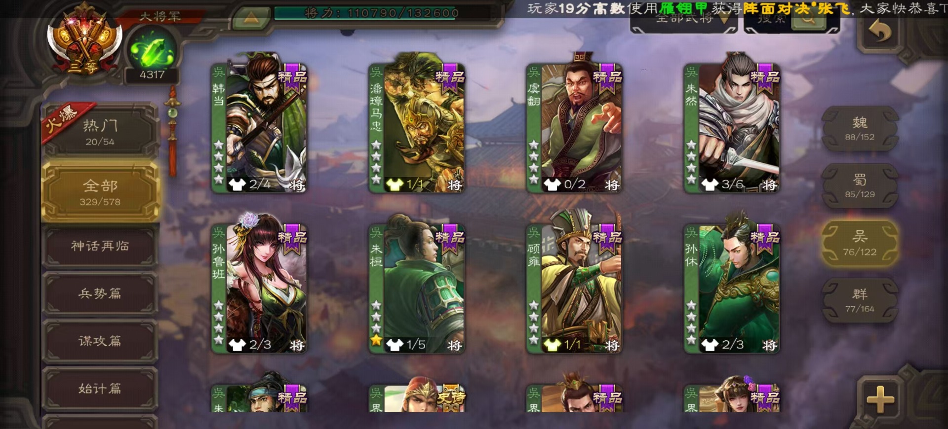 [14525633]vip8 大将军 329武将 40动态皮肤 36史诗武将 4宝珠 【神将】:神吕布神赵云神陆逊神张辽神郭嘉神太史慈 【魏国武将】:星周不疑界钟会程昱陈琳曹婴曹纯戏志才 【蜀国武将】:蜀-谋孙尚香谋赵云谋马超诸葛瞻周群沙摩柯谯周界黄忠花鬘关索董允 【吴国武将】:势陆郁生吴-谋孙尚香吴景界徐盛 【群国武将】:皇甫嵩左慈张让兀突骨苏飞麹义南华老仙界李儒