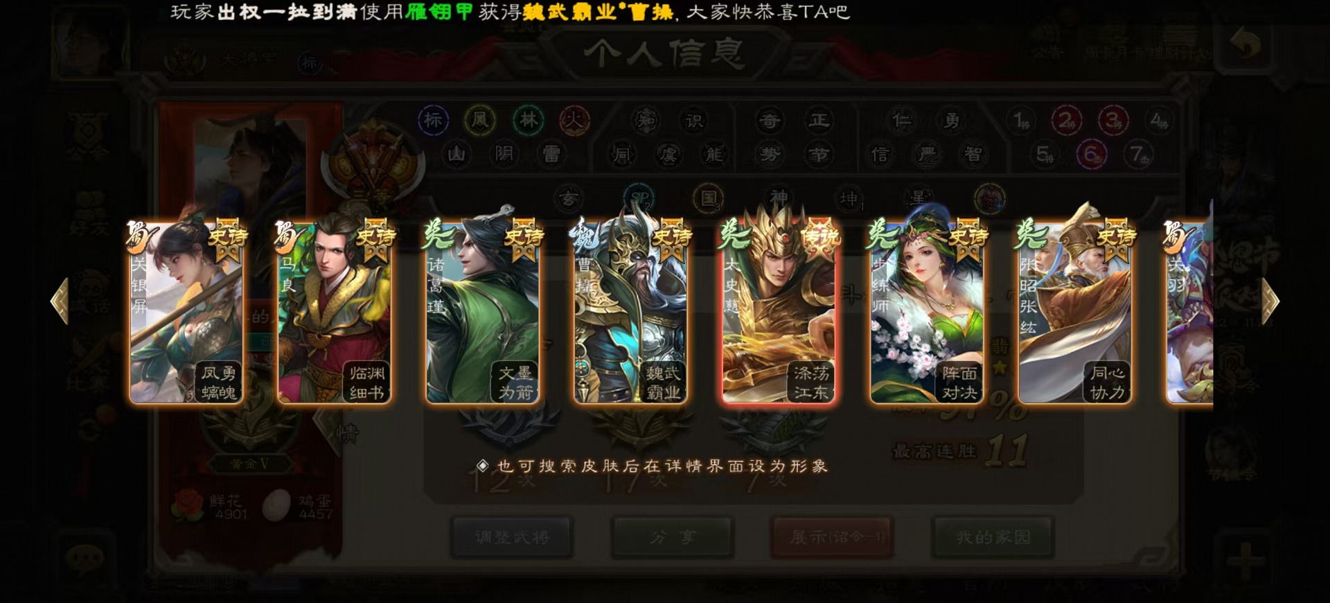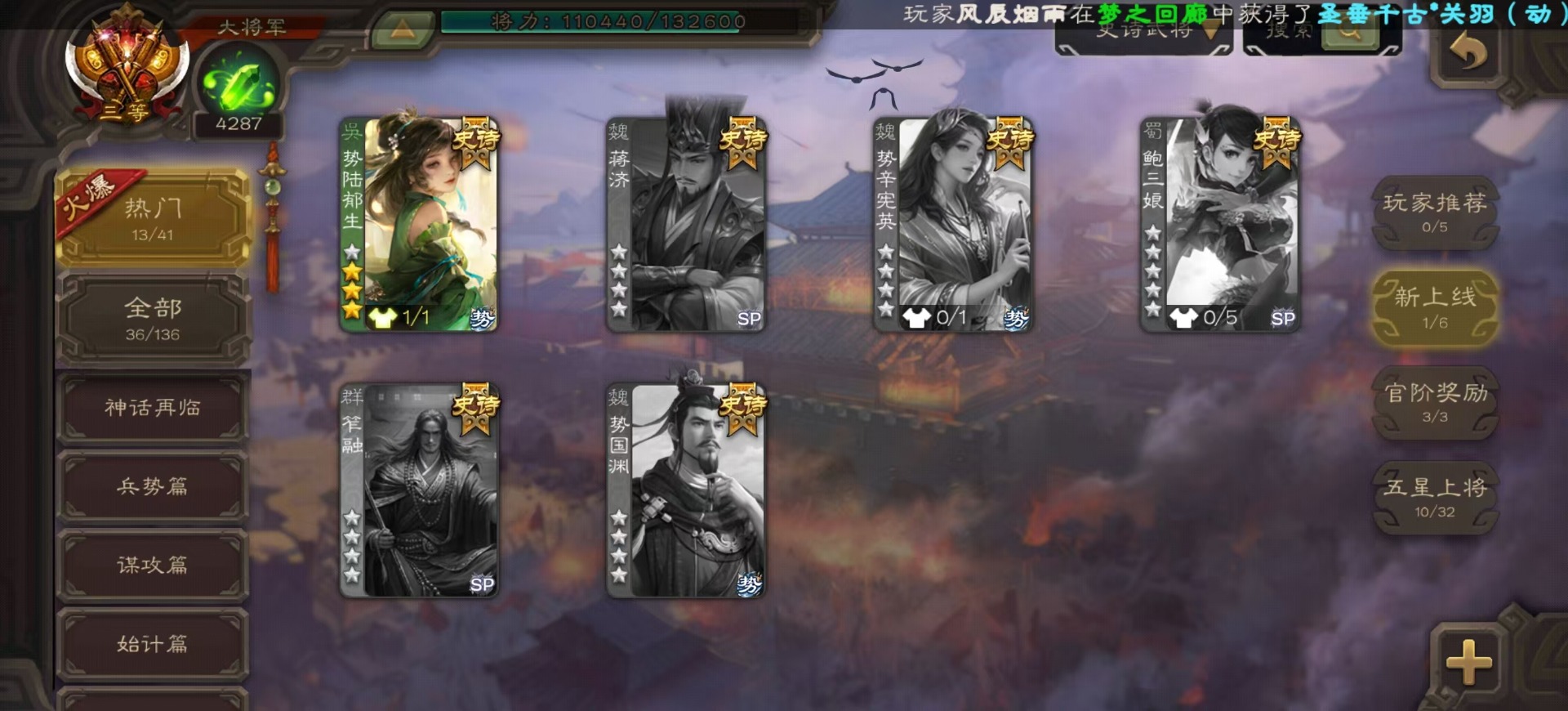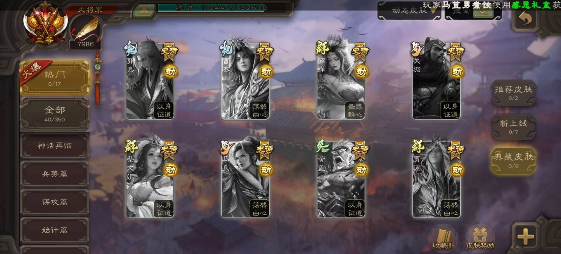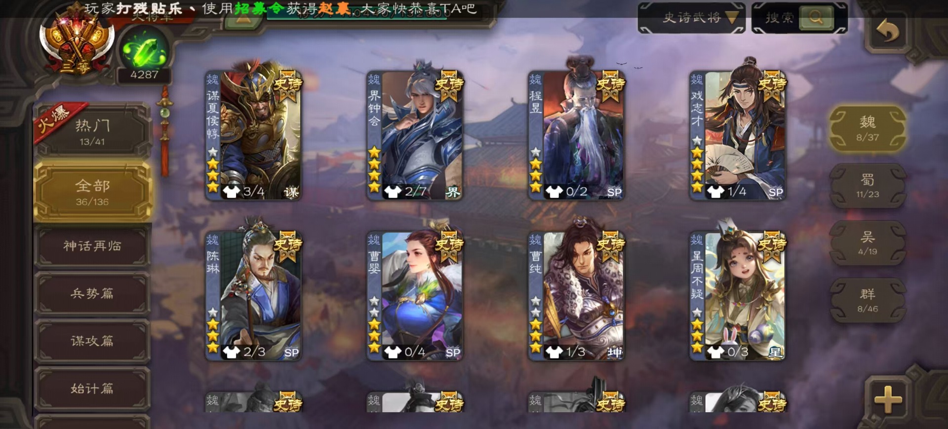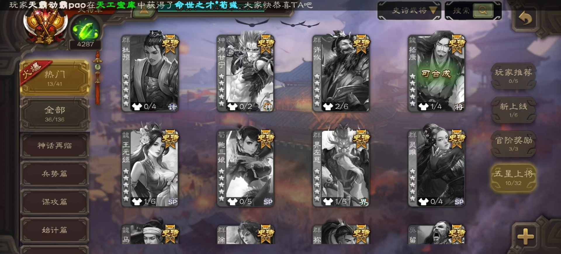 [14525633]vip8 大将军 329武将 40动态皮肤 36史诗武将 4宝珠 【神将】:神吕布神赵云神陆逊神张辽神郭嘉神太史慈 【魏国武将】:星周不疑界钟会程昱陈琳曹婴曹纯戏志才 【蜀国武将】:蜀-谋孙尚香谋赵云谋马超诸葛瞻周群沙摩柯谯周界黄忠花鬘关索董允 【吴国武将】:势陆郁生吴-谋孙尚香吴景界徐盛 【群国武将】:皇甫嵩左慈张让兀突骨苏飞麹义南华老仙界李儒
