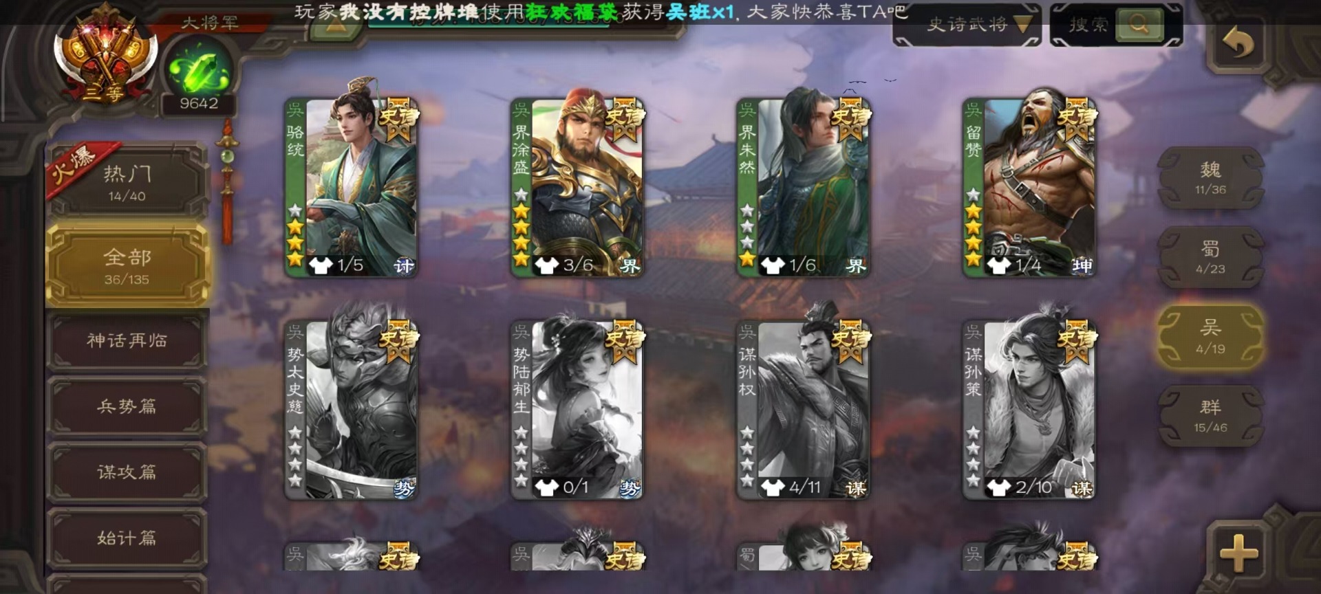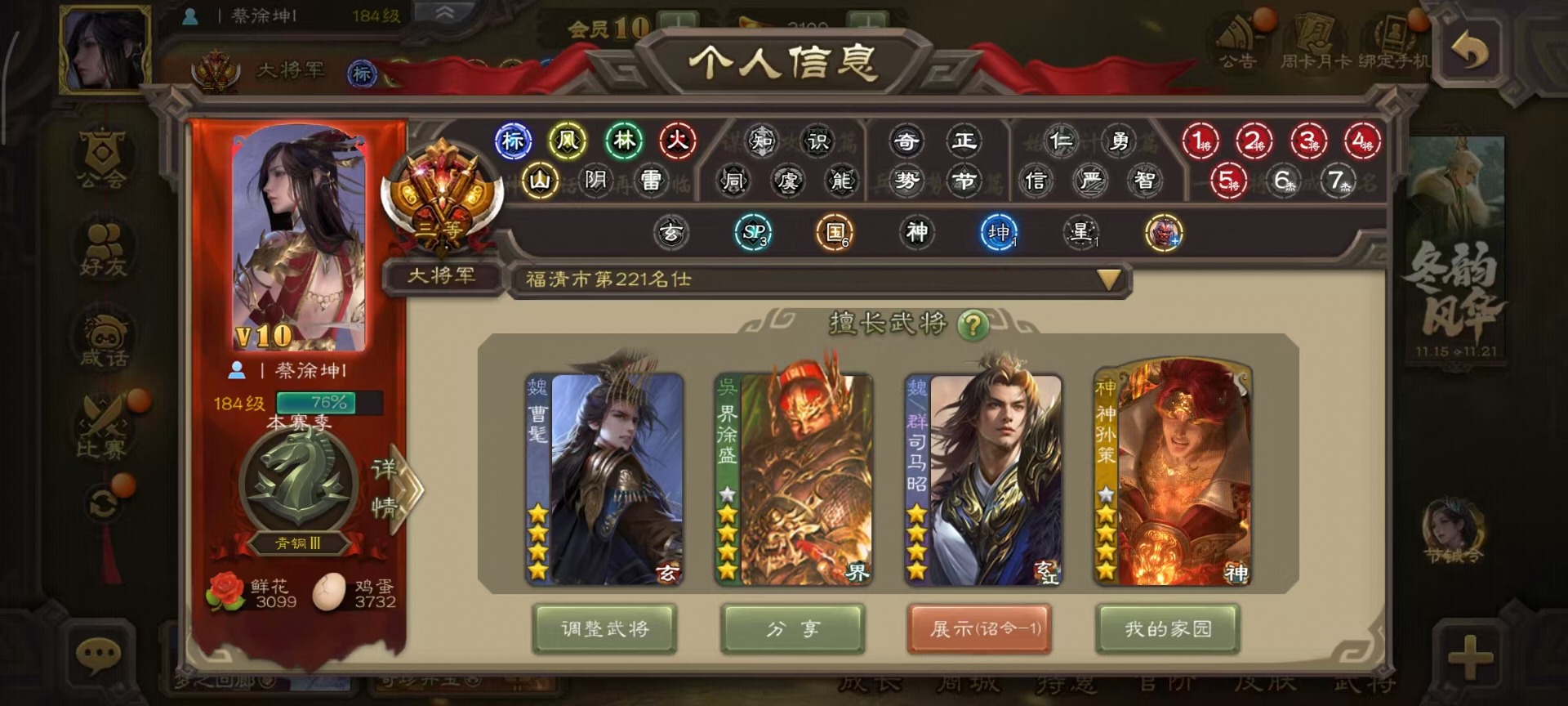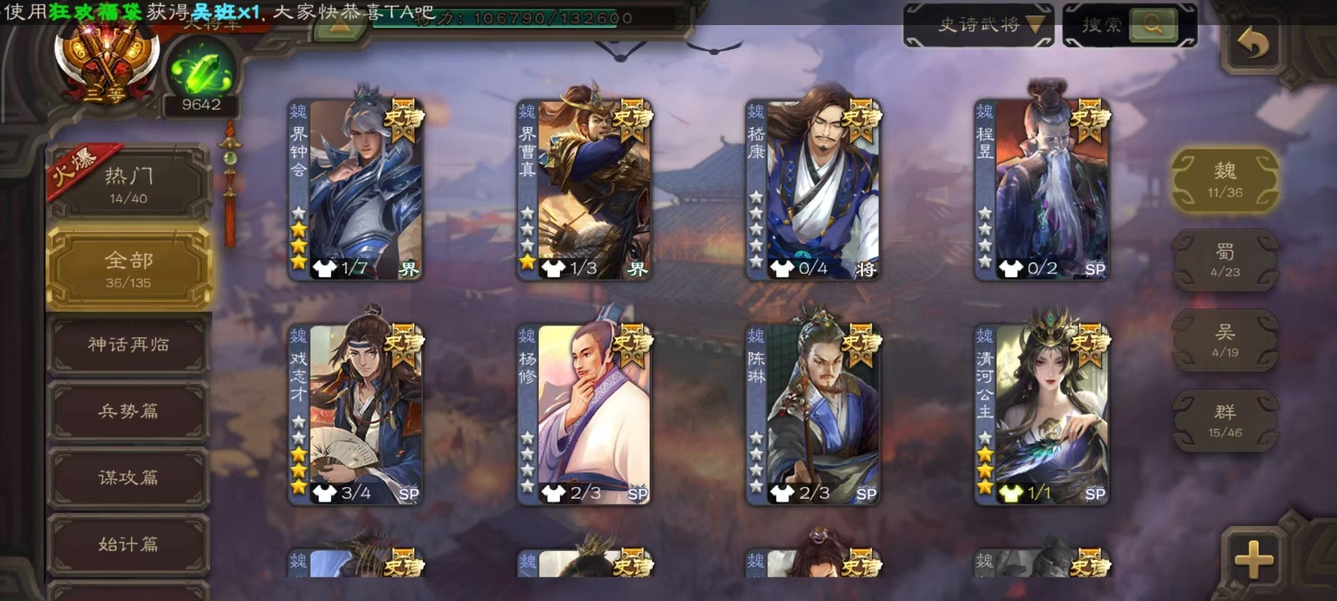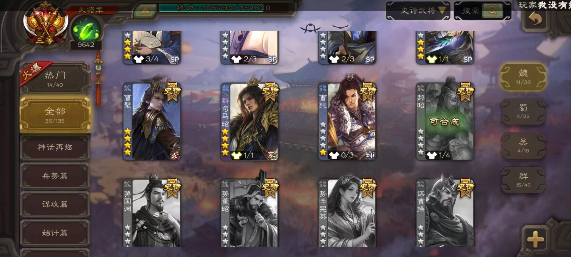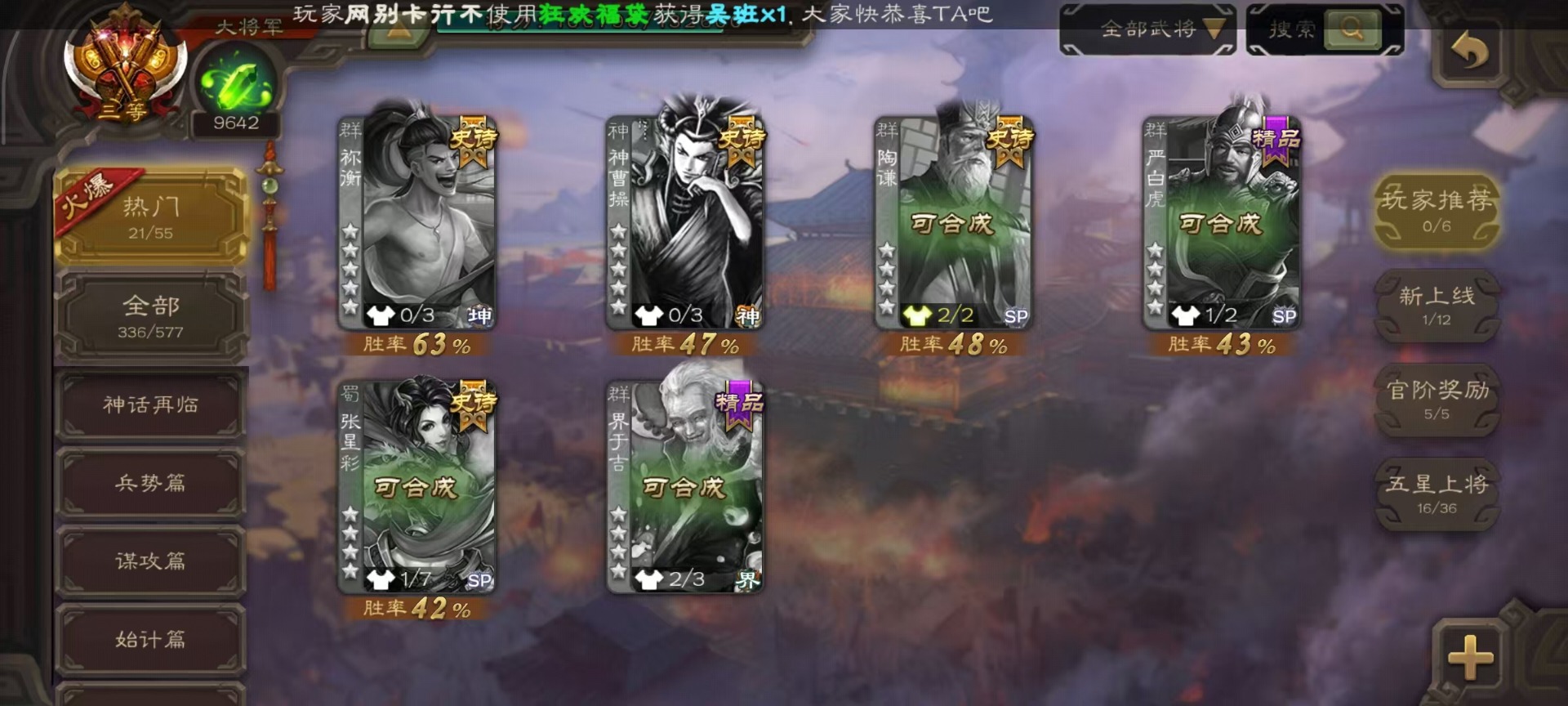[14525688]vip10 大将军 336武将 29动态皮肤 36史诗武将 20宝珠 【神将】:神吕布神赵云神孙策 【魏国武将】:清河公主曹髦杨修魏-司马昭界钟会界曹真嵇康程昱陈琳曹纯戏志才 【蜀国武将】:谋赵云沙摩柯界黄忠花鬘 【吴国武将】:骆统留赞界朱然界徐盛 【群国武将】:星董卓群-司马昭左慈张让星黄忠兀突骨司马徽审配麹义沮授界左慈界李儒卑弥呼谋张角许攸