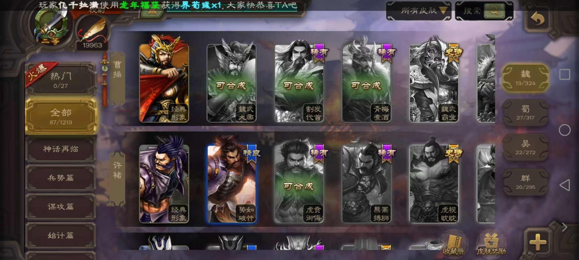 [14575030]vip2 校尉 115武将 2动态皮肤 2史诗武将 【魏国武将】:甄姬司马懿许褚夏侯惇郭嘉曹仁曹操张辽 【吴国武将】:文鸯界徐盛