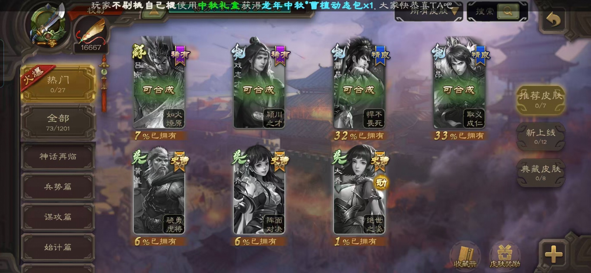 [14619632]vip3 校尉 135武将 3动态皮肤 3史诗武将 【神将】:神张辽 【魏国武将】:张恭甄姬 【蜀国武将】:谋诸葛亮马良诸葛果陈到黄忠诸葛亮张飞 【群国武将】:公孙康