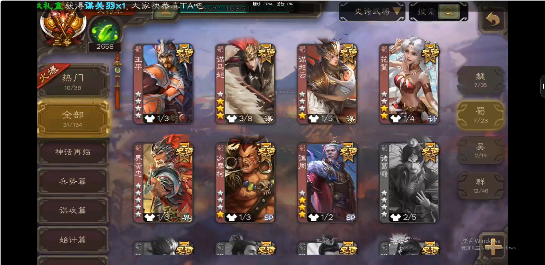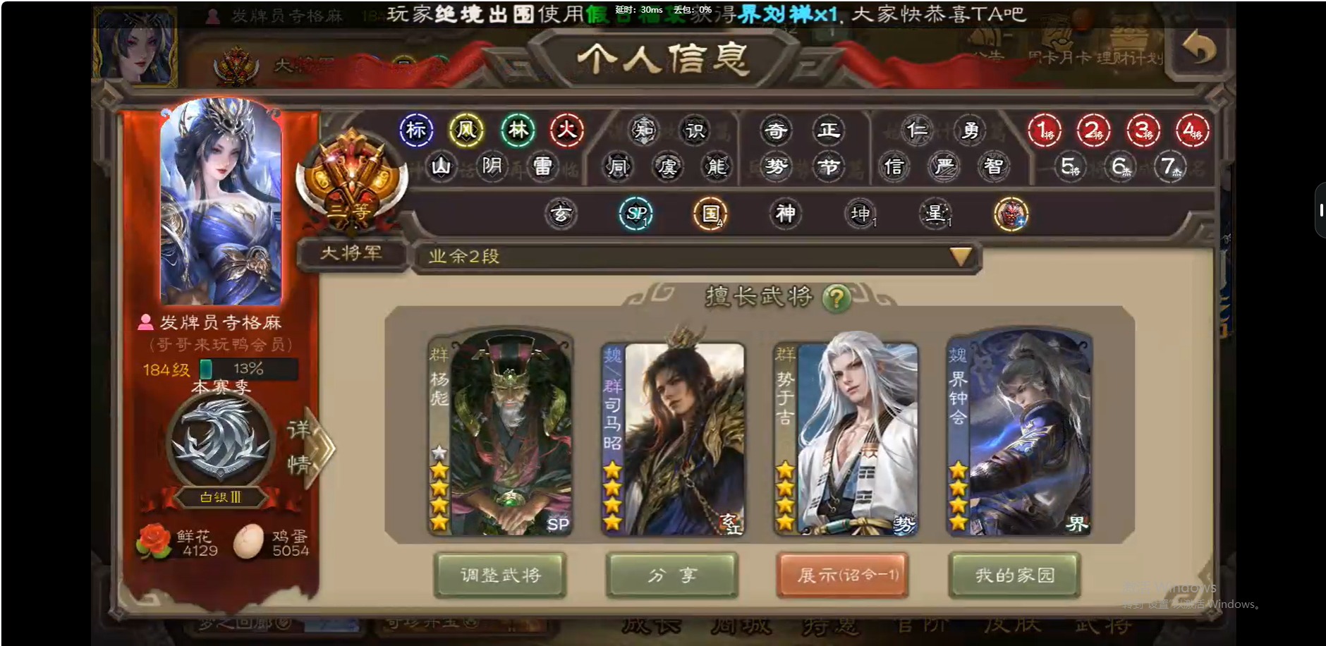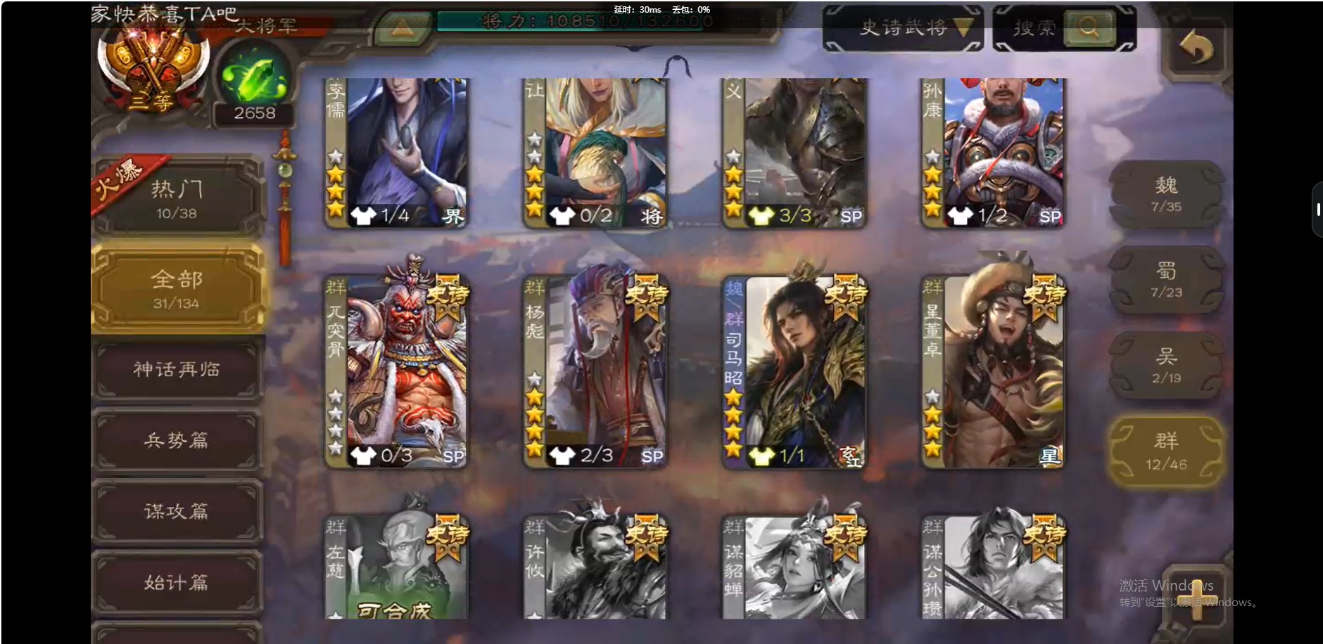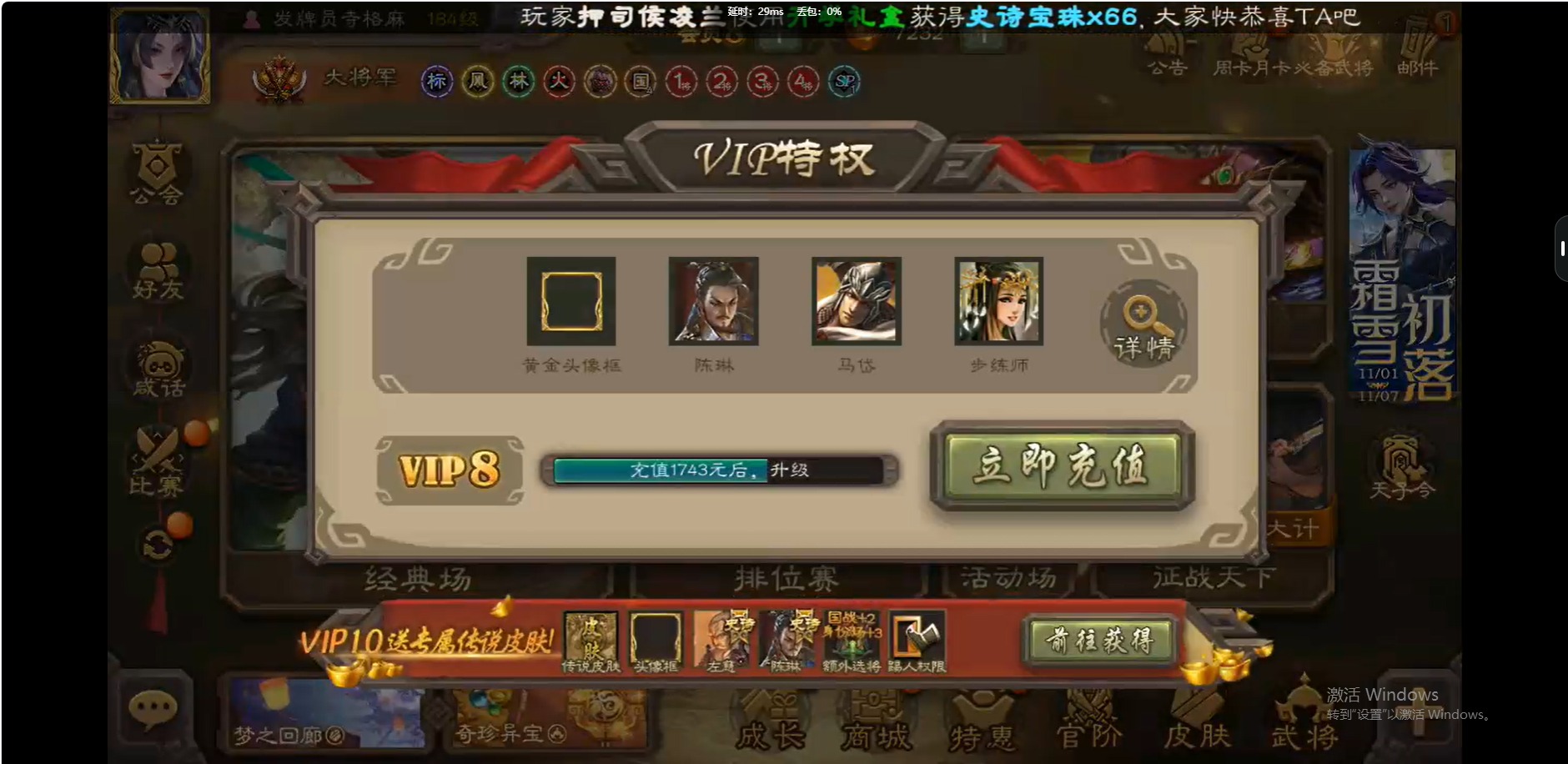 [14619639]vip8 骠骑将军 242武将 11动态皮肤 16史诗武将 【魏国武将】:杨修界钟会界曹真程昱曹纯sp蔡文姬 【蜀国武将】:马云騄谋黄忠谋马超谯周花鬘刘备 【吴国武将】:孙权孙寒华骆统界徐盛 【群国武将】:左慈兀突骨界李儒貂蝉
