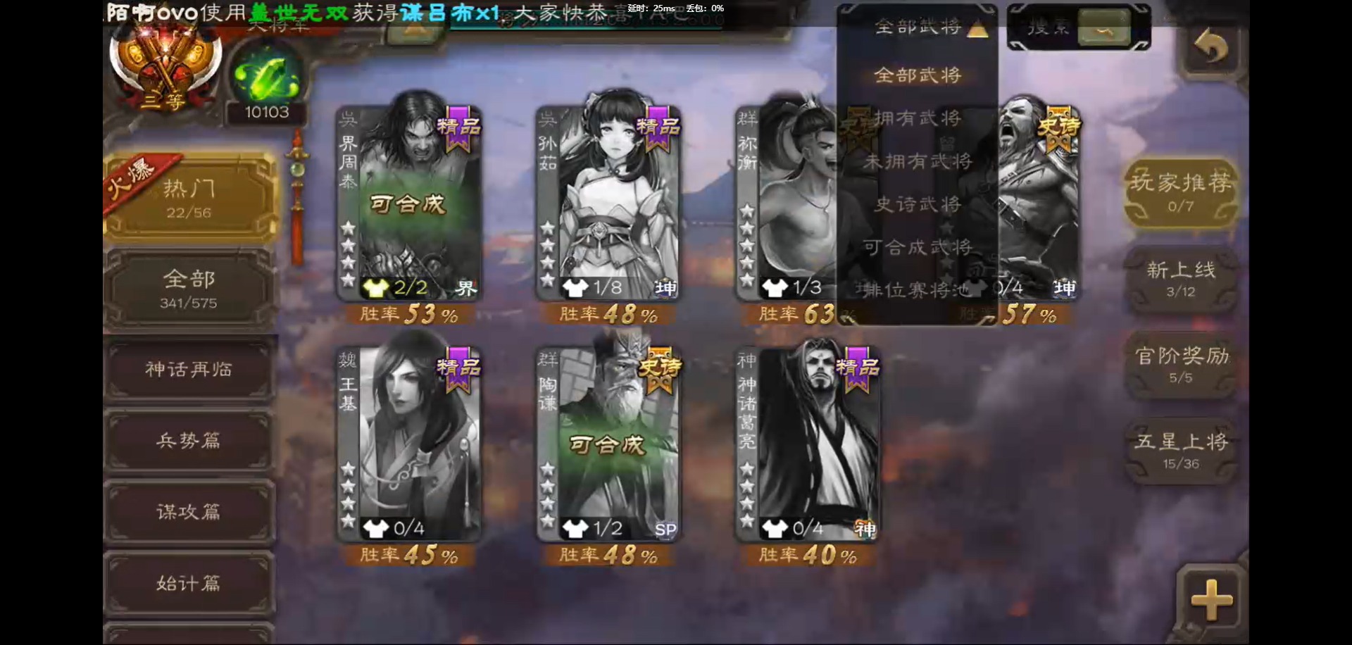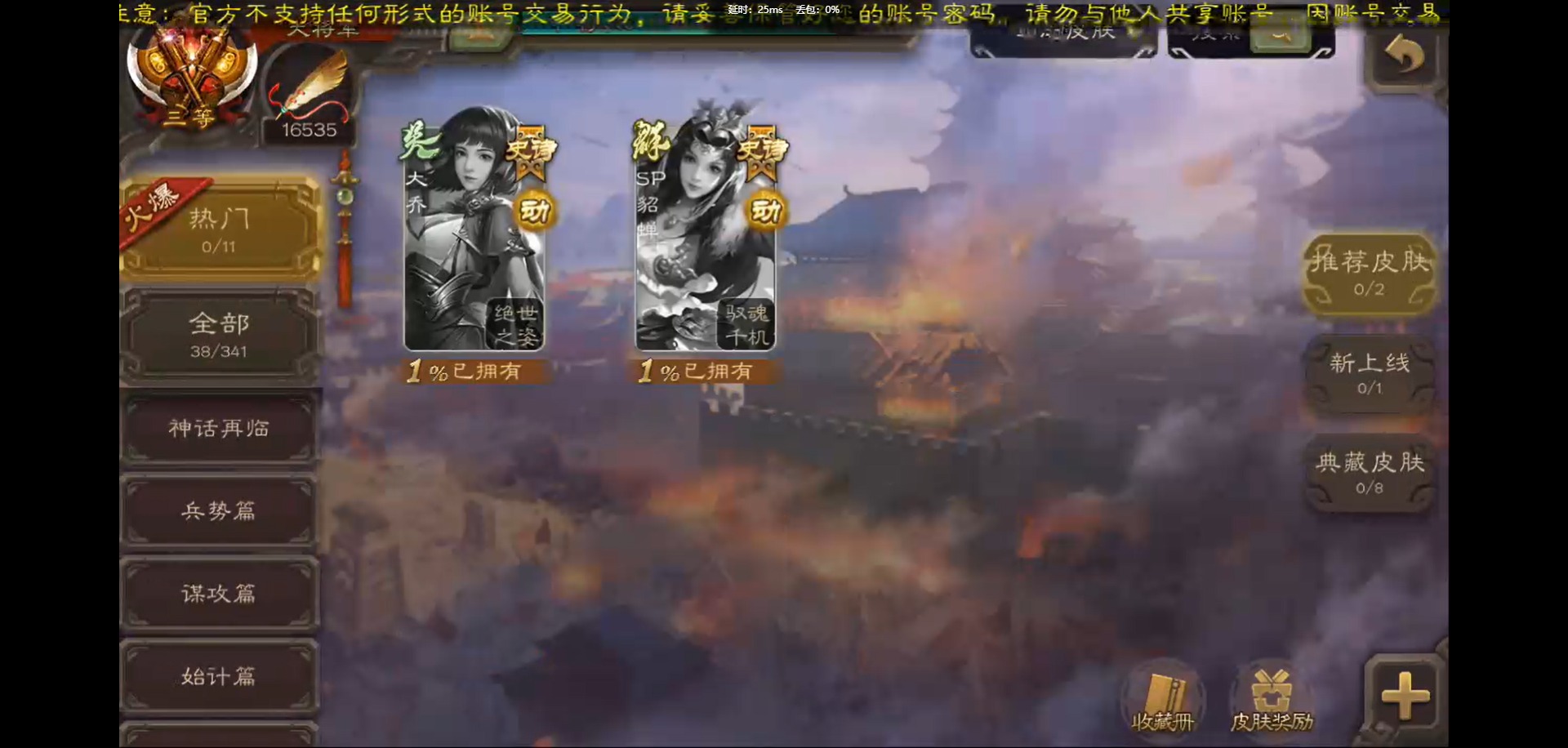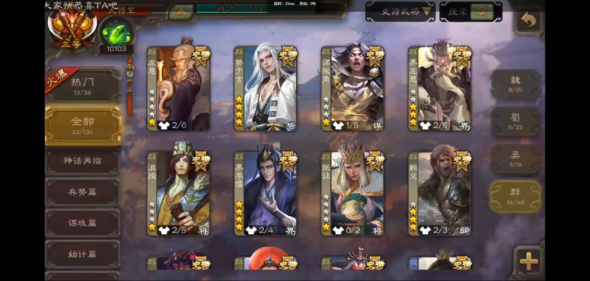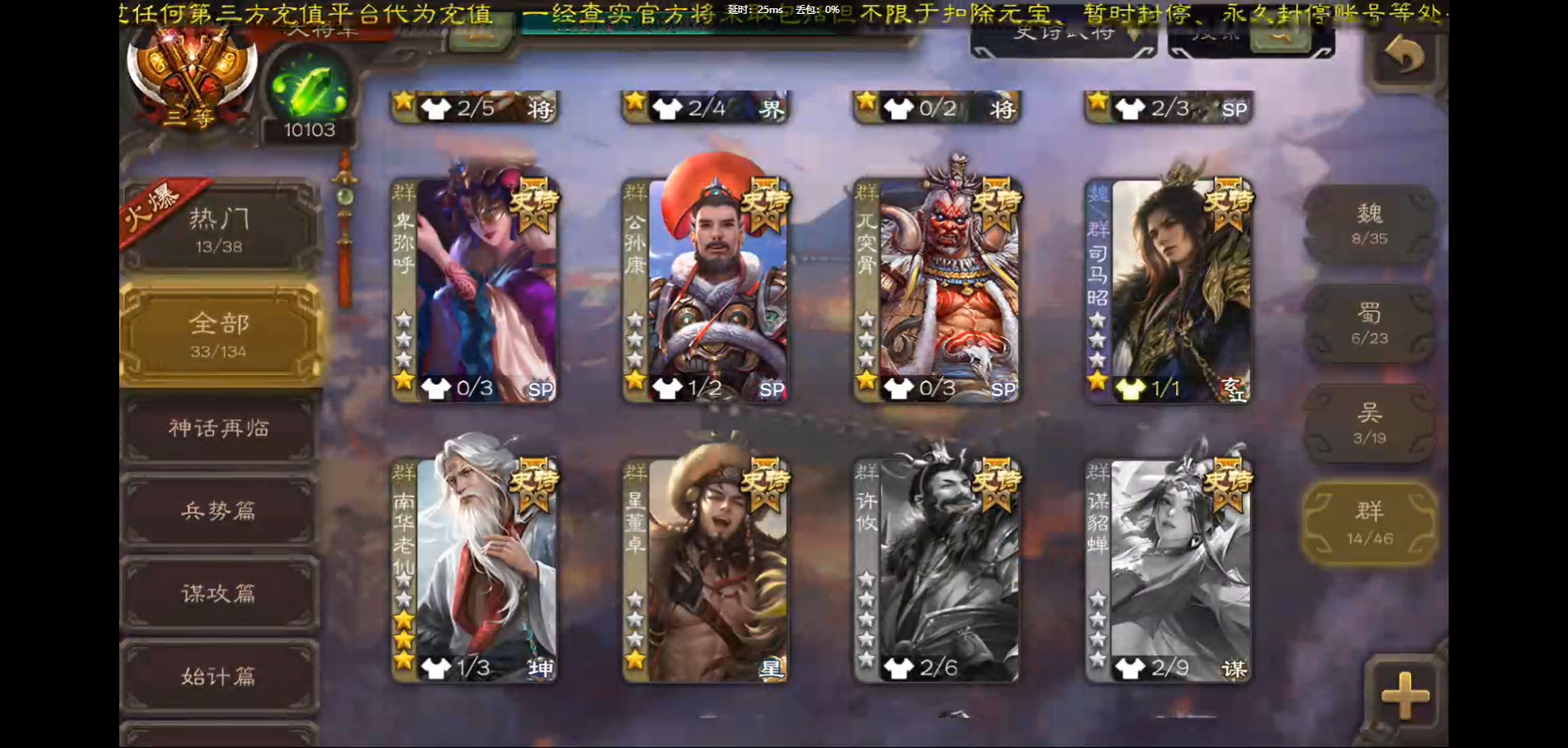 [14619654]vip8 大将军 341武将 38动态皮肤 33史诗武将 【神将】:神吕布神赵云神甘宁神张辽 【魏国武将】:星周不疑文鸯魏-司马昭界钟会界曹真程昱戏志才曹昂 【蜀国武将】:谋诸葛亮谋赵云谋马超沙摩柯谯周界黄忠卧龙诸葛赵云 【吴国武将】:文鸯界徐盛贺齐吕蒙 【群国武将】:星董卓势于吉群-司马昭左慈张让兀突骨麹义南华老仙沮授界左慈界李儒公孙康卑弥呼谋张角李儒许攸袁绍