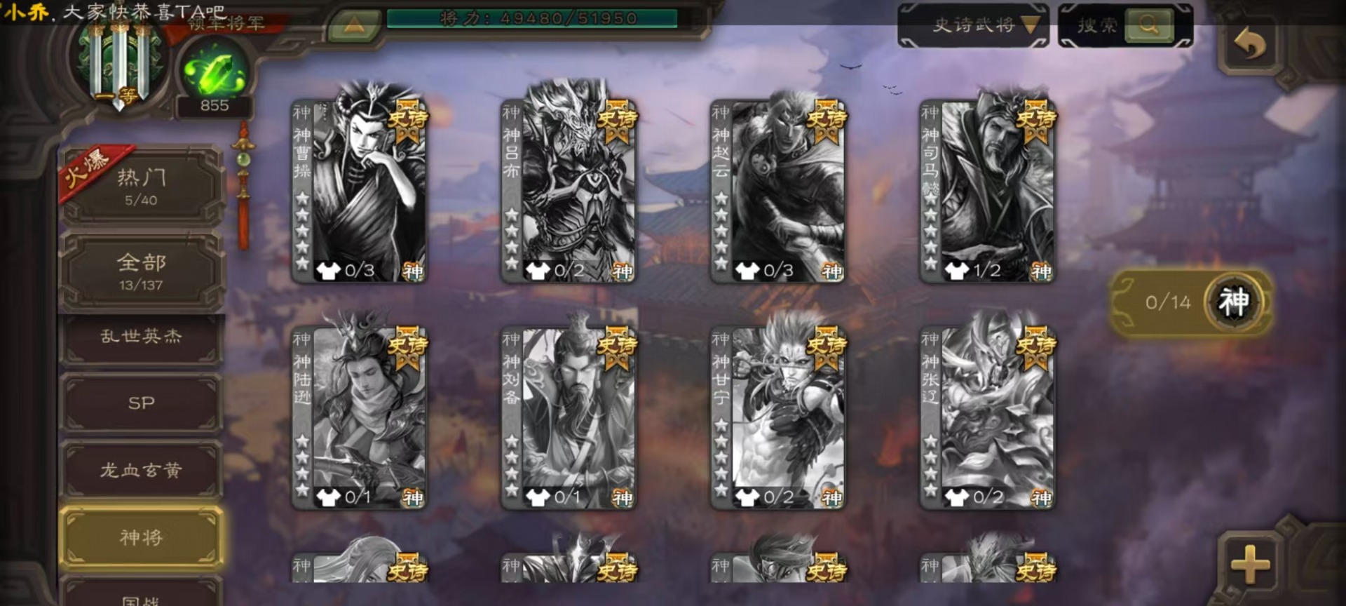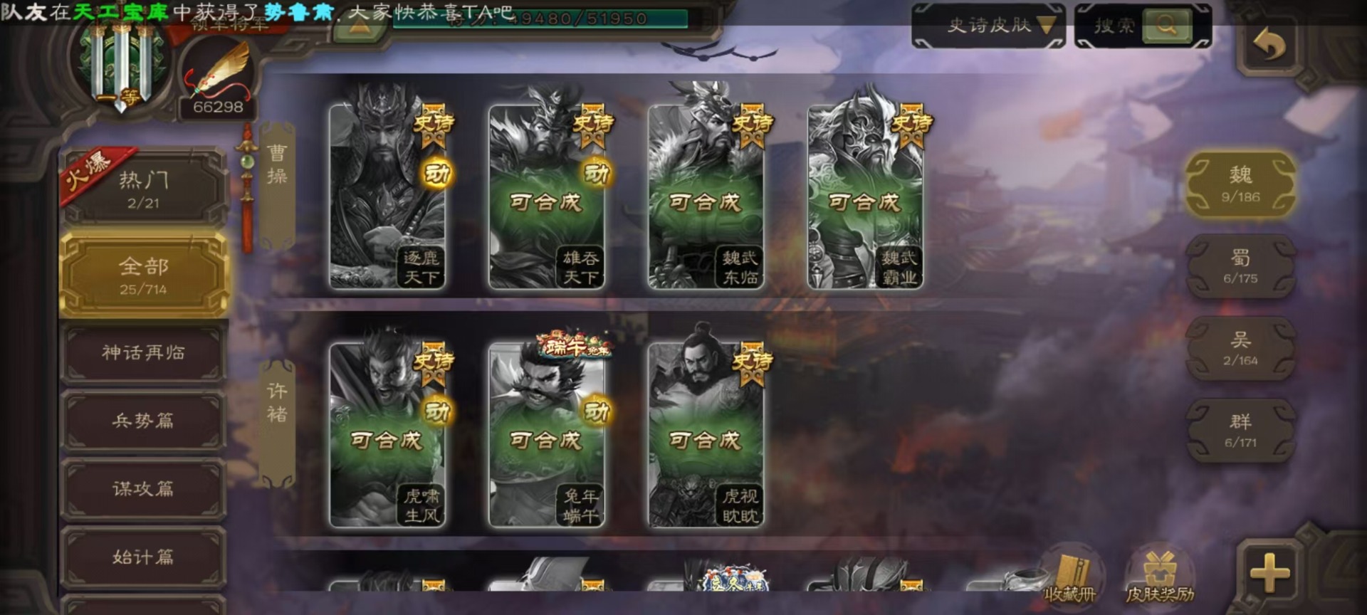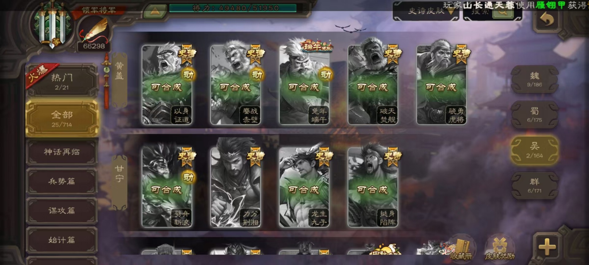 [14630851]vip6 领军将军 222武将 5动态皮肤 13史诗武将 12宝珠 【魏国武将】:星周不疑程昱陈琳曹纯戏志才甄姬司马懿许褚夏侯惇郭嘉曹仁曹操张辽 【蜀国武将】:赵襄谯周界黄忠花鬘 【吴国武将】:周处 【群国武将】:裴秀左慈张琪瑛