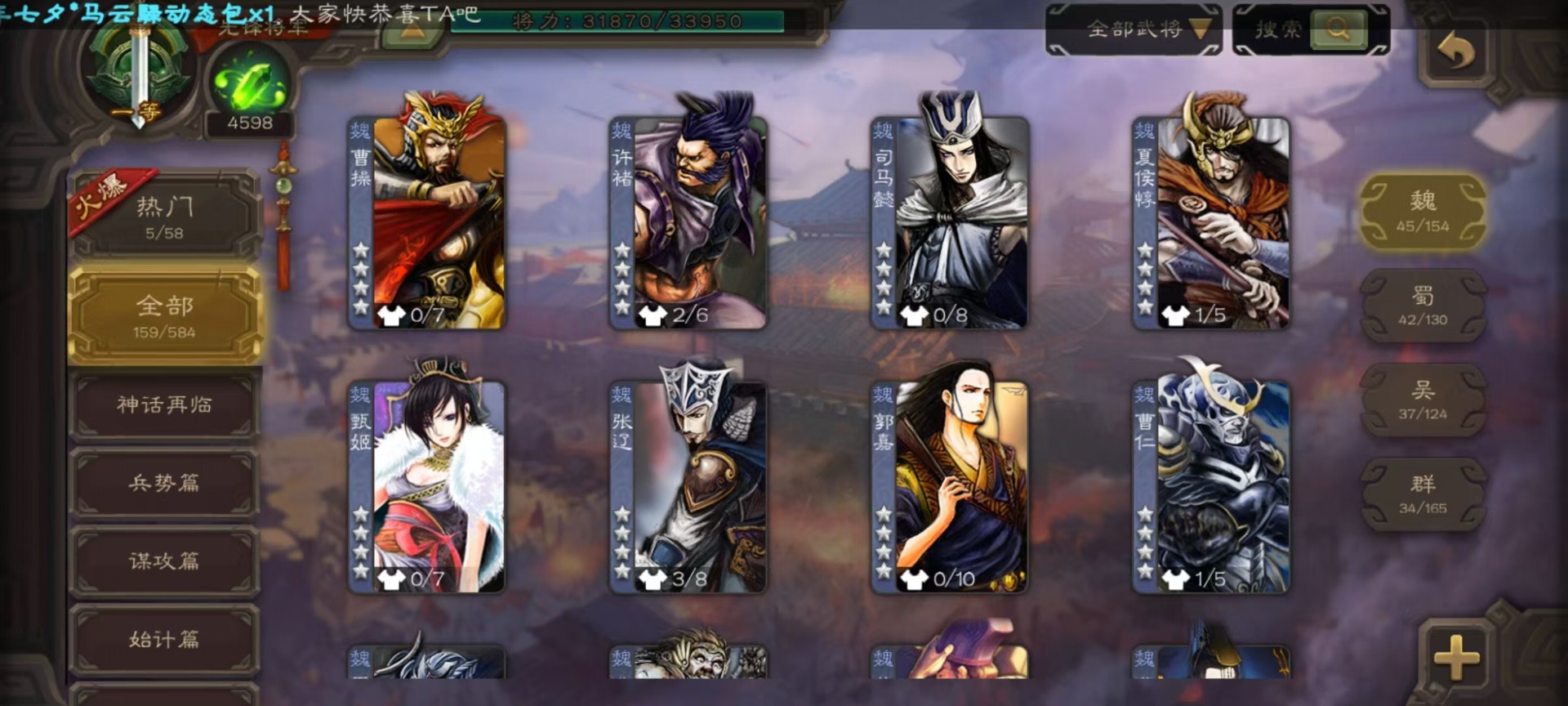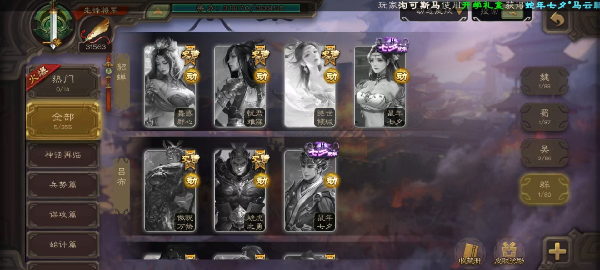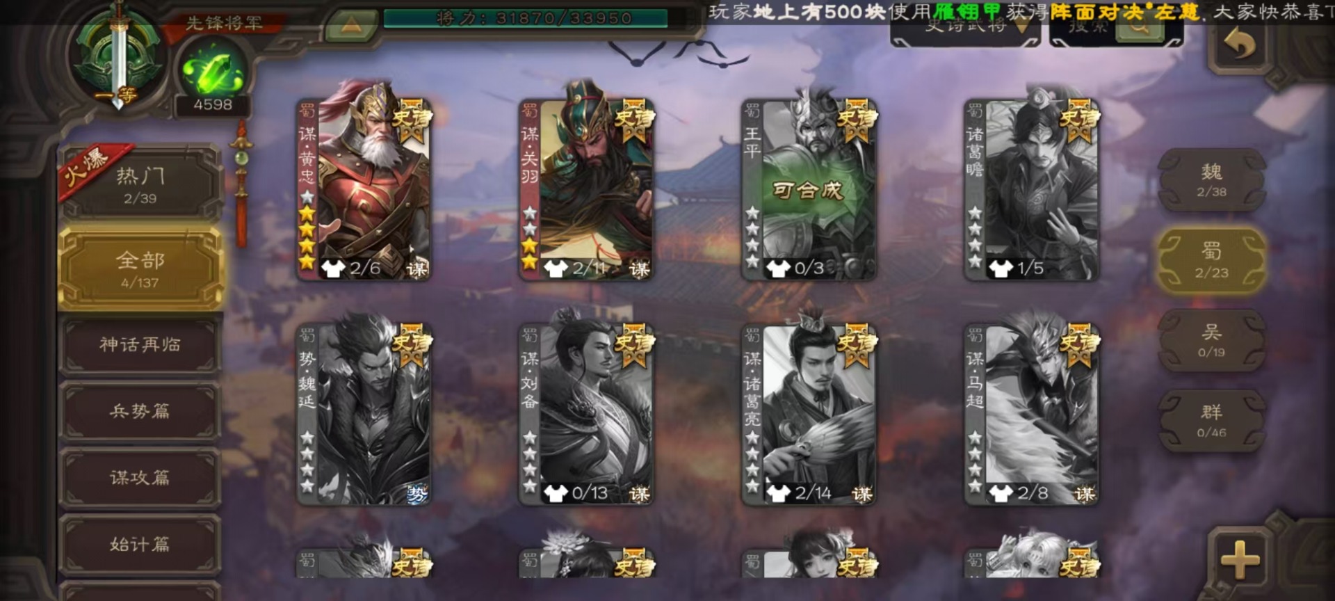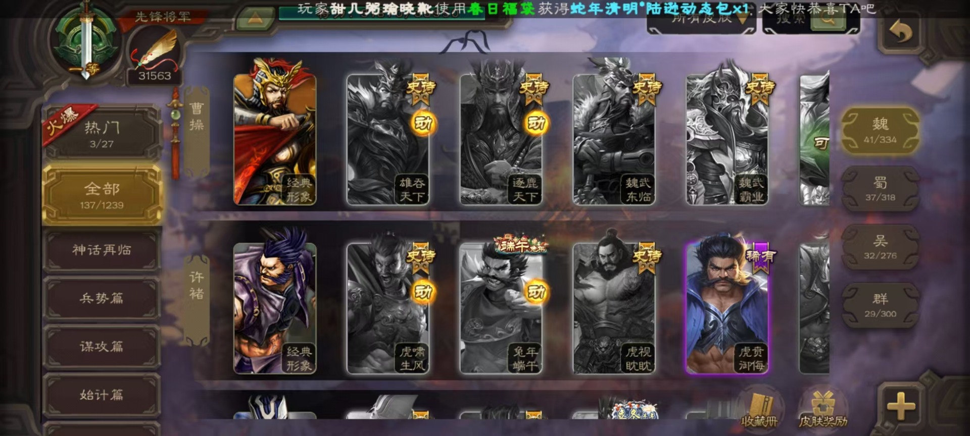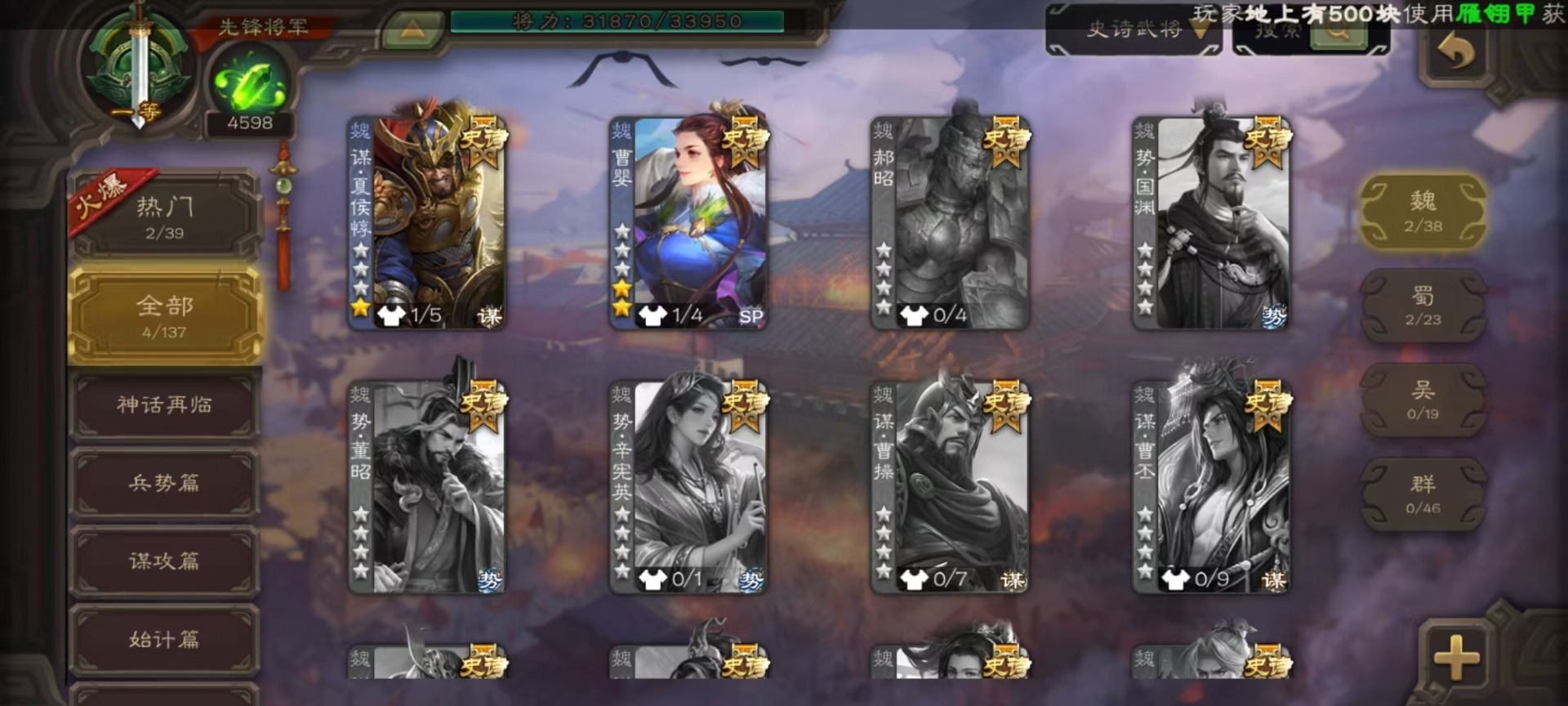 [14630876]vip4 先锋将军 159武将 5动态皮肤 4史诗武将 1宝珠 【魏国武将】:曹婴谋夏侯惇甄姬司马懿许褚夏侯惇郭嘉曹仁曹操张辽 【蜀国武将】:谋黄忠谋关羽