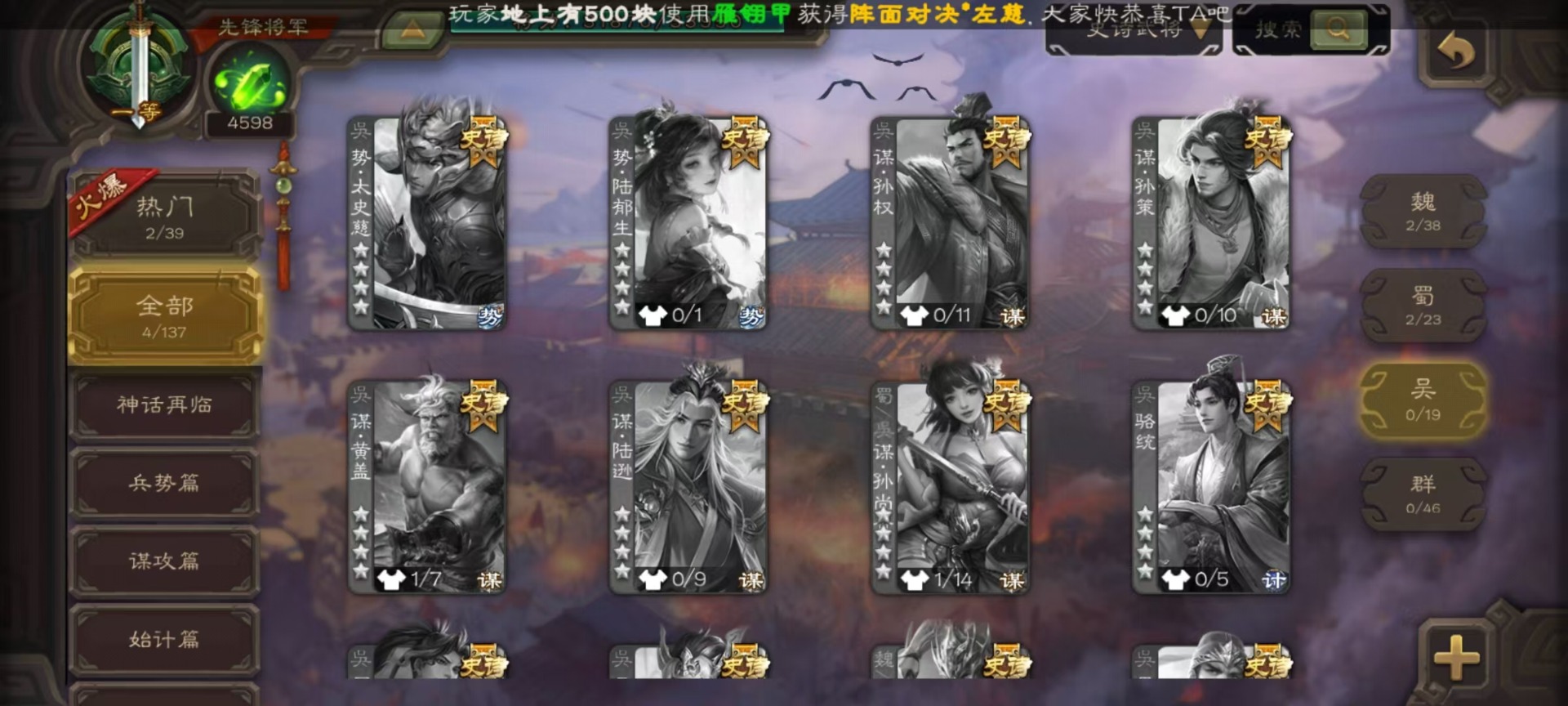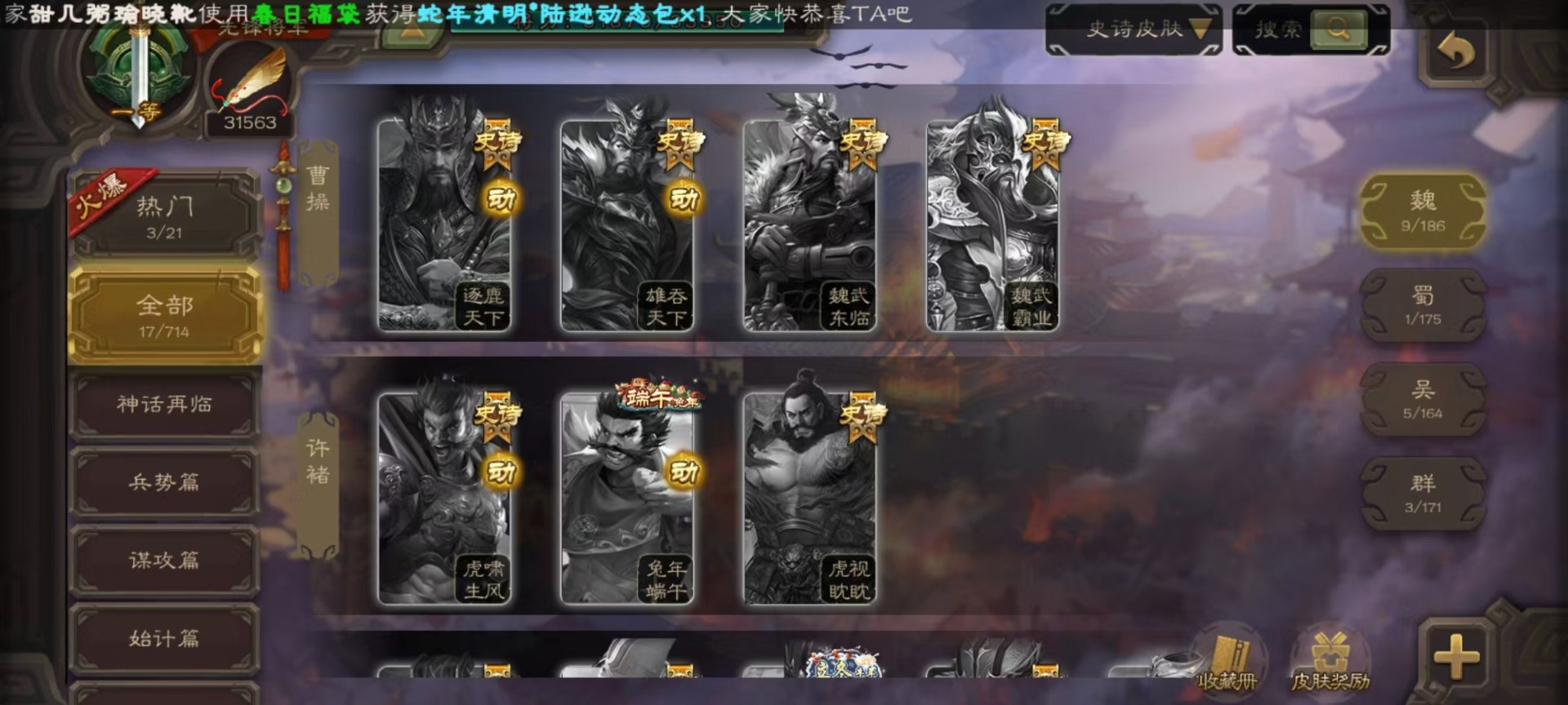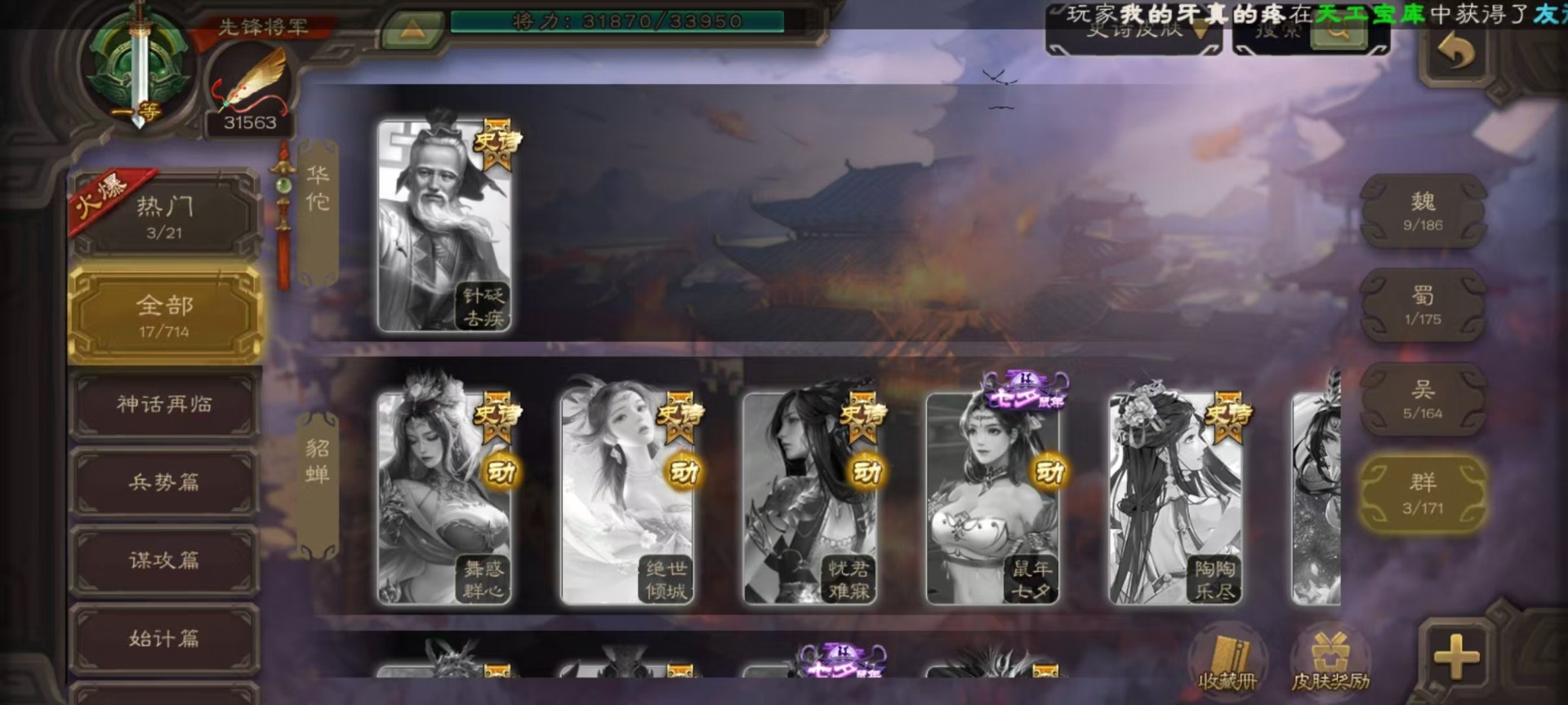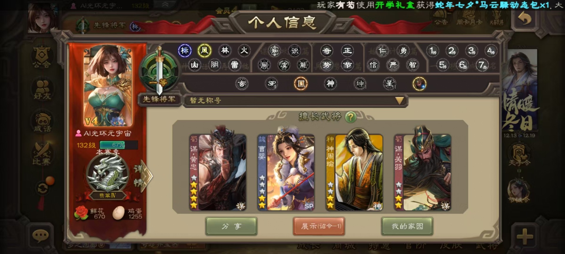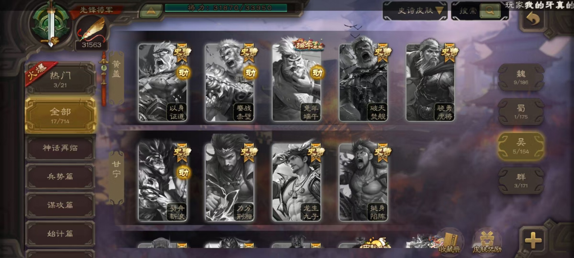 [14630876]vip4 先锋将军 159武将 5动态皮肤 4史诗武将 1宝珠 【魏国武将】:曹婴谋夏侯惇甄姬司马懿许褚夏侯惇郭嘉曹仁曹操张辽 【蜀国武将】:谋黄忠谋关羽