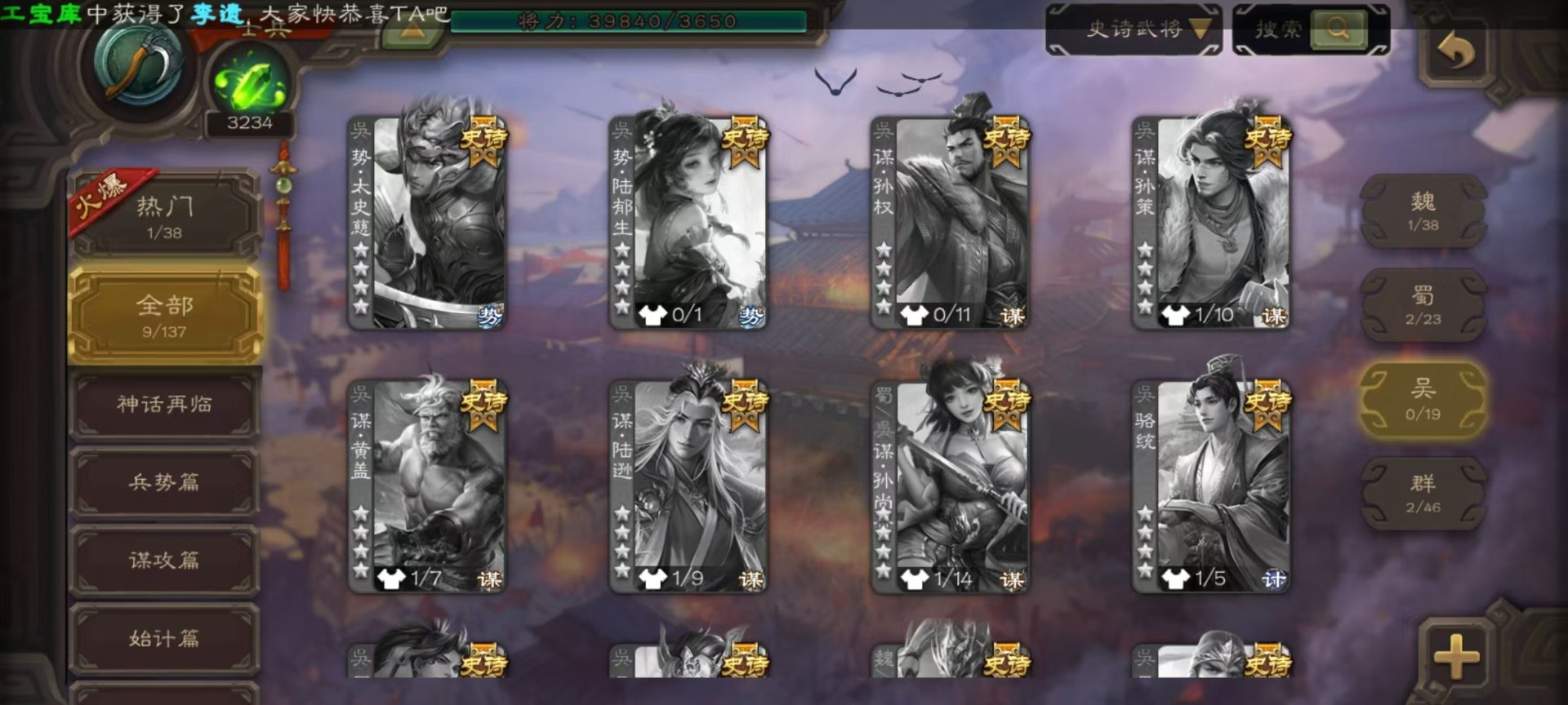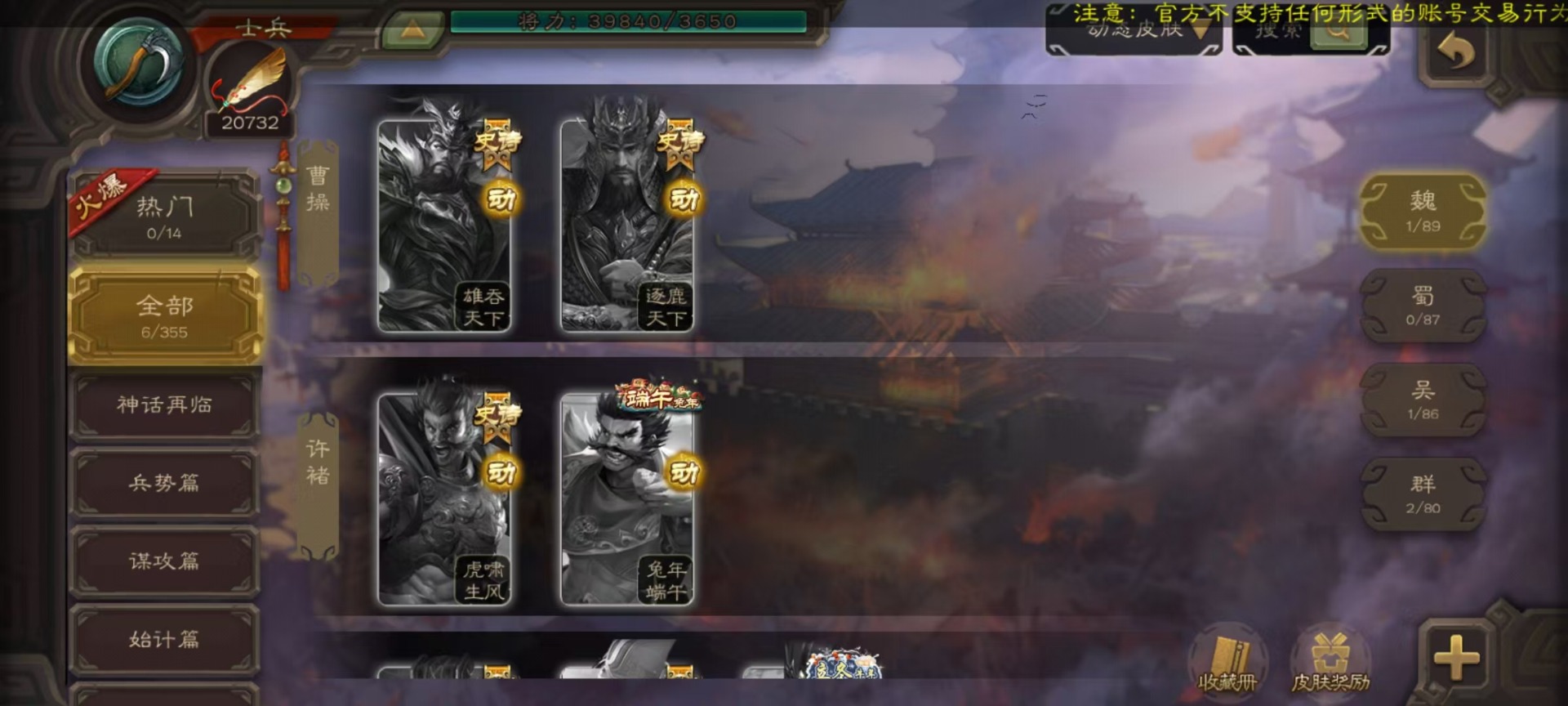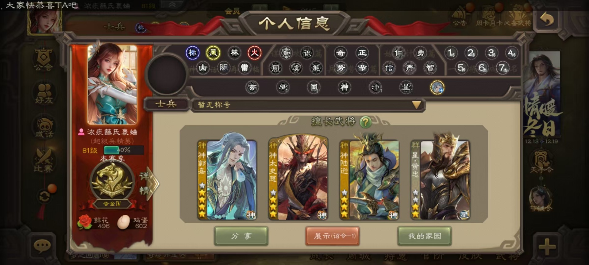 [14631007]vip8 士兵 181武将 6动态皮肤 9史诗武将 6宝珠 【神将】:神陆逊神张辽神郭嘉神太史慈 【魏国武将】:界钟会甄姬司马懿许褚夏侯惇郭嘉曹仁曹操 【蜀国武将】:谯周花鬘 【群国武将】:星黄忠界李儒