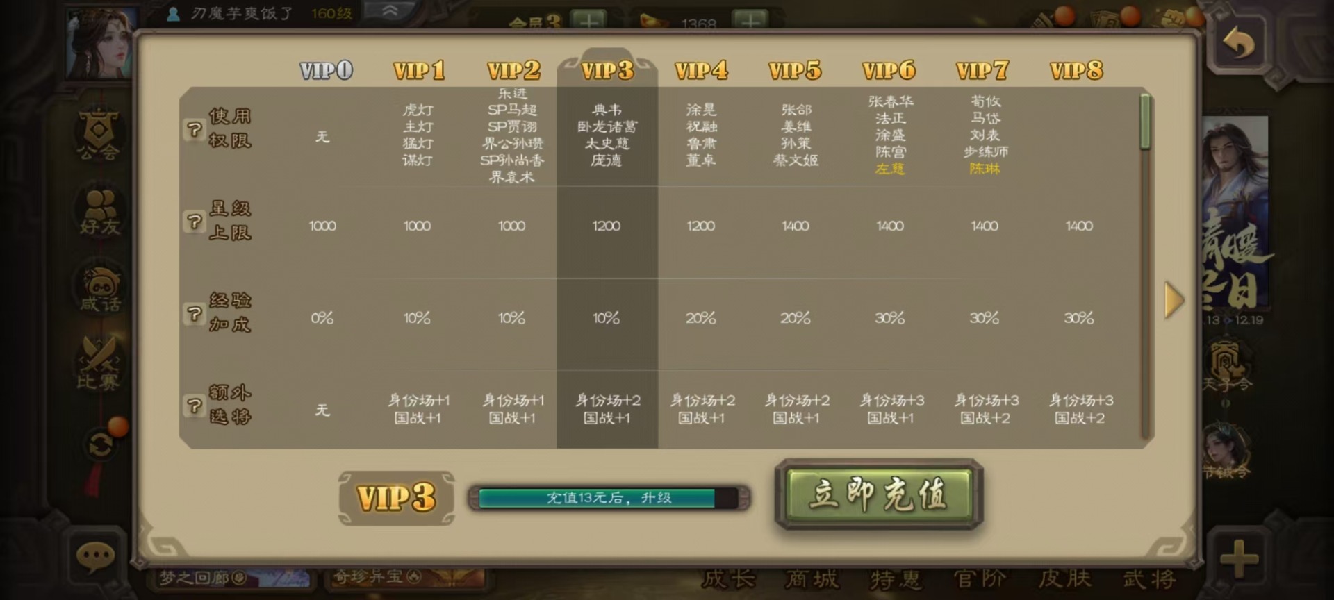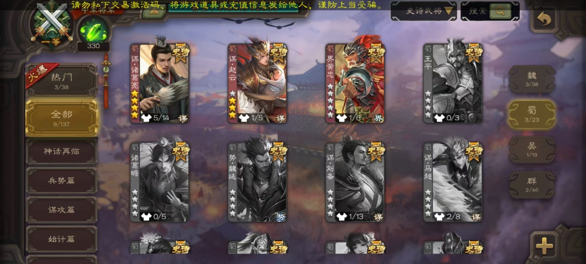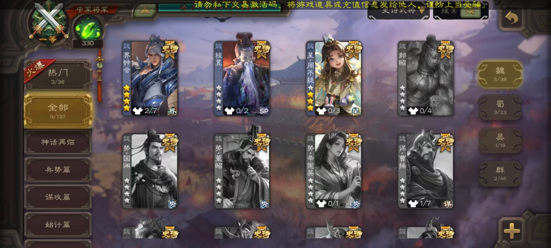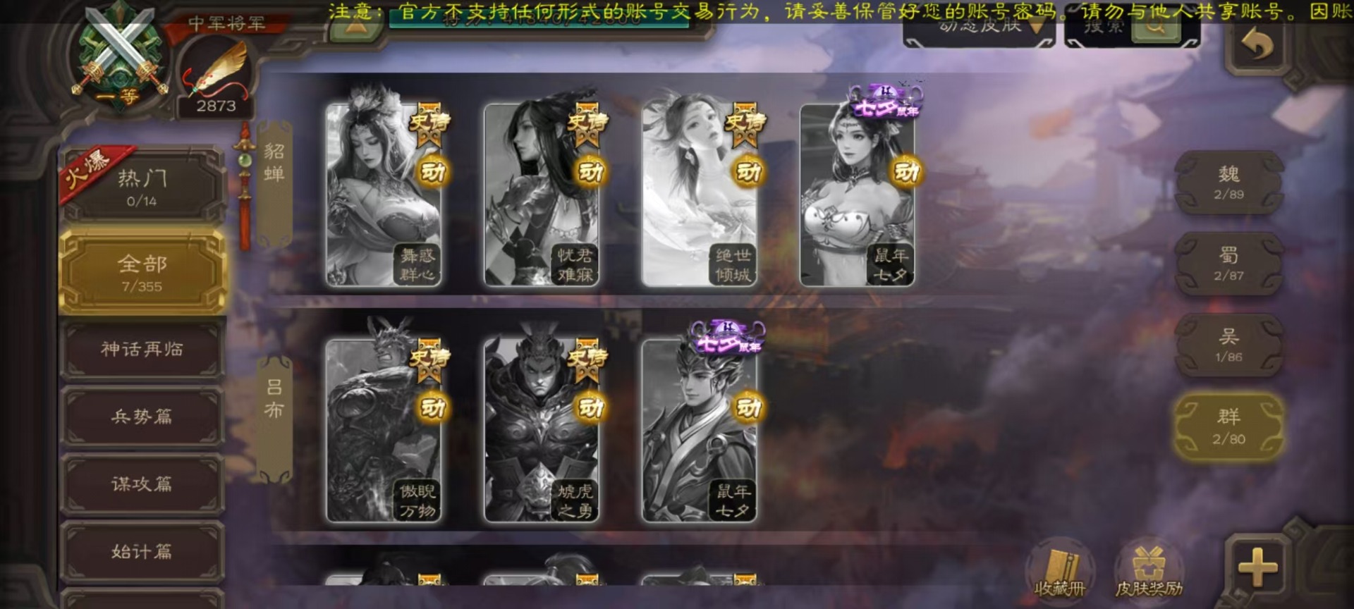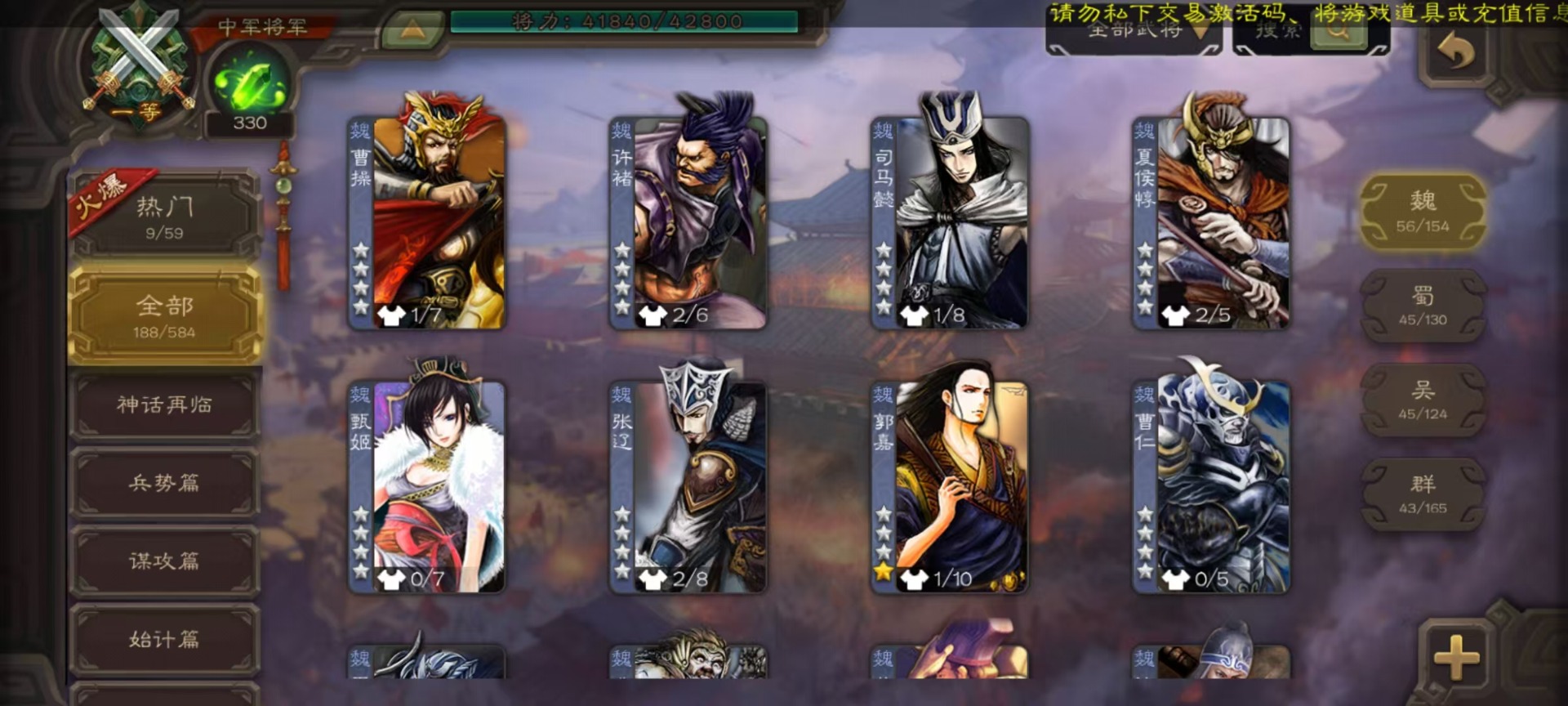 [14631164]vip3 中军将军 188武将 7动态皮肤 9史诗武将 【魏国武将】:星周不疑界钟会程昱甄姬司马懿许褚夏侯惇郭嘉曹仁曹操张辽 【蜀国武将】:谋诸葛亮谋赵云界黄忠 【吴国武将】:界徐盛 【群国武将】:星黄忠麹义
