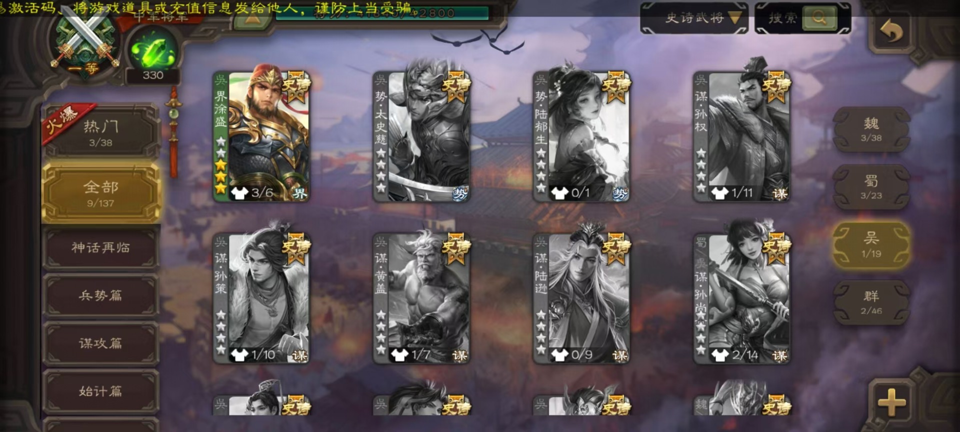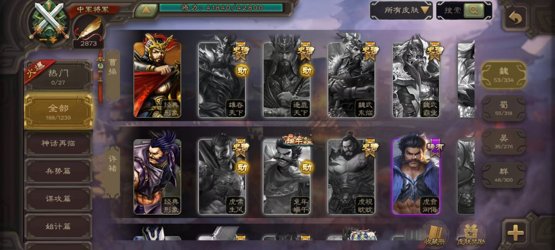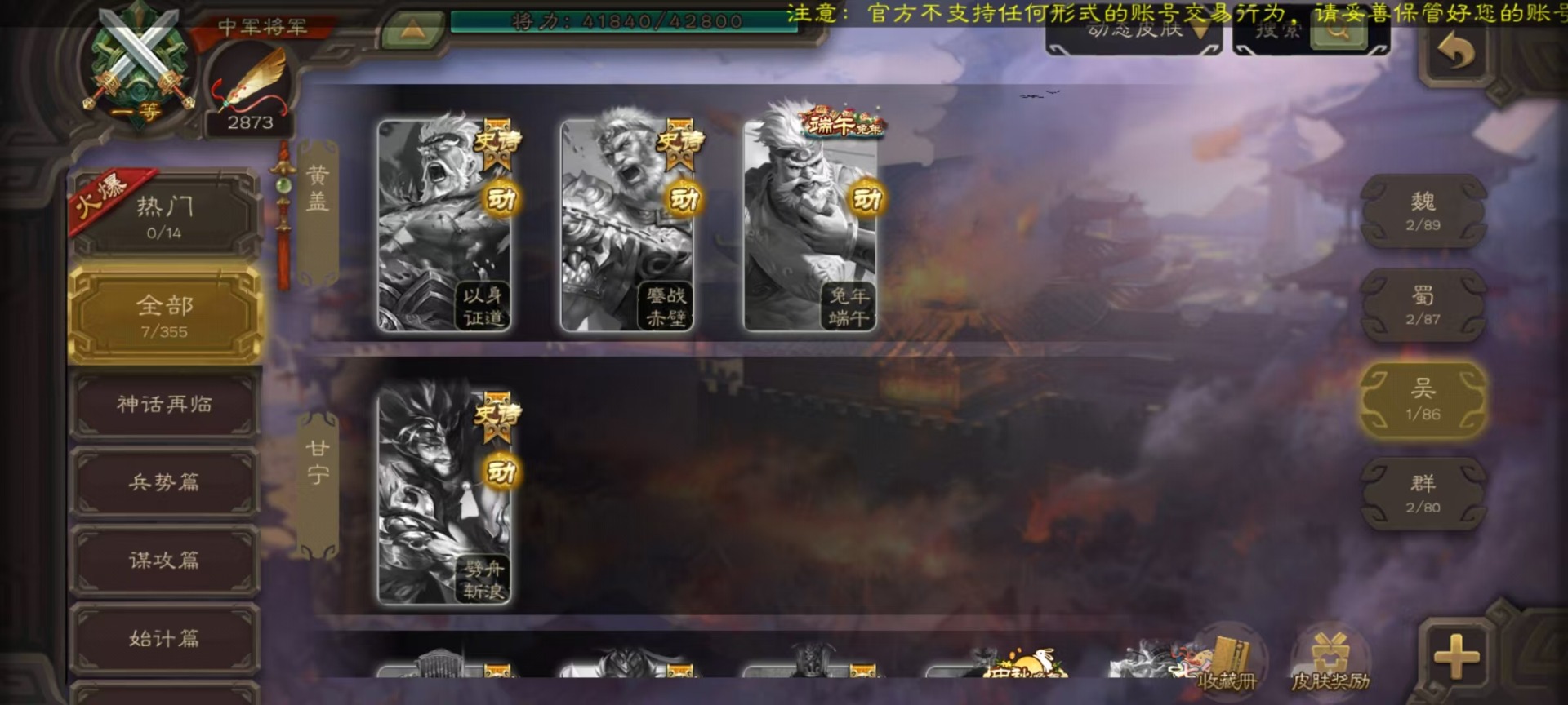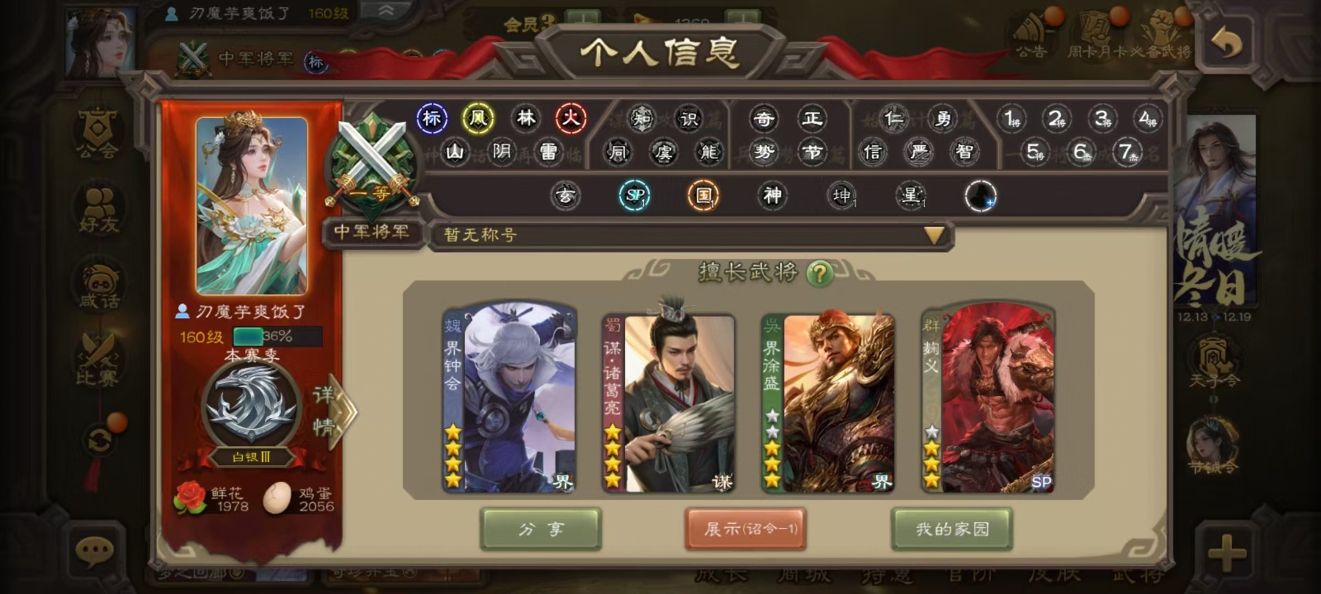 [14631164]vip3 中军将军 188武将 7动态皮肤 9史诗武将 【魏国武将】:星周不疑界钟会程昱甄姬司马懿许褚夏侯惇郭嘉曹仁曹操张辽 【蜀国武将】:谋诸葛亮谋赵云界黄忠 【吴国武将】:界徐盛 【群国武将】:星黄忠麹义