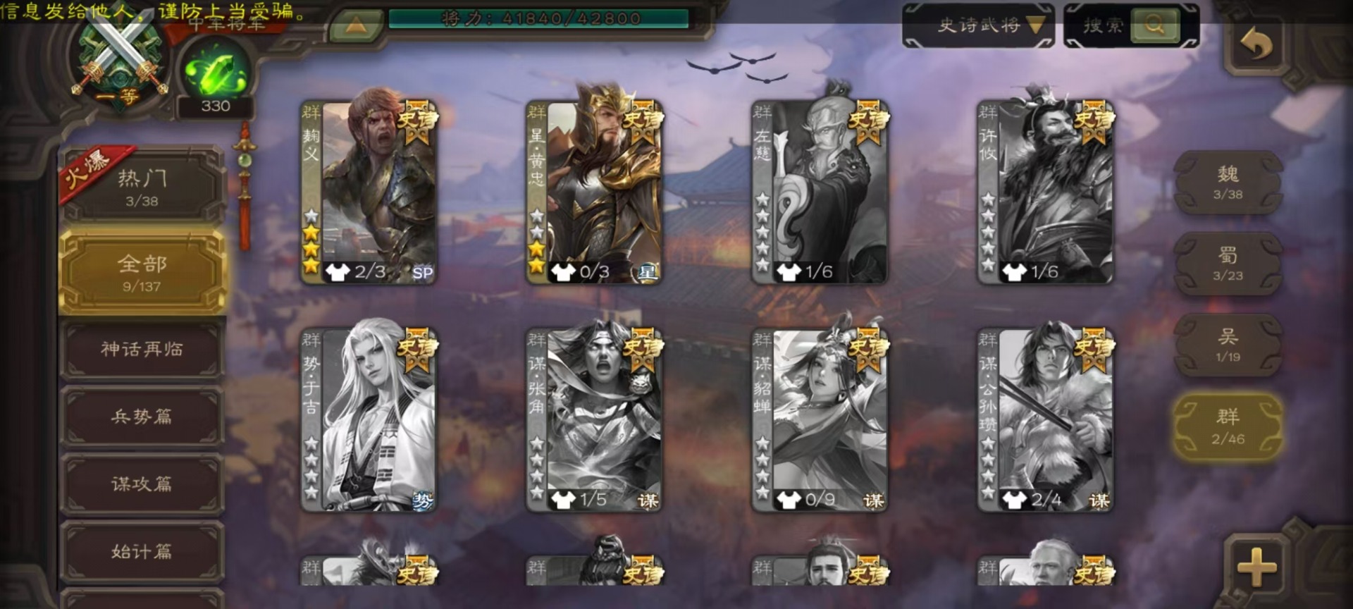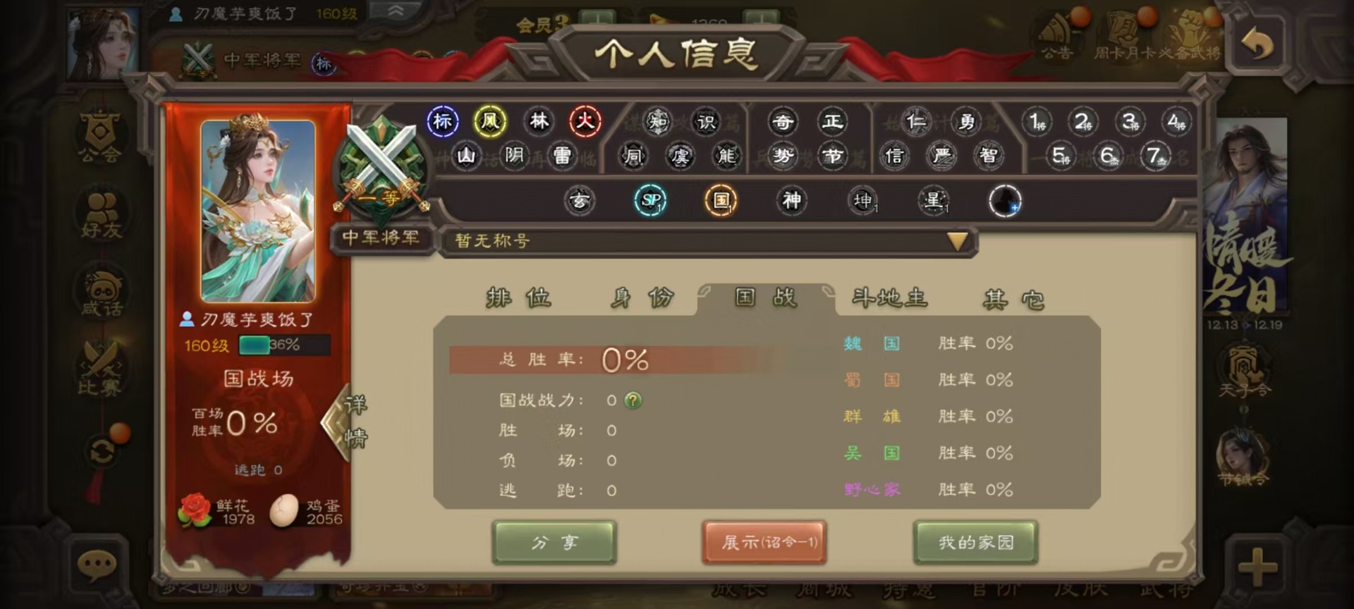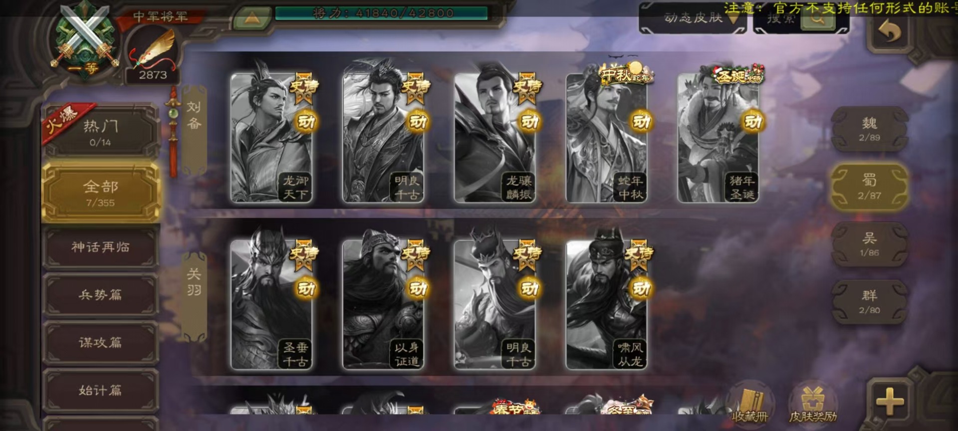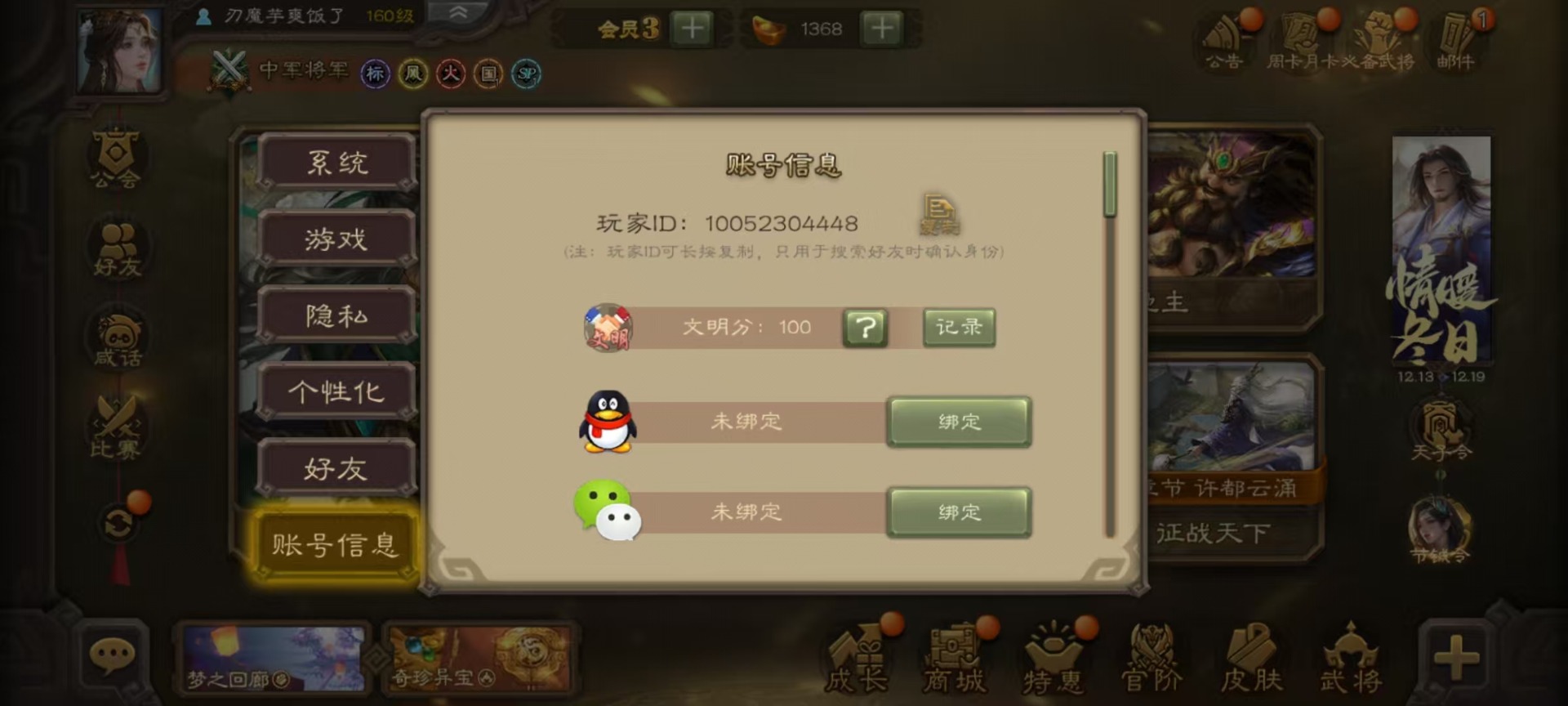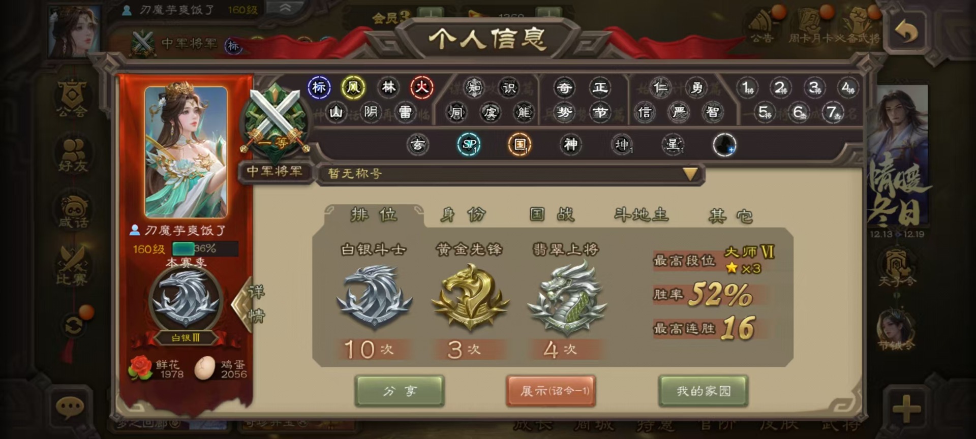 [14631164]vip3 中军将军 188武将 7动态皮肤 9史诗武将 【魏国武将】:星周不疑界钟会程昱甄姬司马懿许褚夏侯惇郭嘉曹仁曹操张辽 【蜀国武将】:谋诸葛亮谋赵云界黄忠 【吴国武将】:界徐盛 【群国武将】:星黄忠麹义
