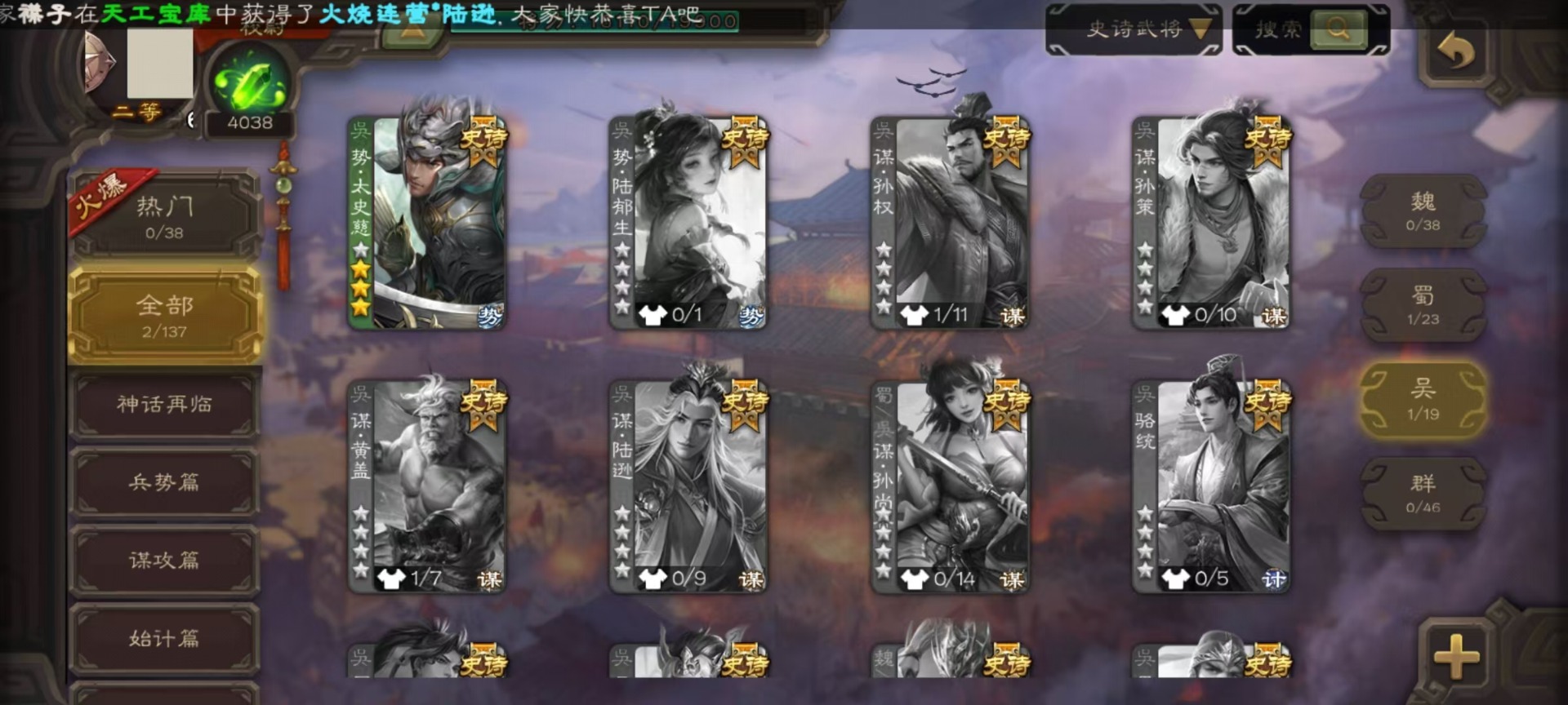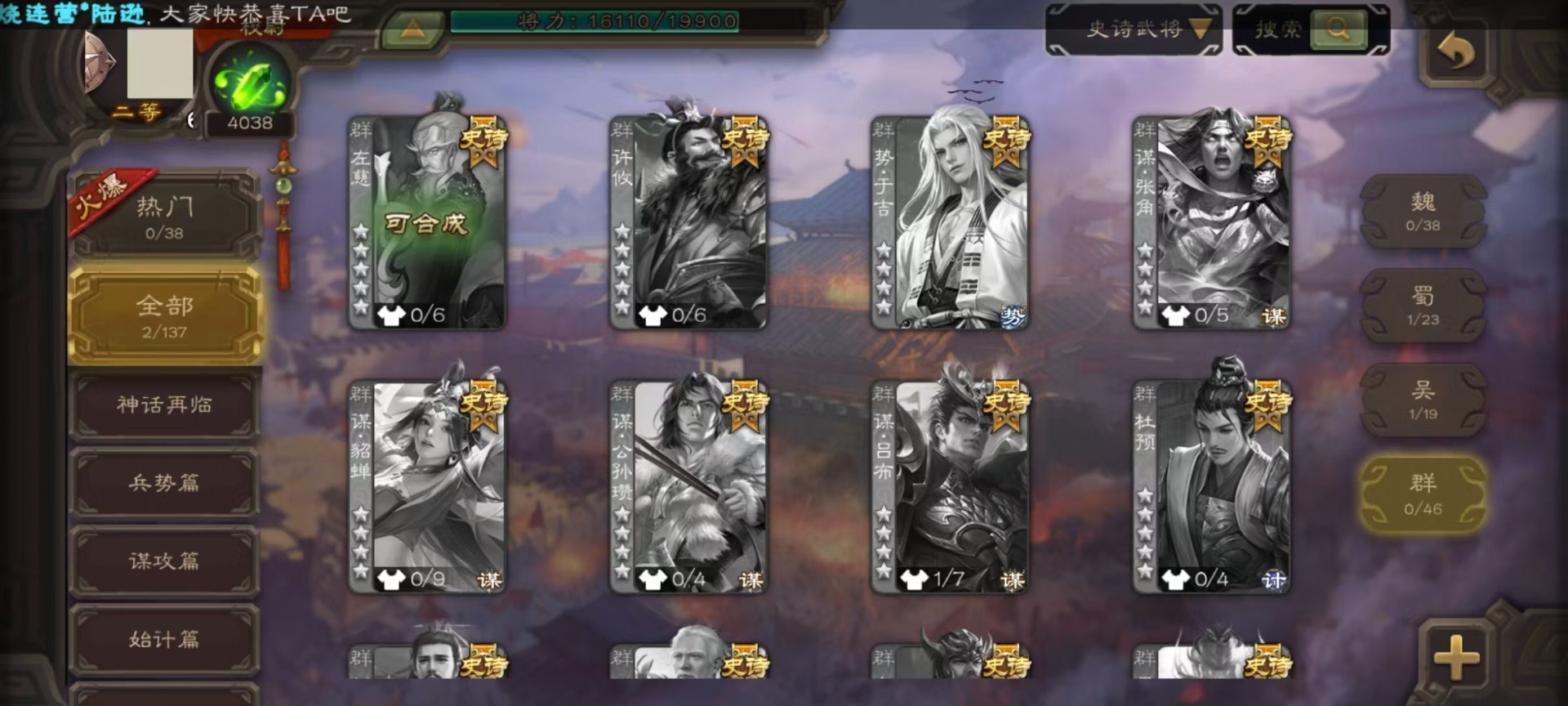 [14631269]vip0 校尉 94武将 1动态皮肤 2史诗武将 势太史慈单号 【魏国武将】:甄姬司马懿许褚夏侯惇郭嘉曹仁曹操张辽 【蜀国武将】:谯周 【吴国武将】:势太史慈