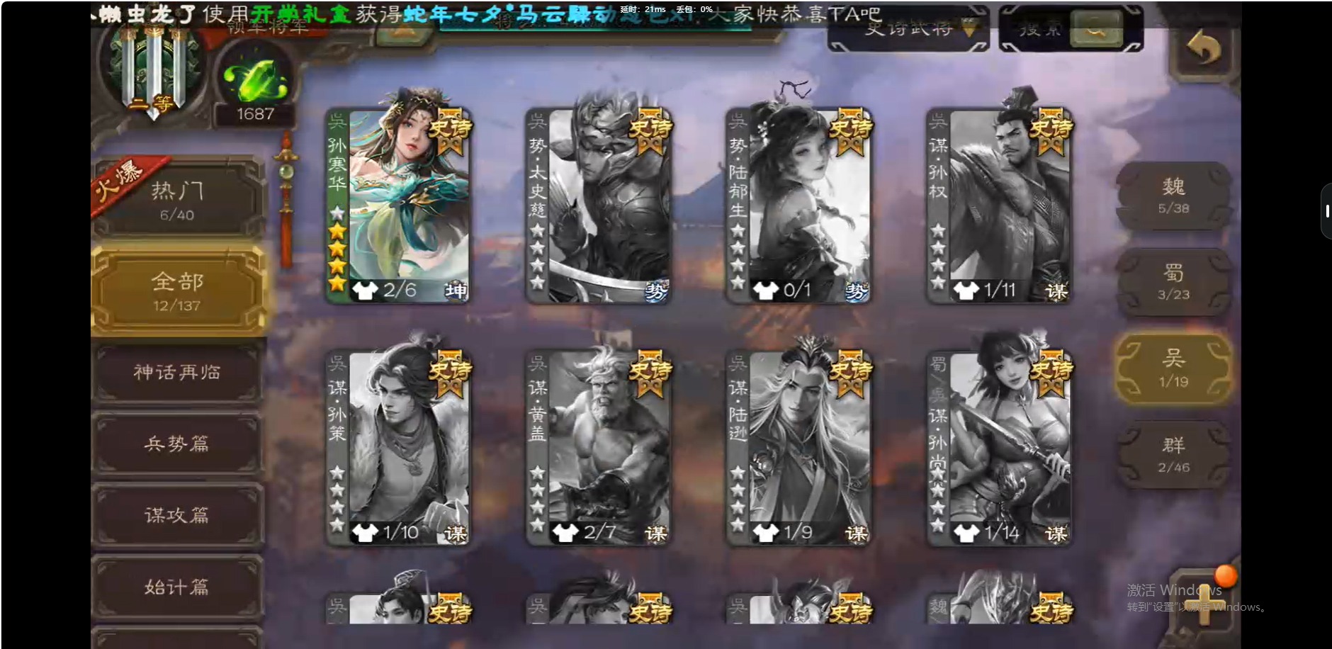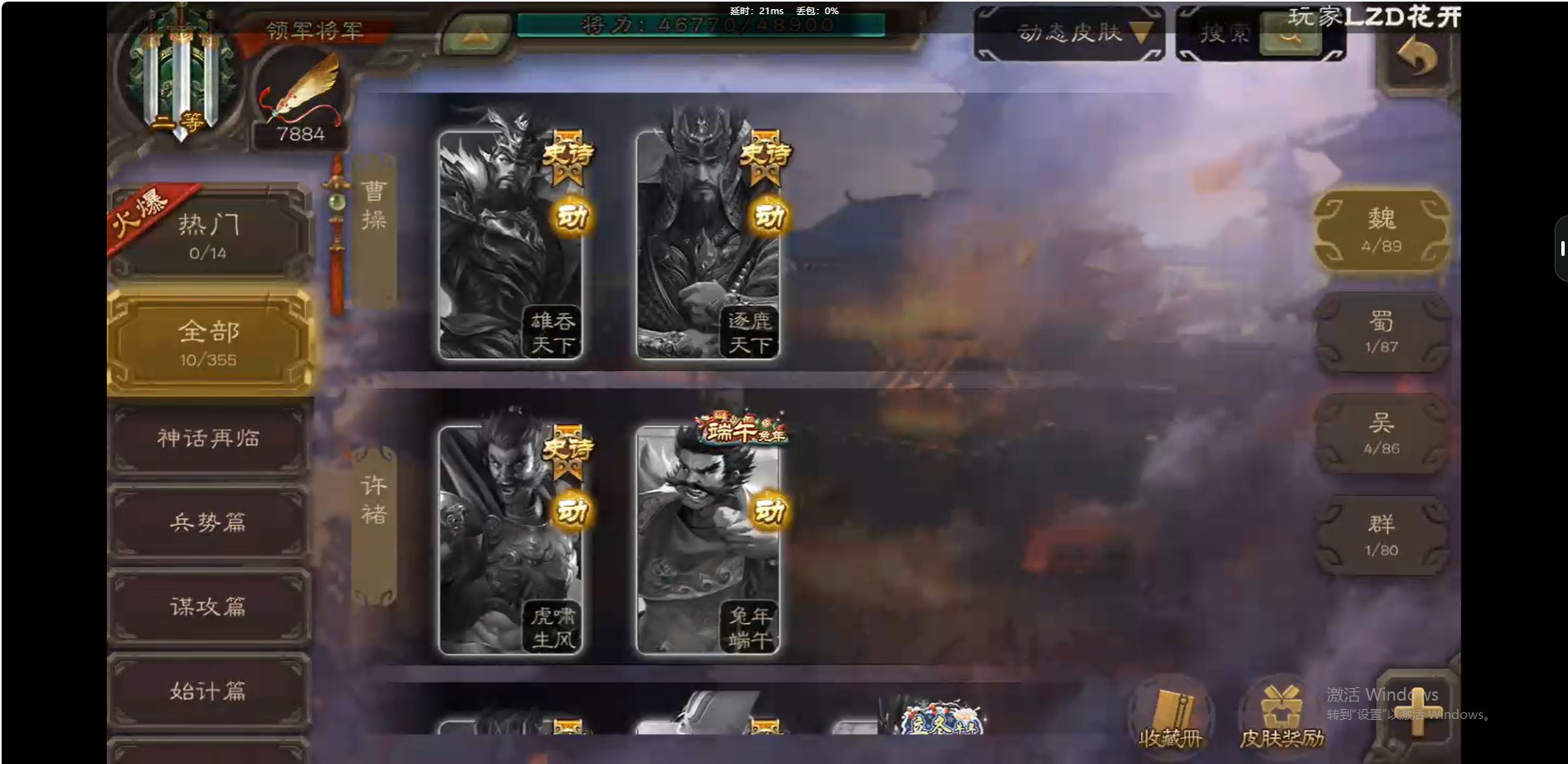 [14631285]vip6 领军将军 207武将 10动态皮肤 12史诗武将 【神将】:神司马懿 【魏国武将】:界钟会程昱曹婴曹纯戏志才 【蜀国武将】:谋赵云谯周谋关羽 【吴国武将】:孙寒华 【群国武将】:星董卓谋张角