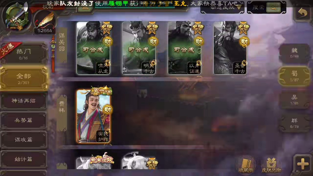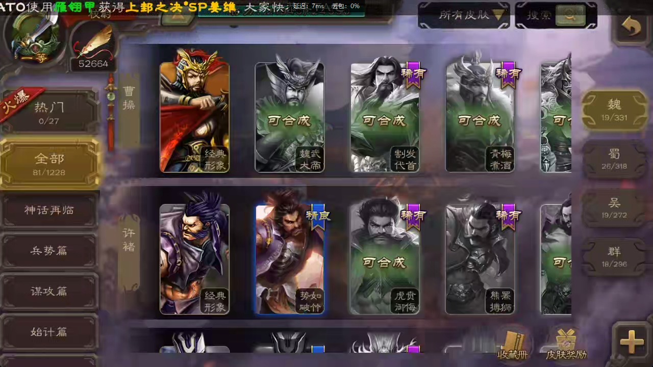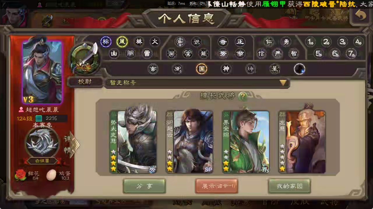 [14632200]vip3 校尉 136武将 2动态皮肤 2史诗武将 【魏国武将】:甄姬司马懿许褚夏侯惇郭嘉曹仁曹操张辽 【吴国武将】:势太史慈 【群国武将】:左慈